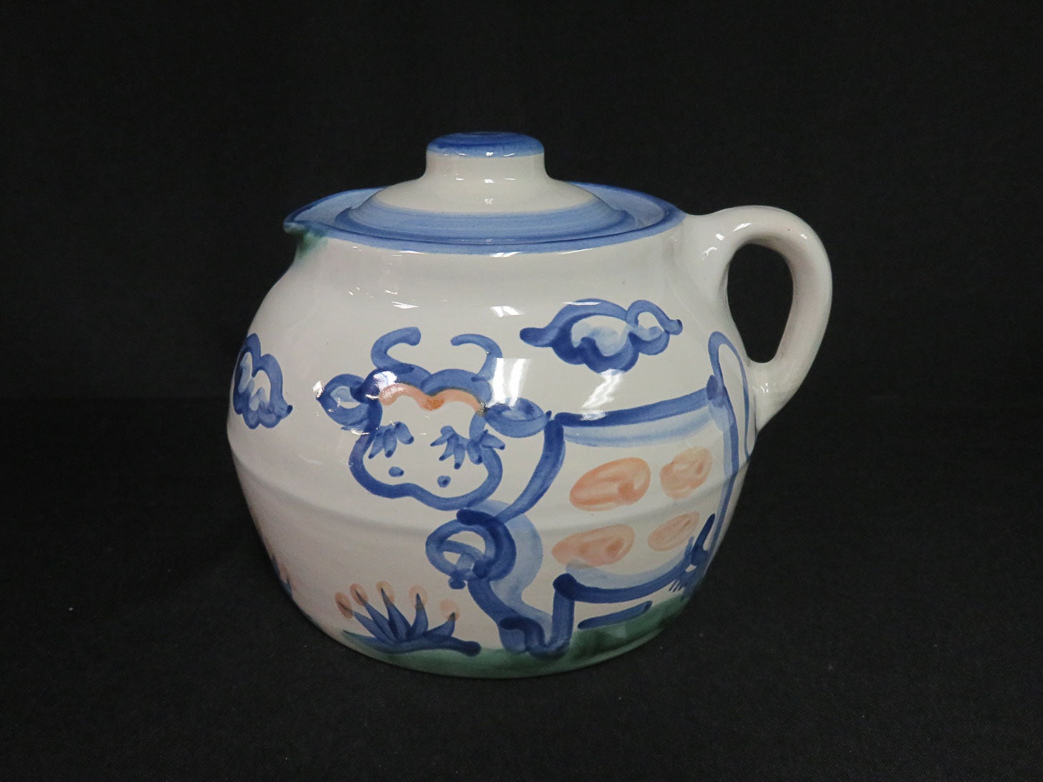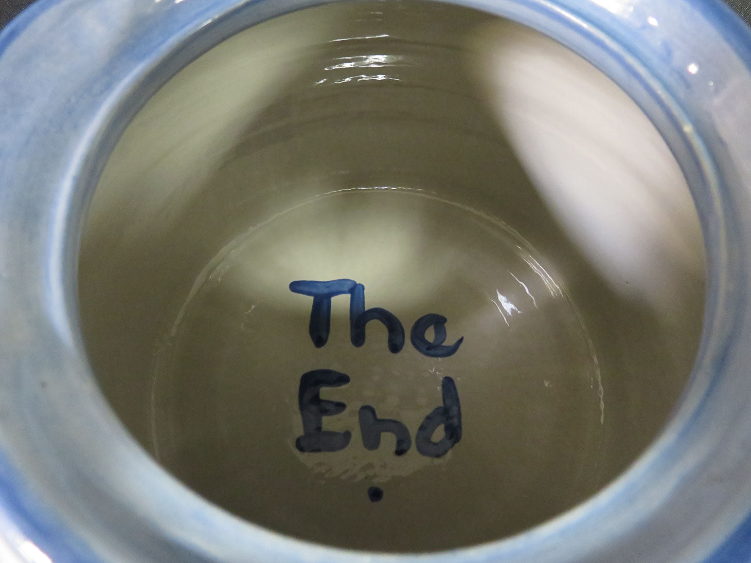 Large round, cow and clouds, "The End" on the inside, one handle, lid, 2 piece