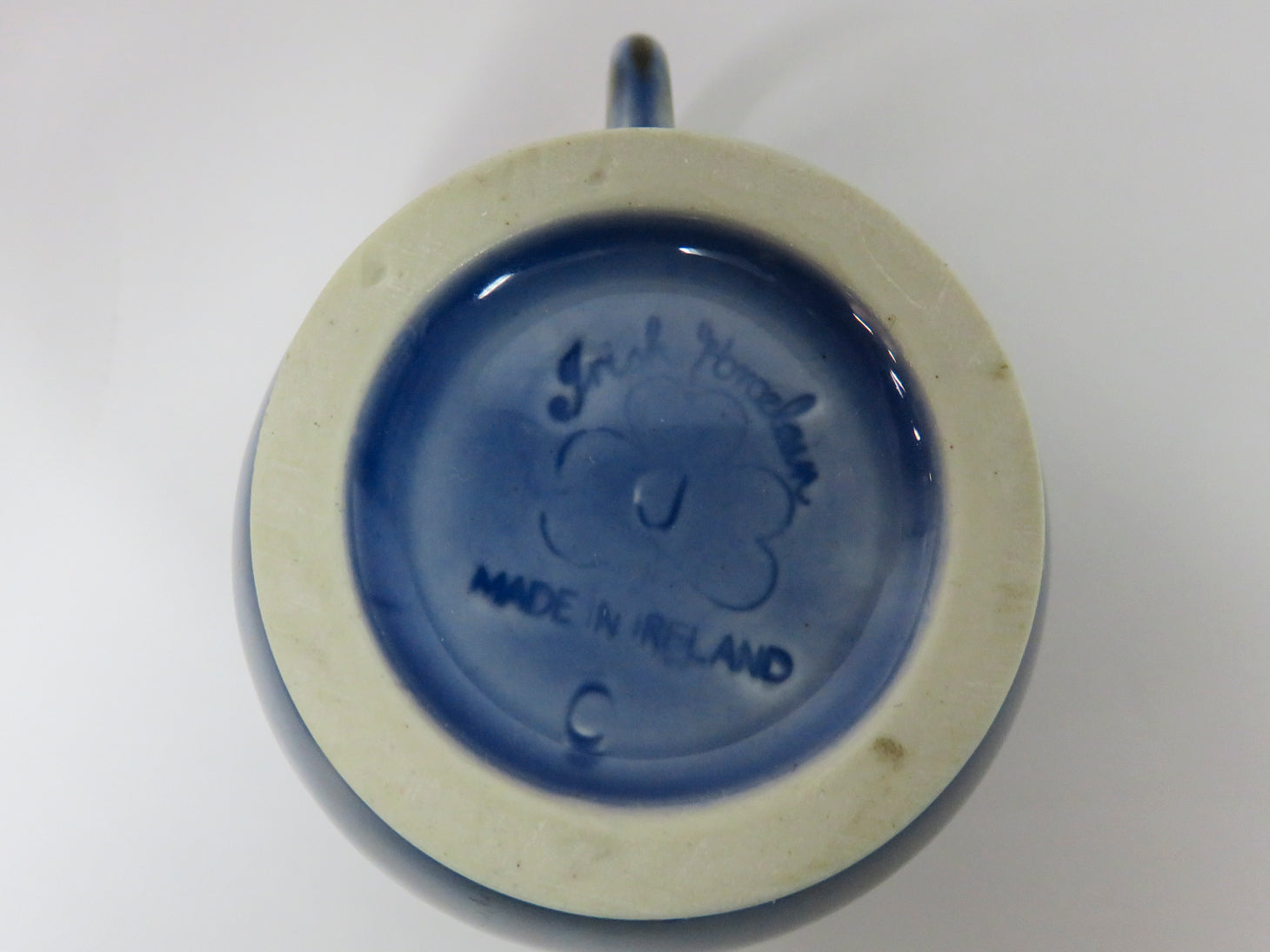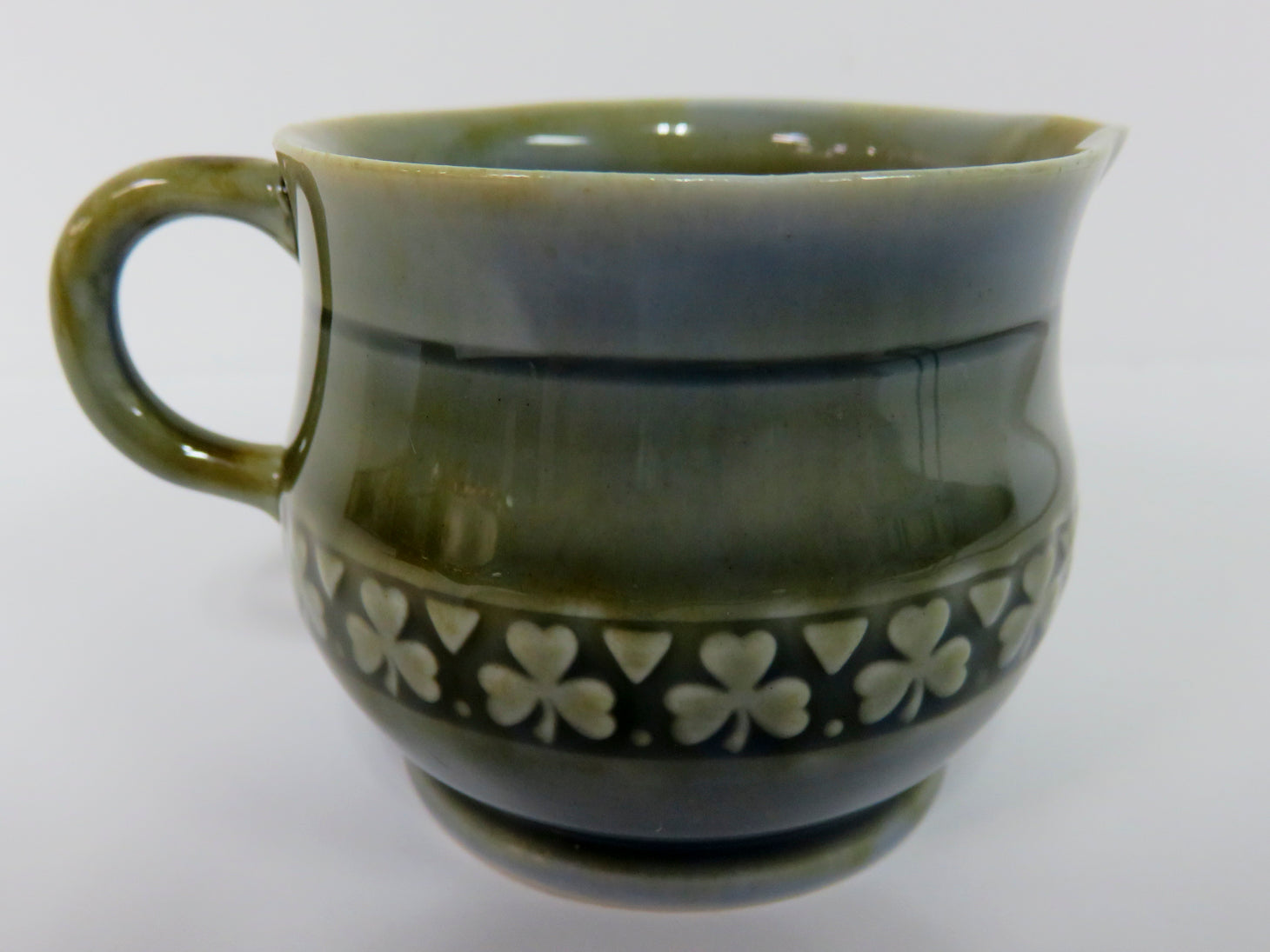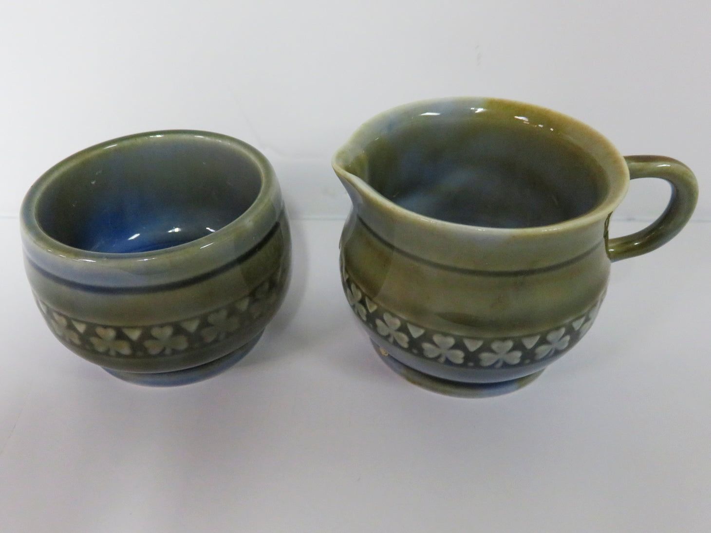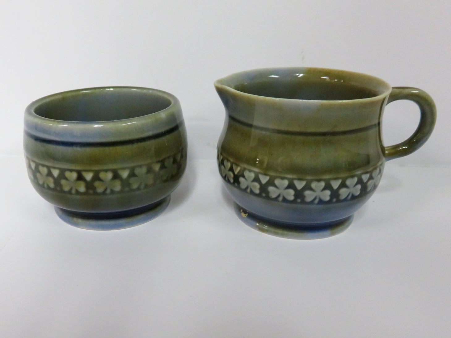 Item Number: 8936-518 Wade Irish Porcelain cream and open sugar. Mottled blue and green glaze and center band of shamrocks. 2.5" x 2" H