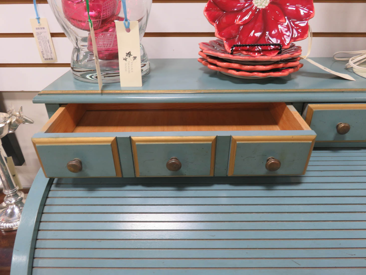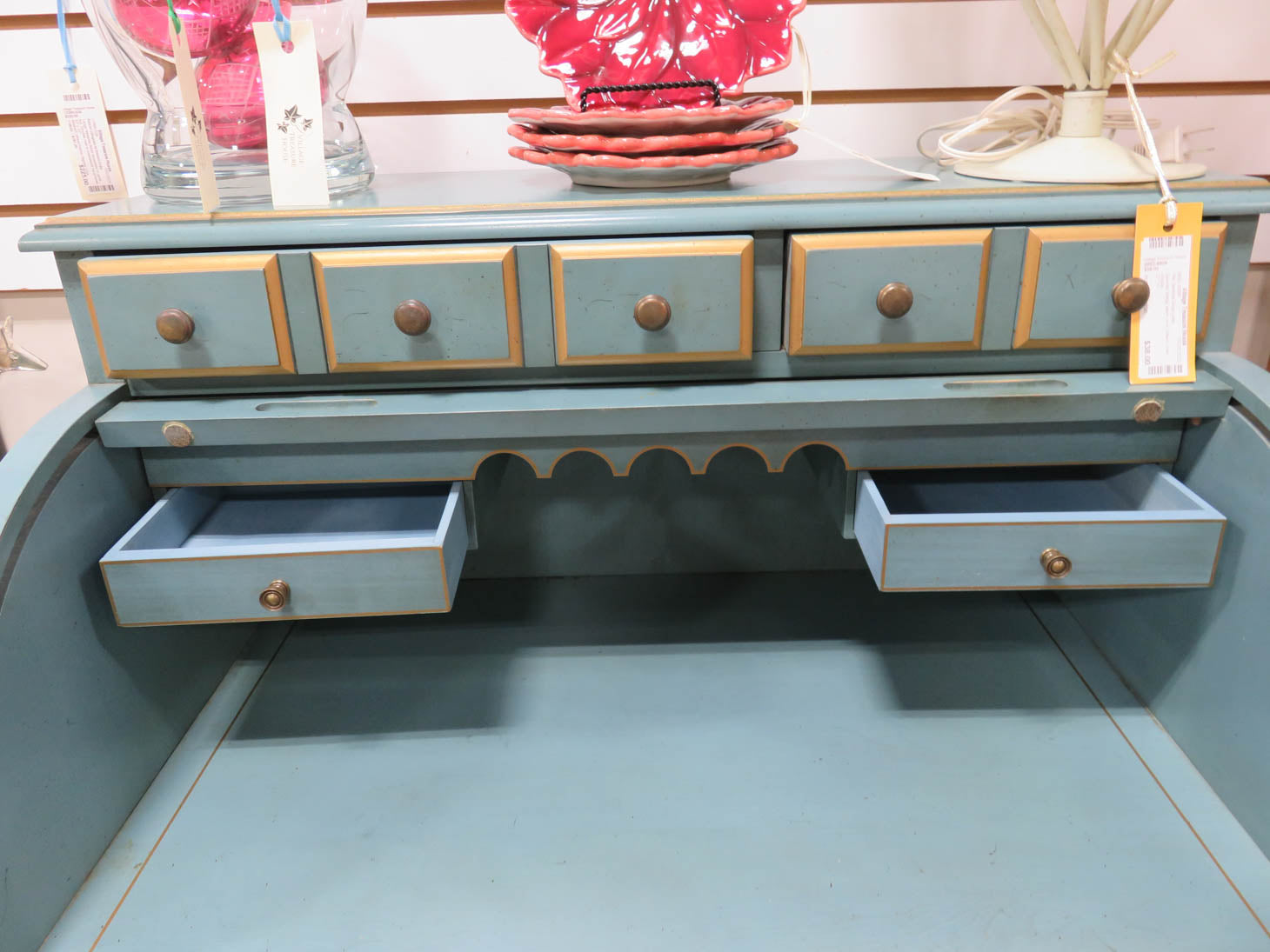Five drawers on top, roll top reveals interior writing surface and additional drawers.  Turned legs with metal hardware and gold trim. Light wear.