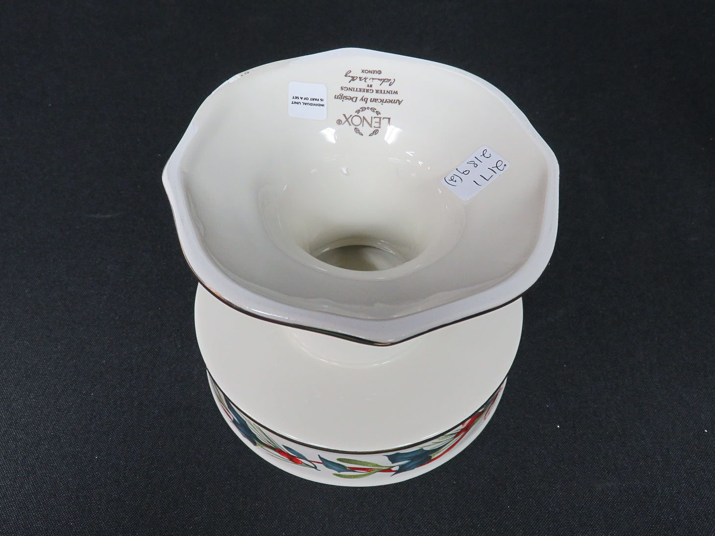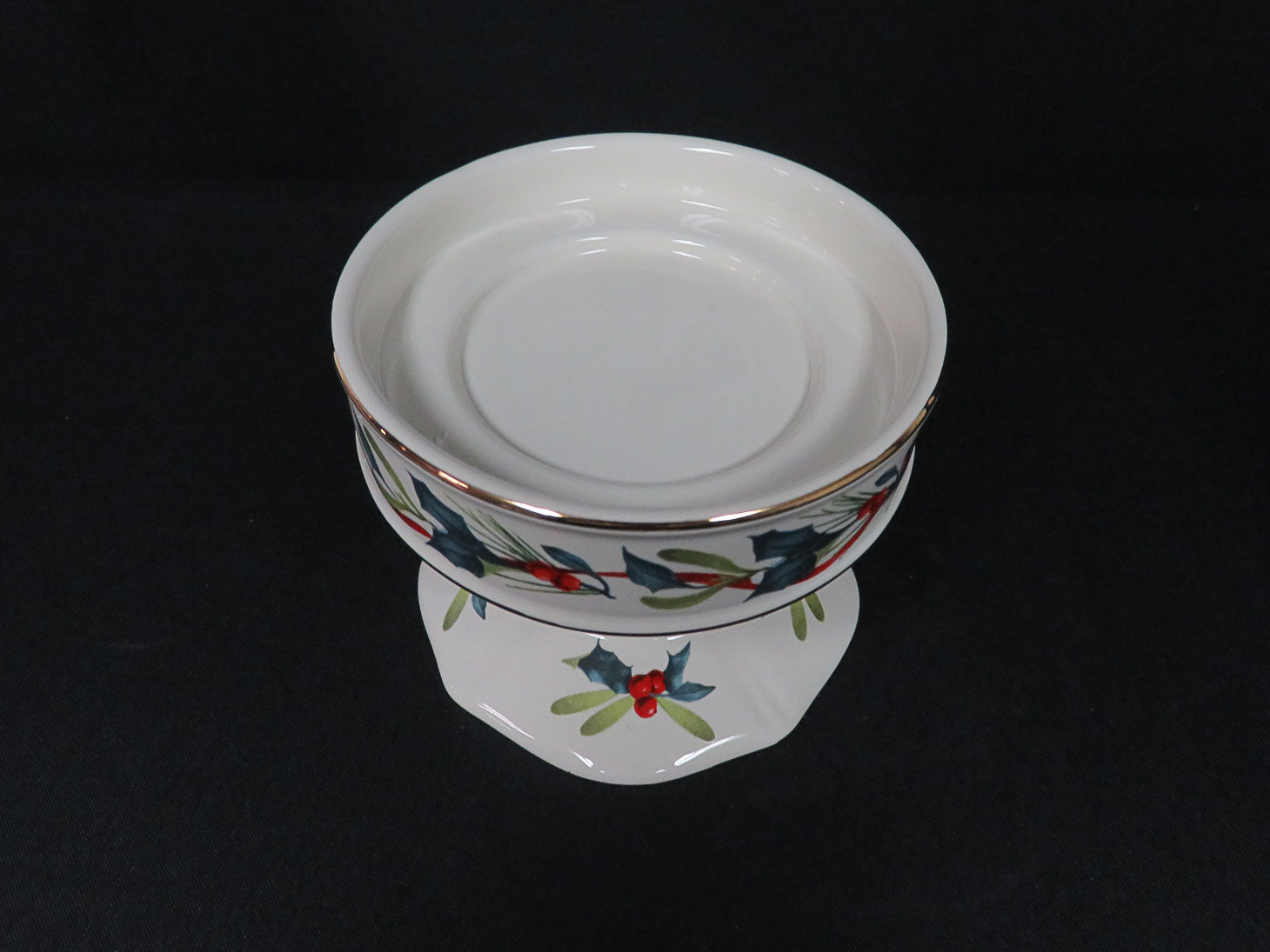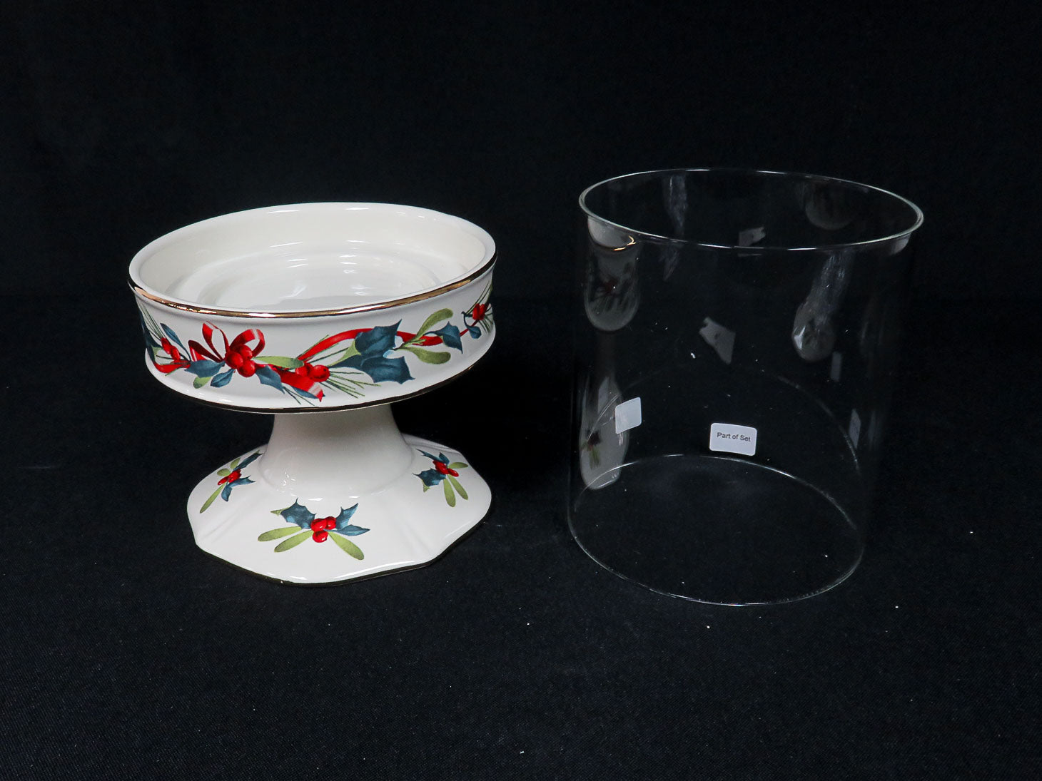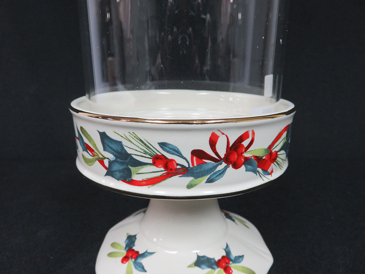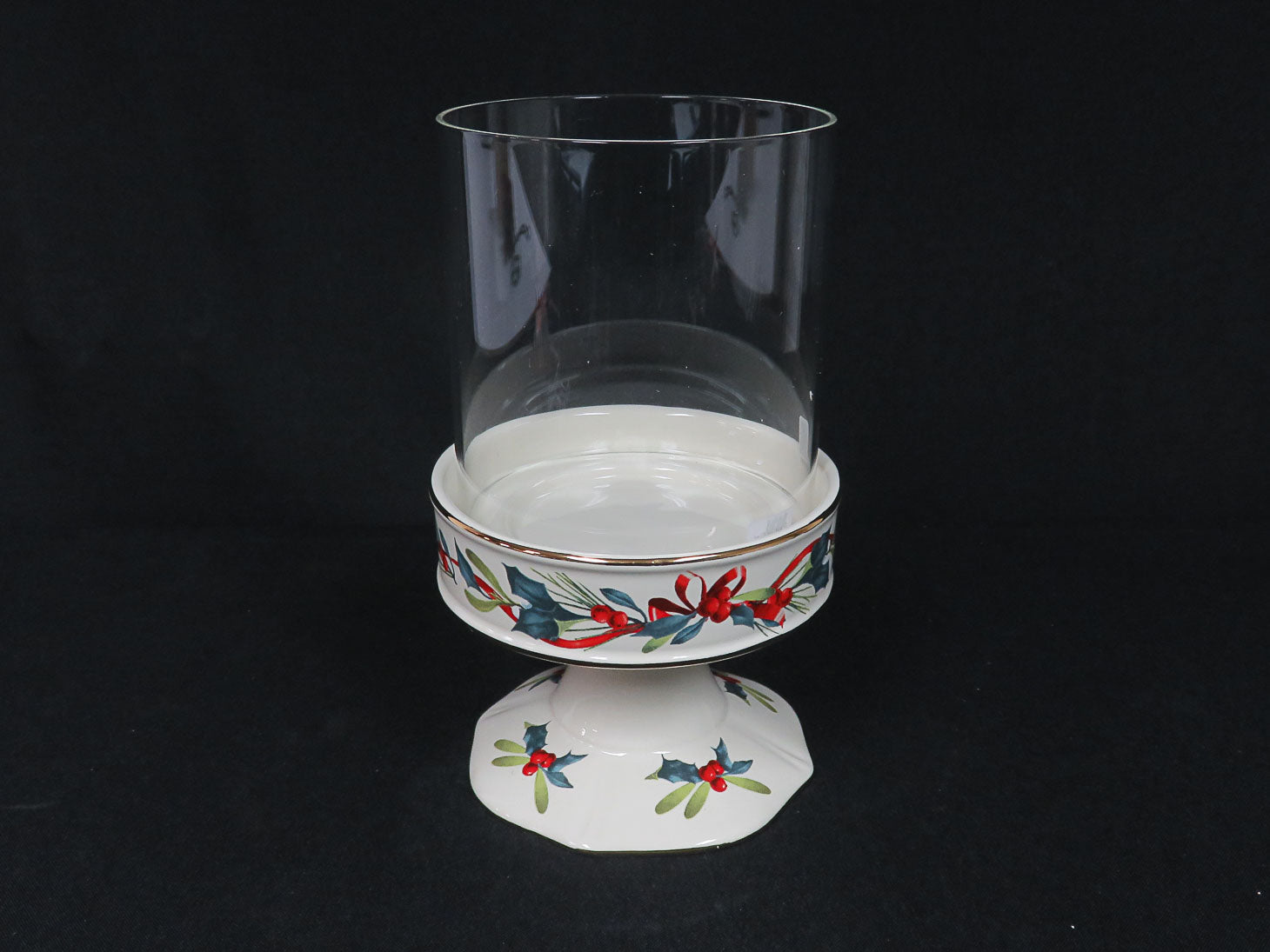 "Winter Greetings" pedestal base cream with blue holly leaves ad red bows, glass hurricane, 2 pcs