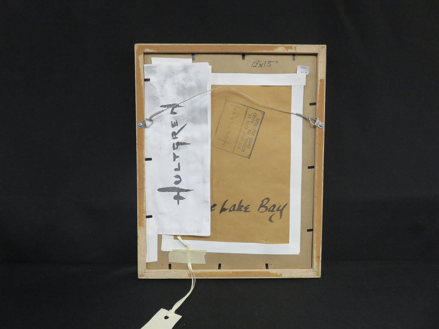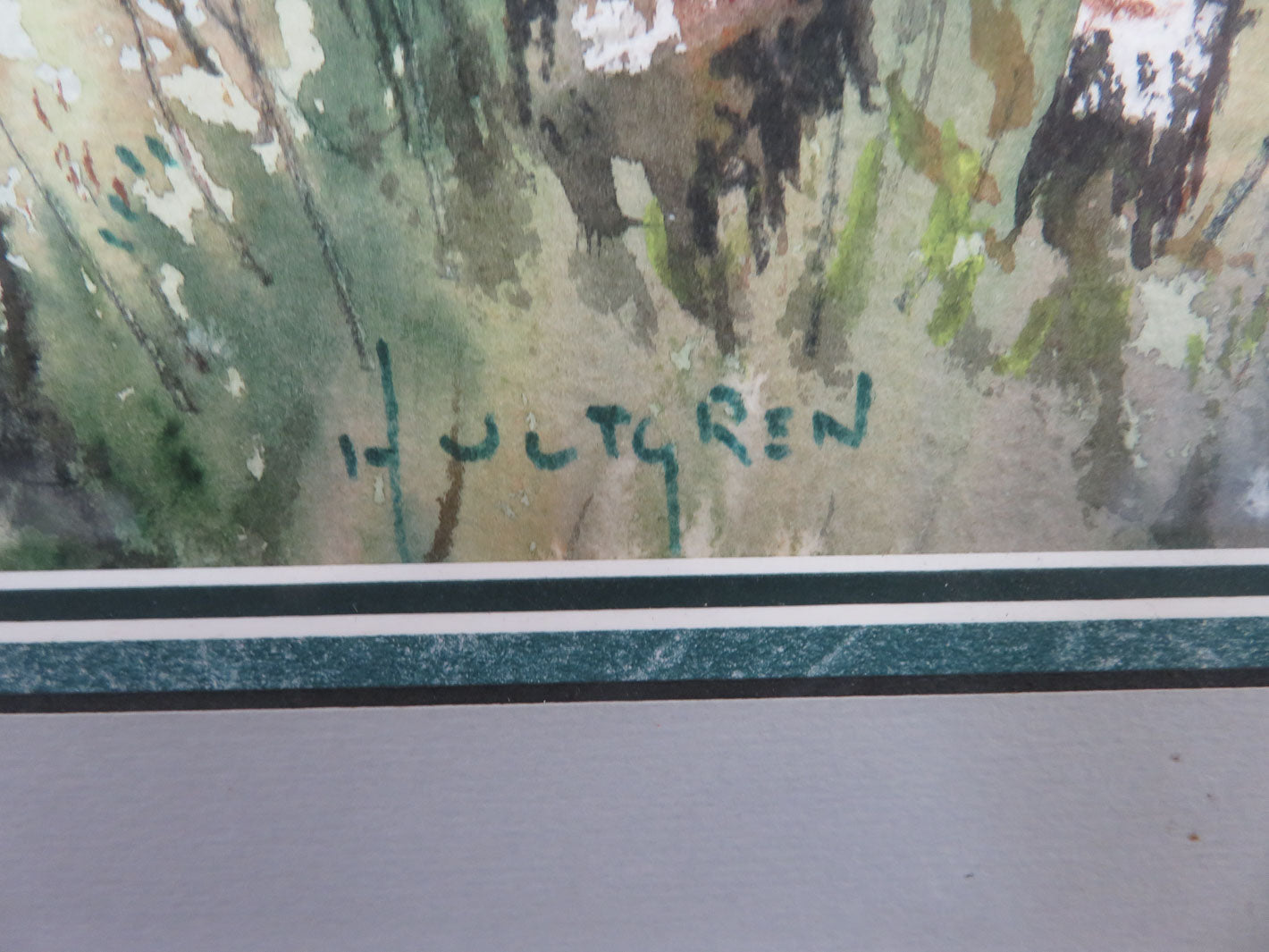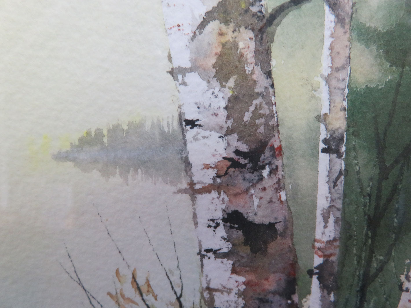 Birch trees by a lake in light wood frame, signed by Herb Hultgren