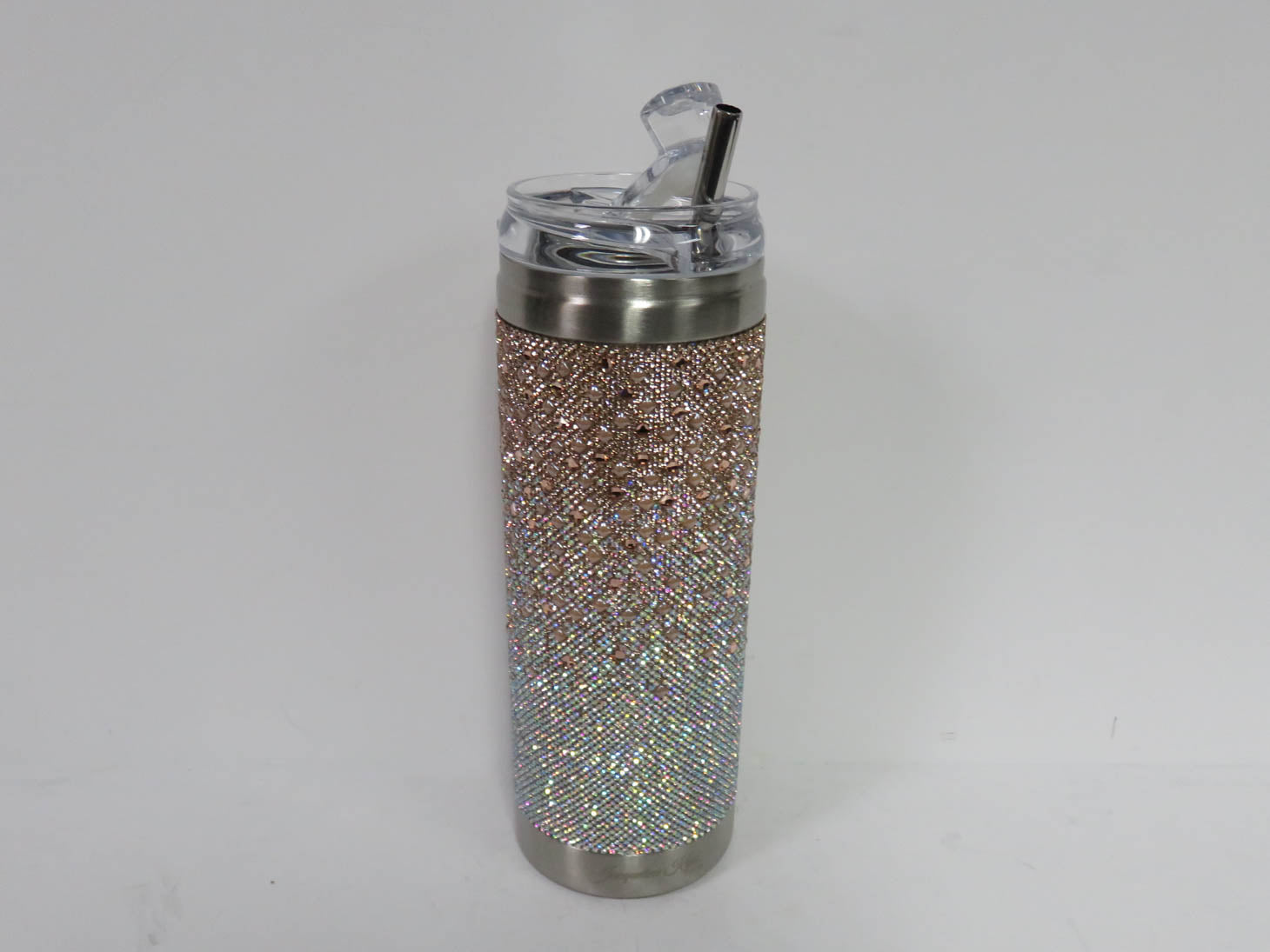 By Jacqueline Kent, champagne rhinestones, stainless steel, vacuum seal, metal straw and lid (3 pieces) 8.75"H