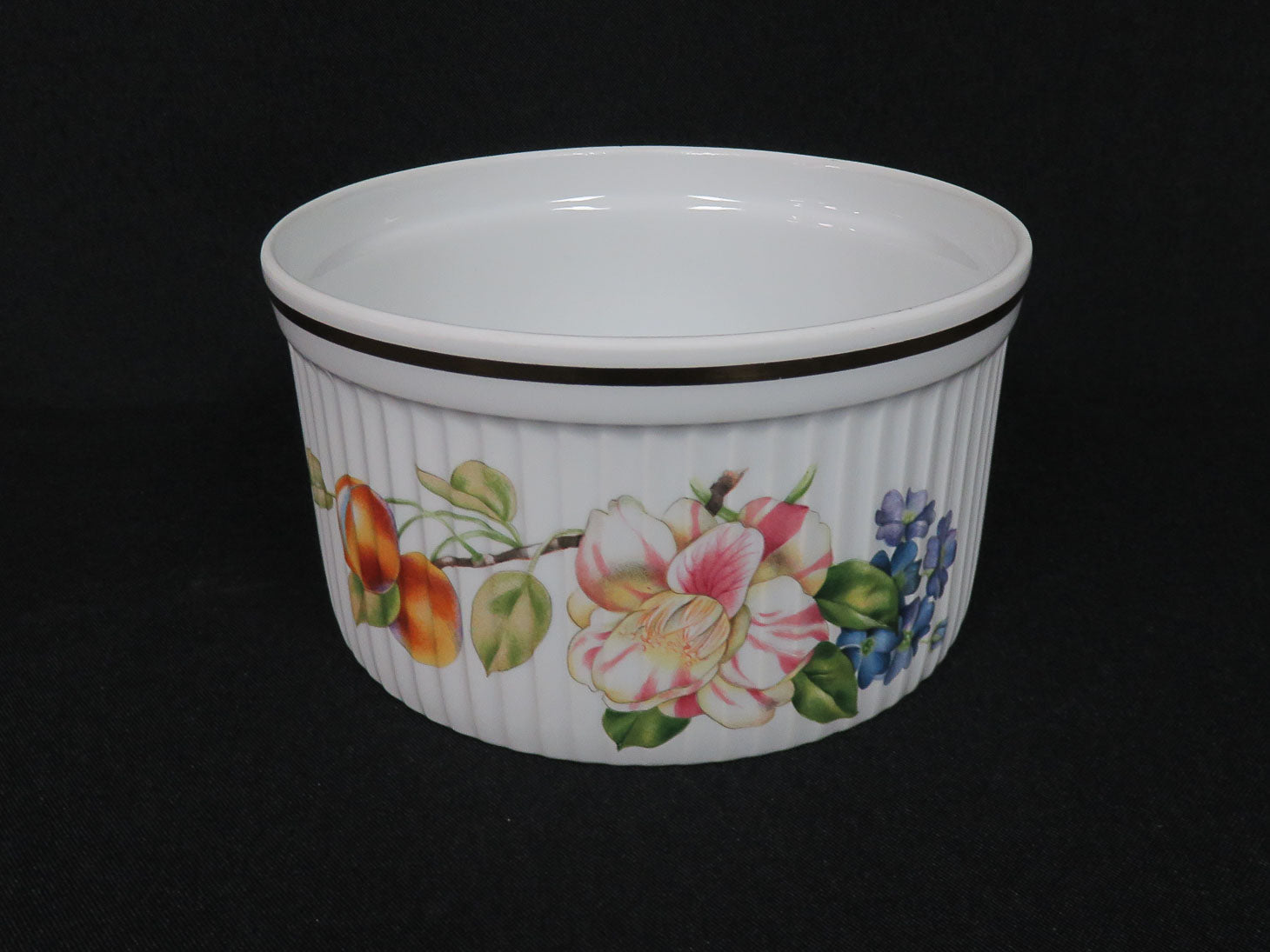 "Pershore", White ribbed with fruit and floral pattern, gold band.