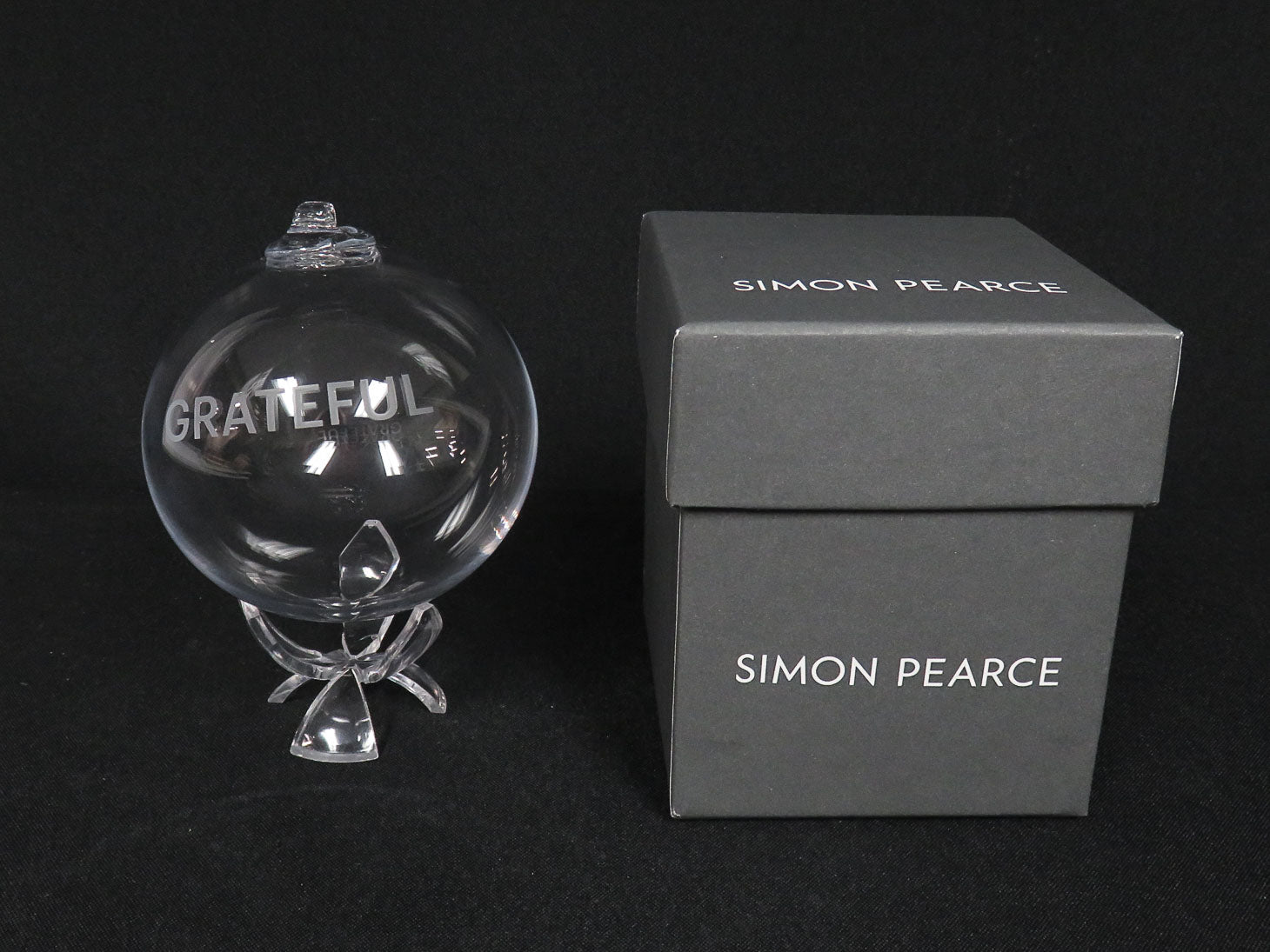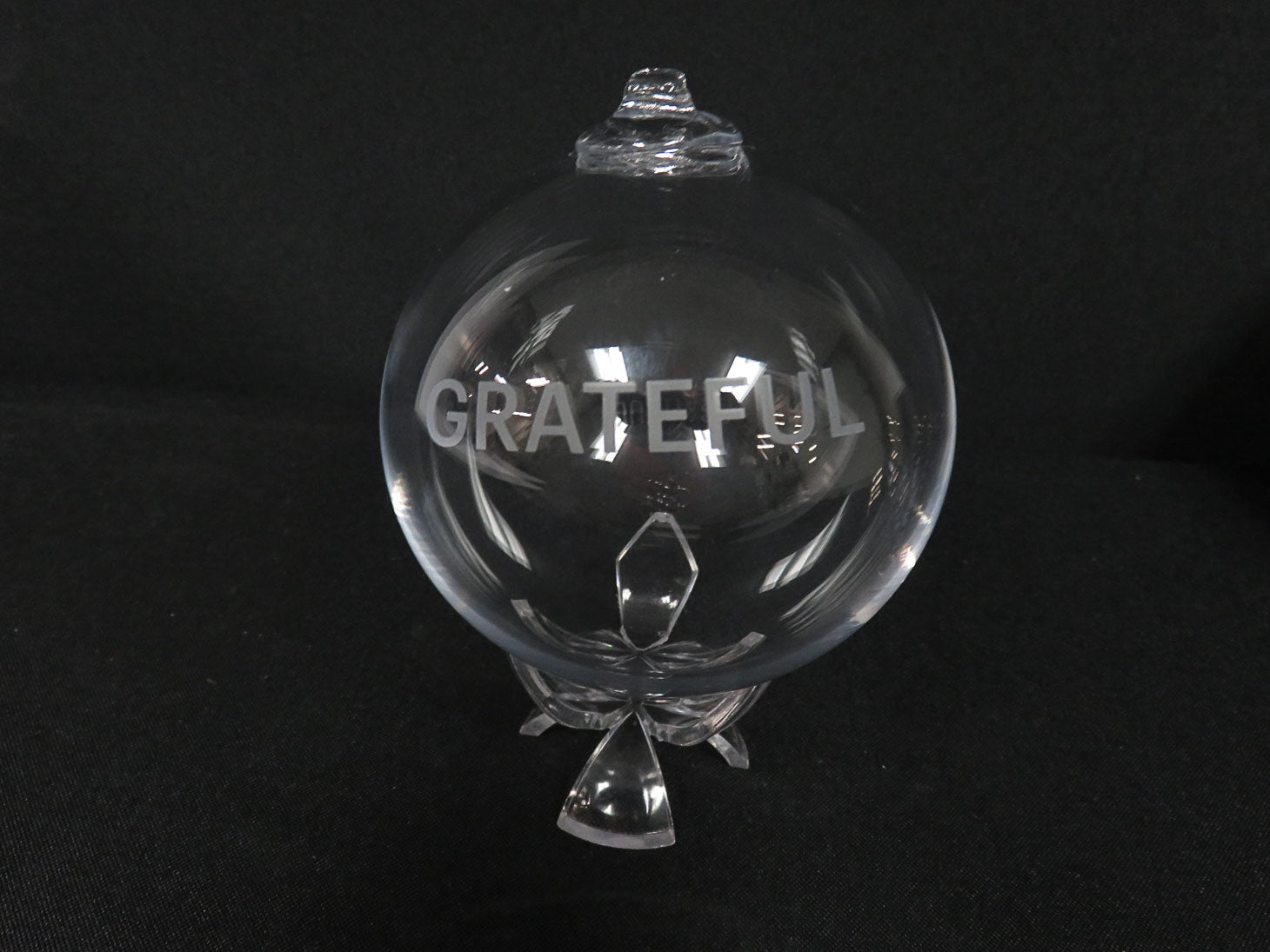 Clear glass orb with "Grateful" etched on ornament. In original box.