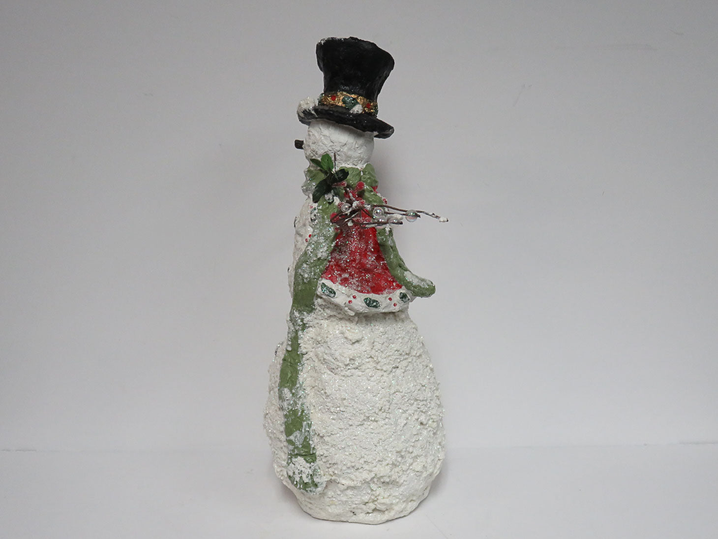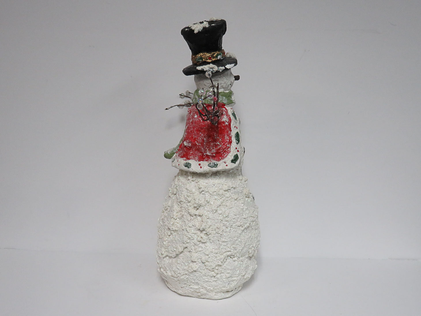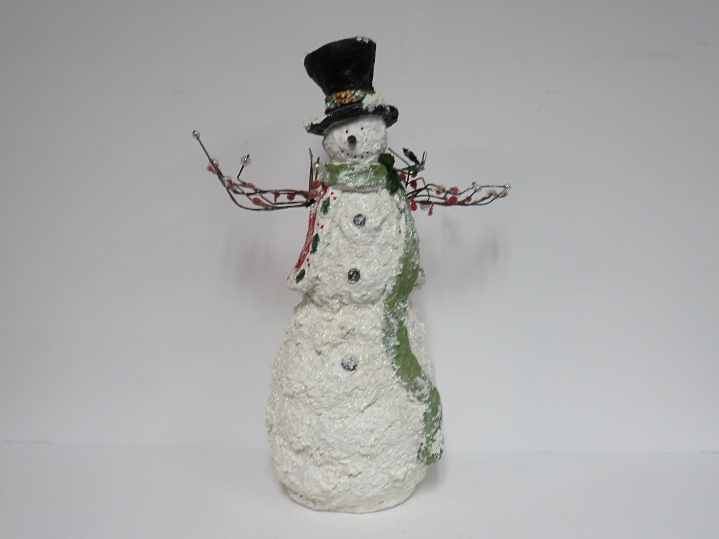 Glittery texture with twig and holly berry arms. Has a red jacket, black hat and long green scarf.