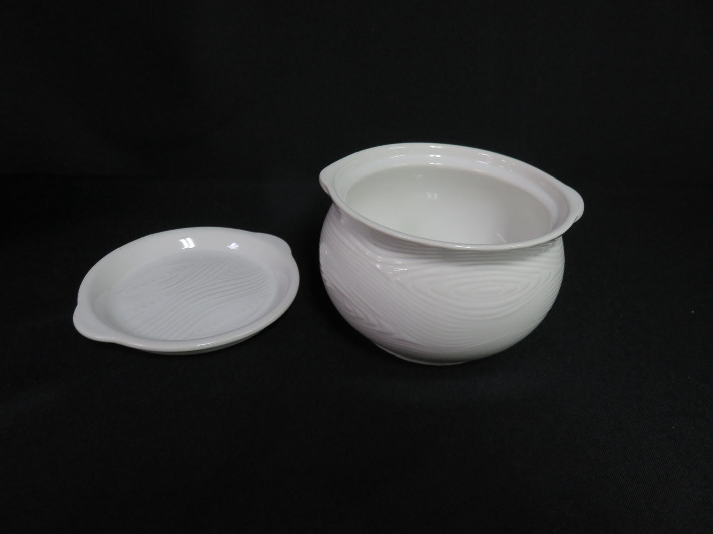 Item Number: 8936-507 Set of 4, white wood textured bowls with lids in a wire caddy. By Temptations by Tara 5" x 3.5"each, 14"H stacked