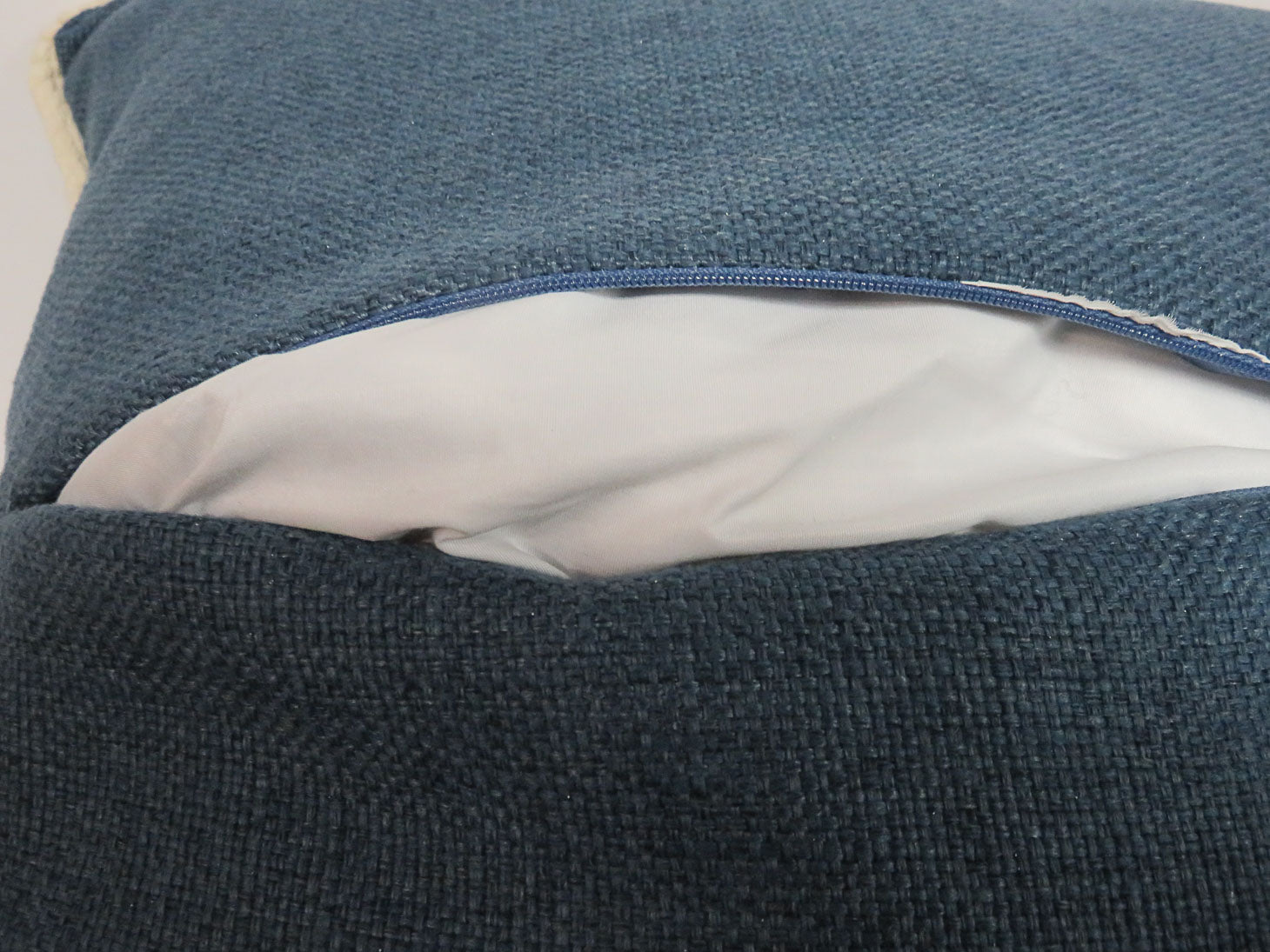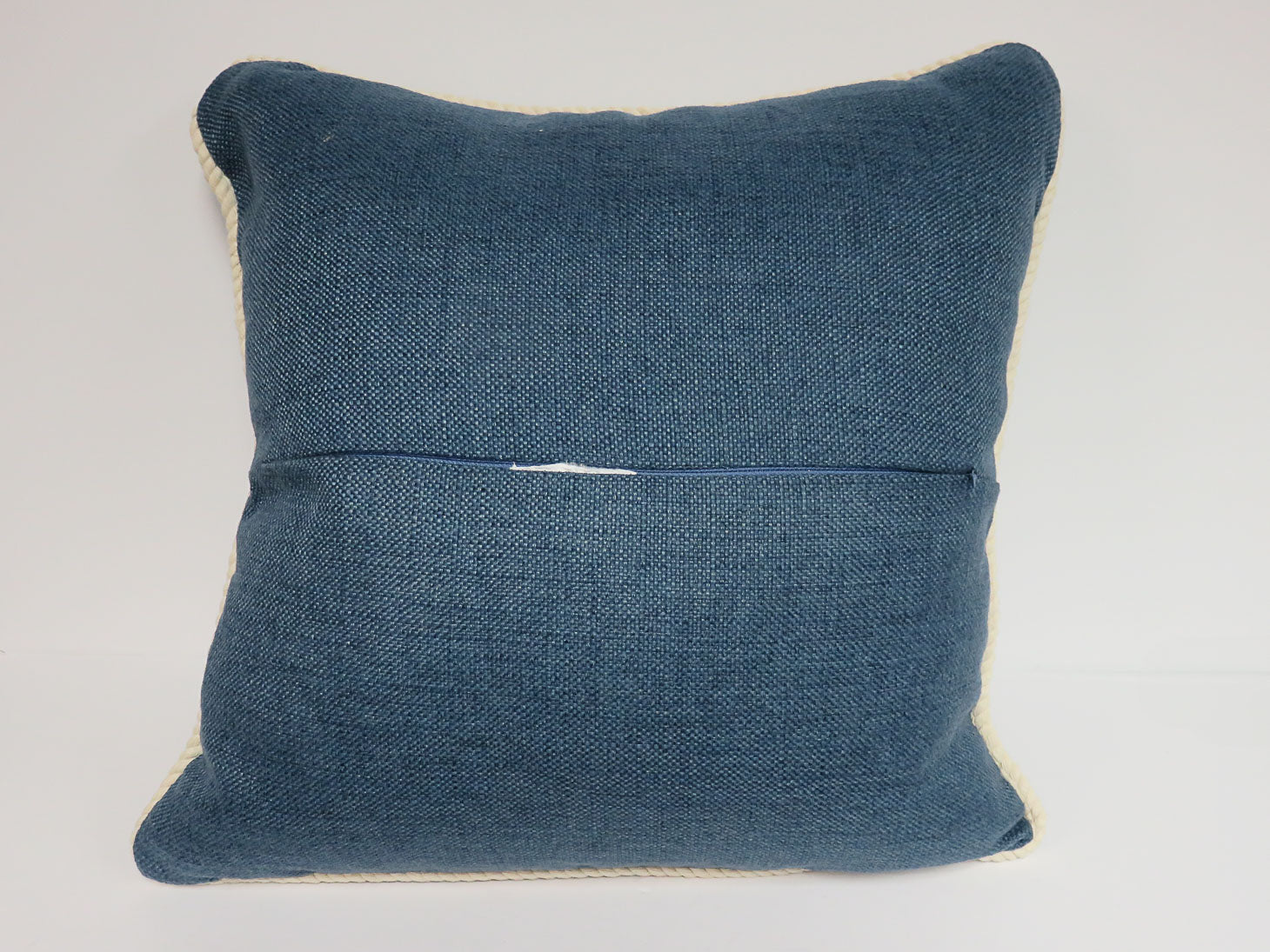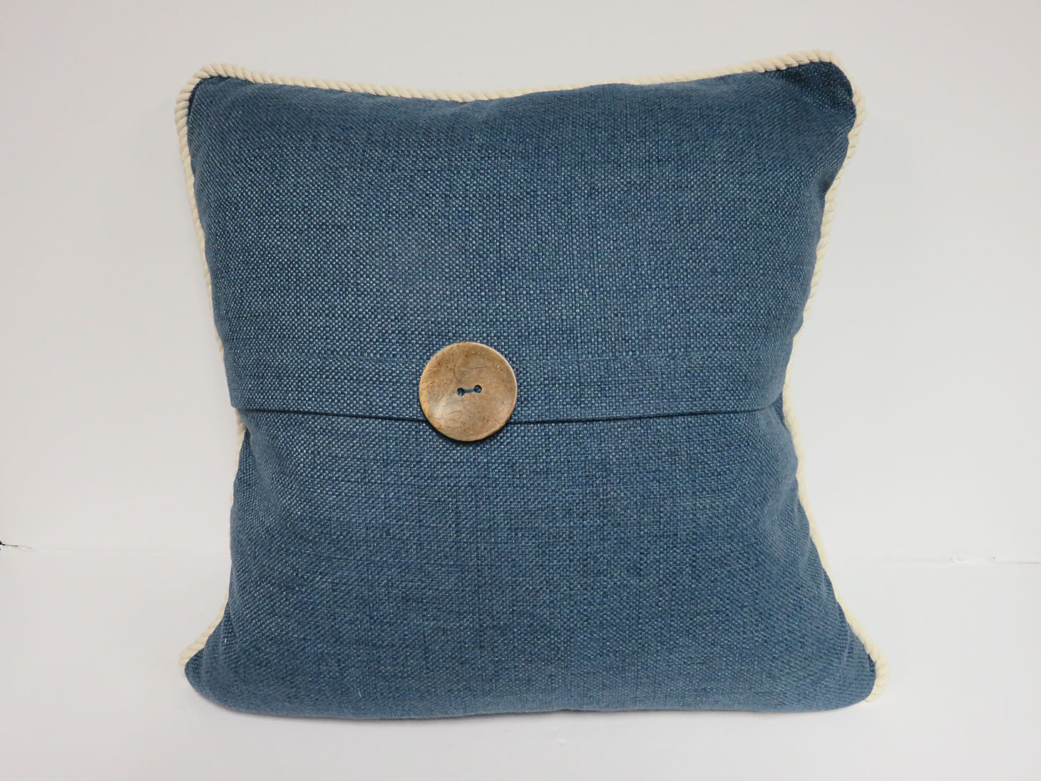 White corded piping with wooden button accent. Zippered and feather filled. Two available. Sold separately. 442-705.