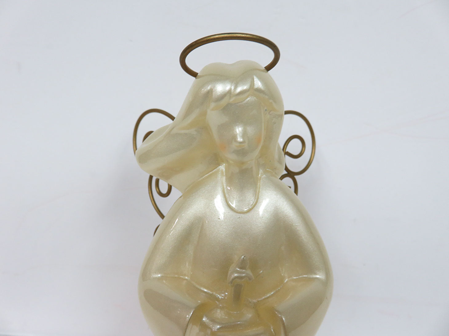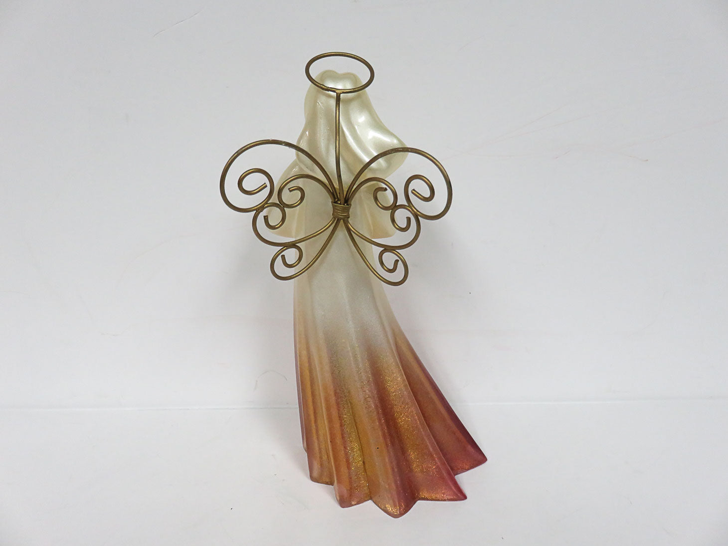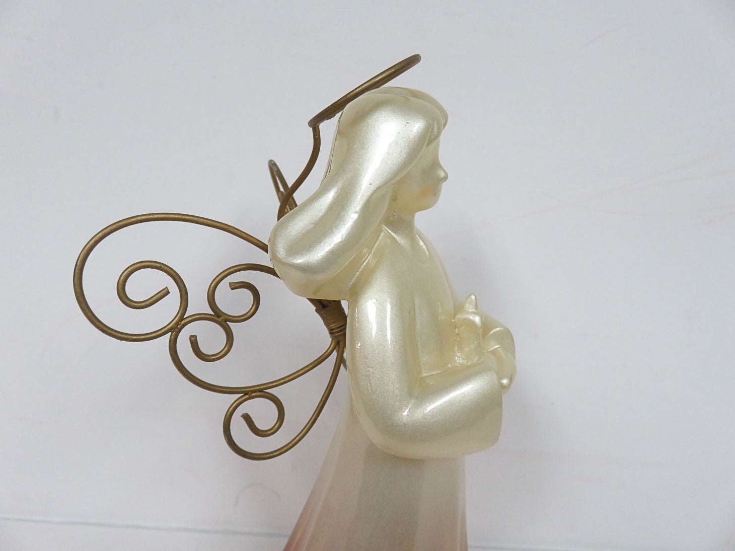 Set of 3, gold metal scrolled wings, cream dress with iridescent pink/gold bottom