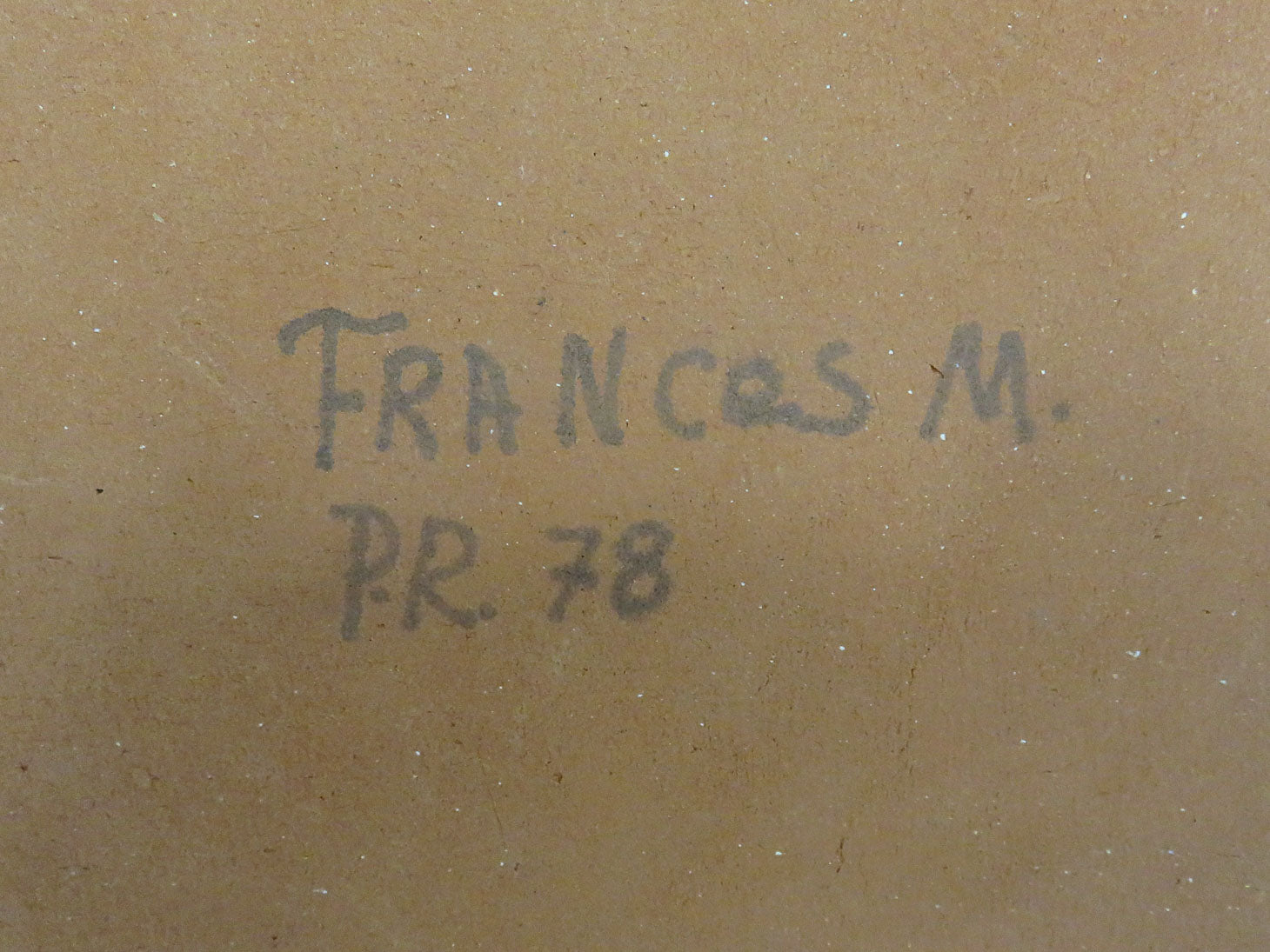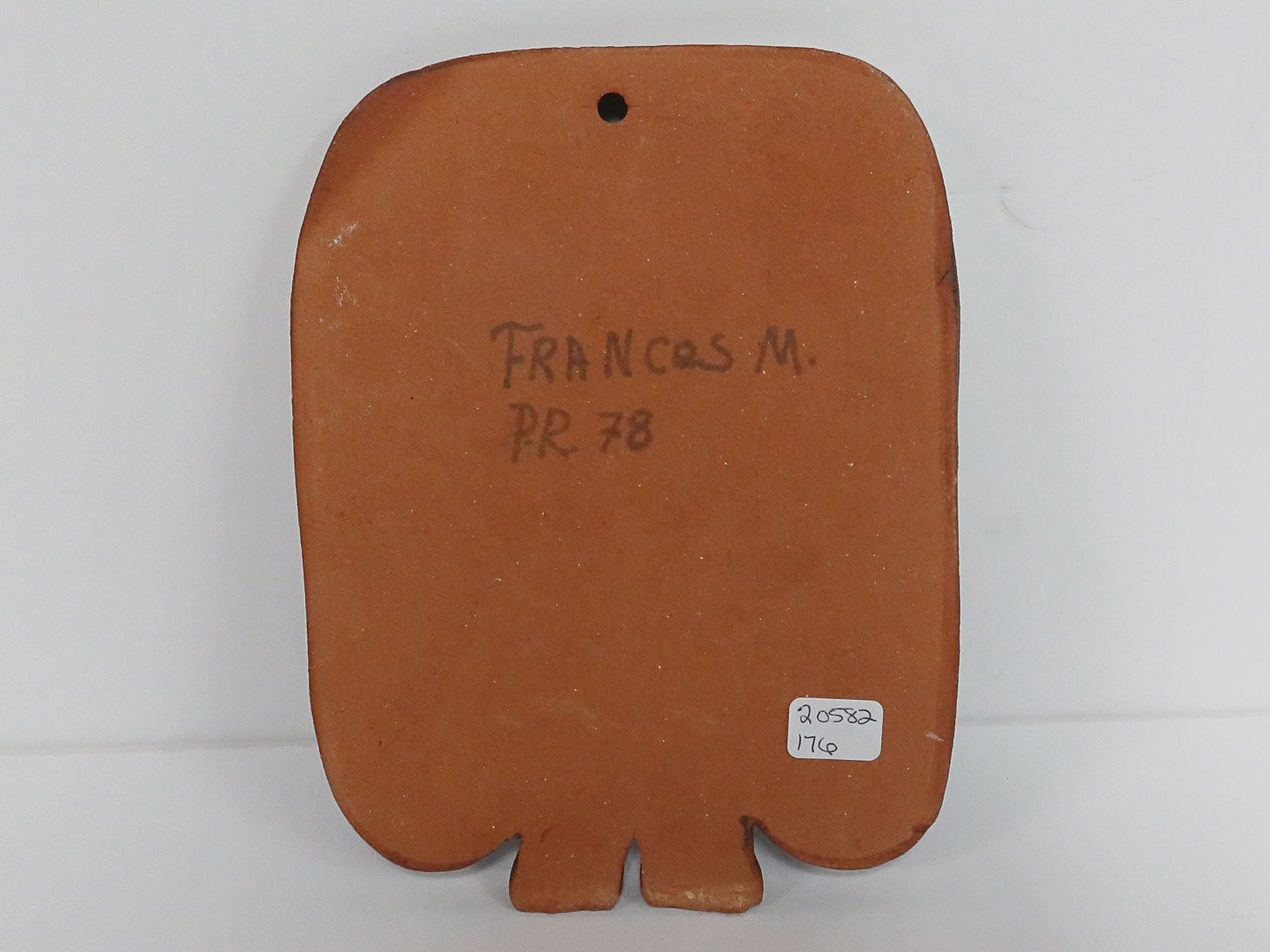 Owl shaped tile, blue, white and brown. Signed Francis M.
