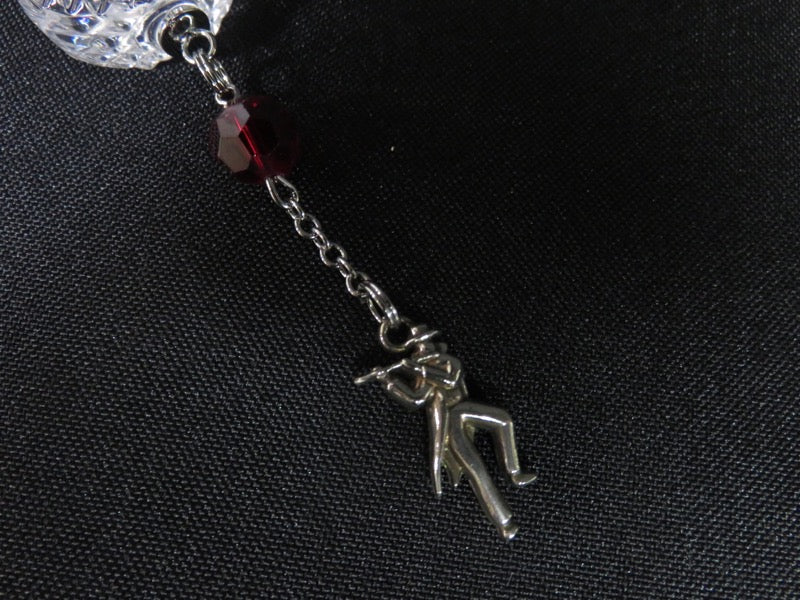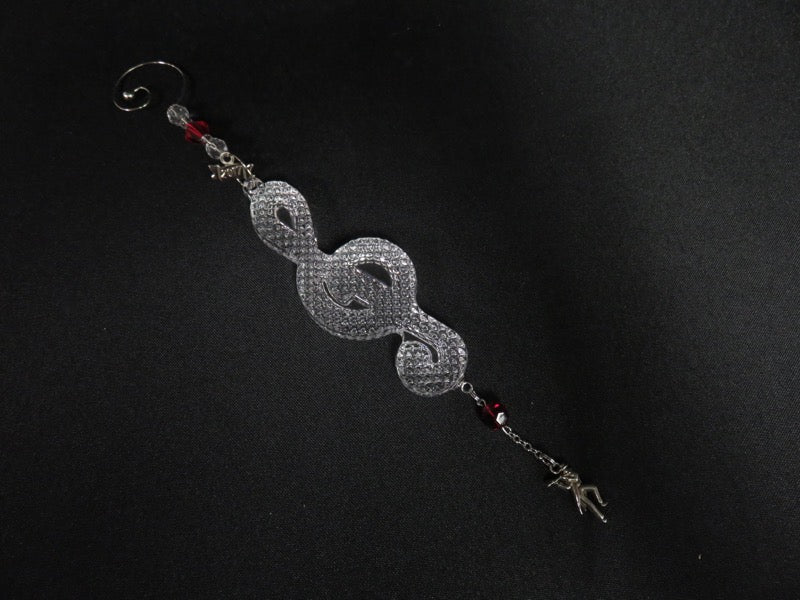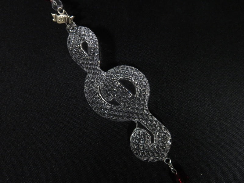 Crystal treble clef with red beads and figure of man playing flute, 2017