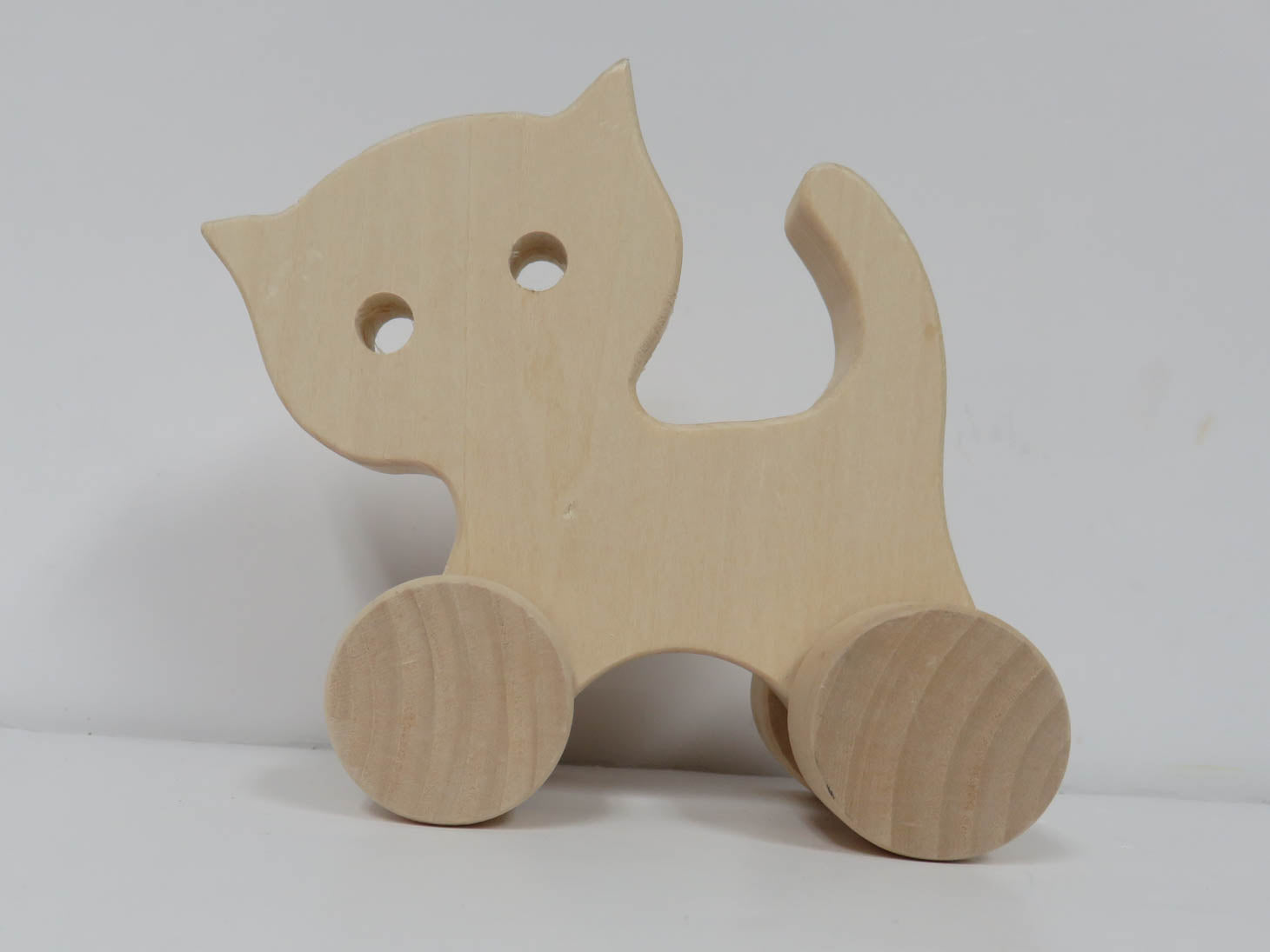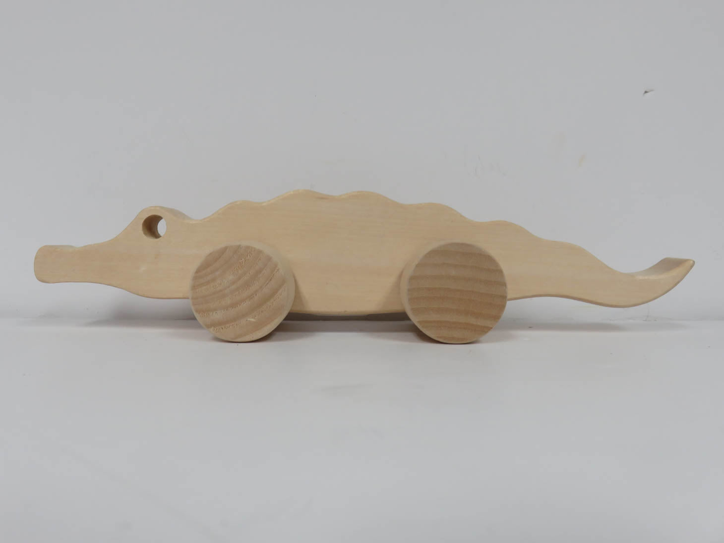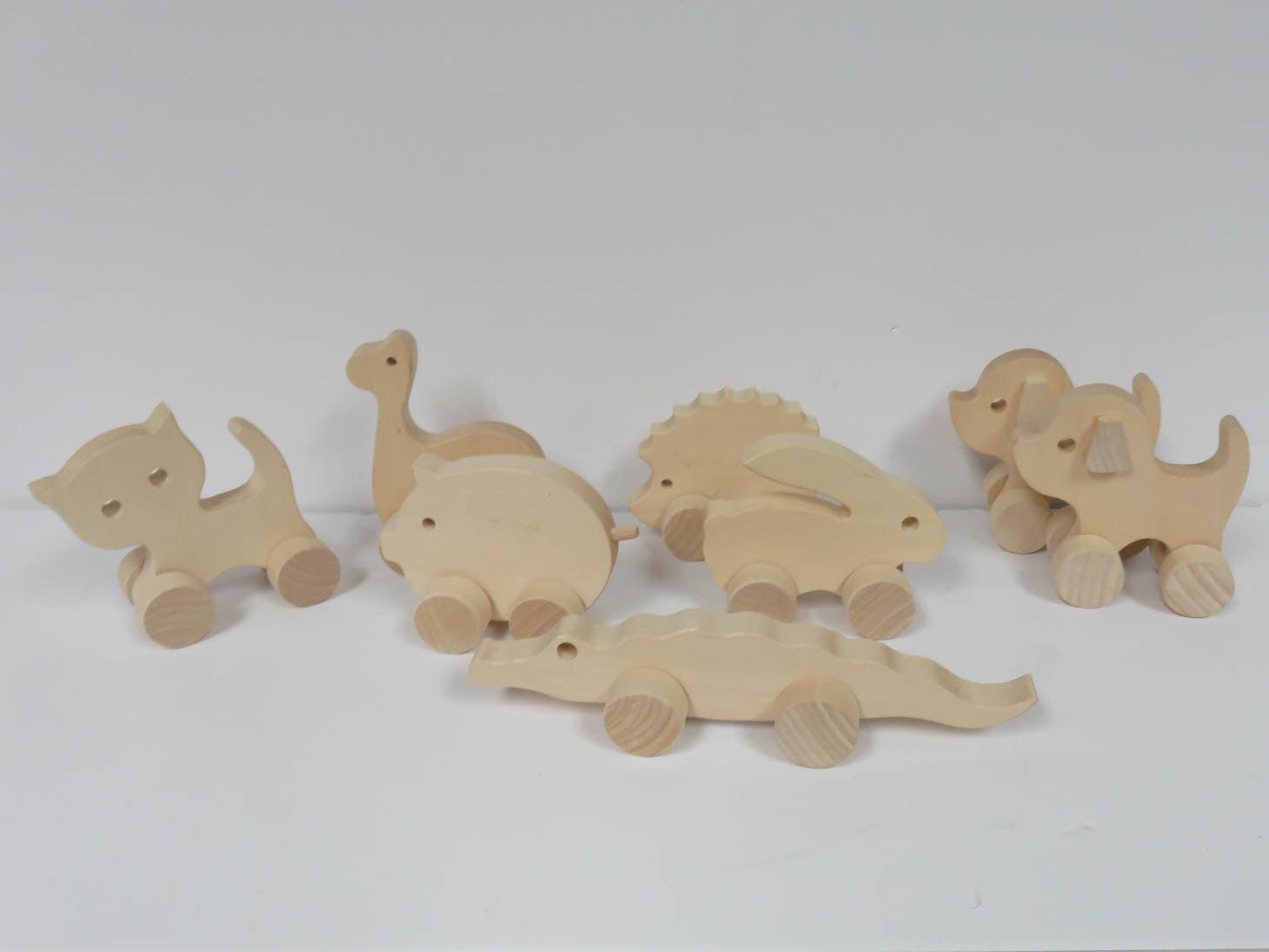 Set of 8, various animals on wheels. Each hand made with a natural finish. 8.5" alligator, 3.5 to 4" H