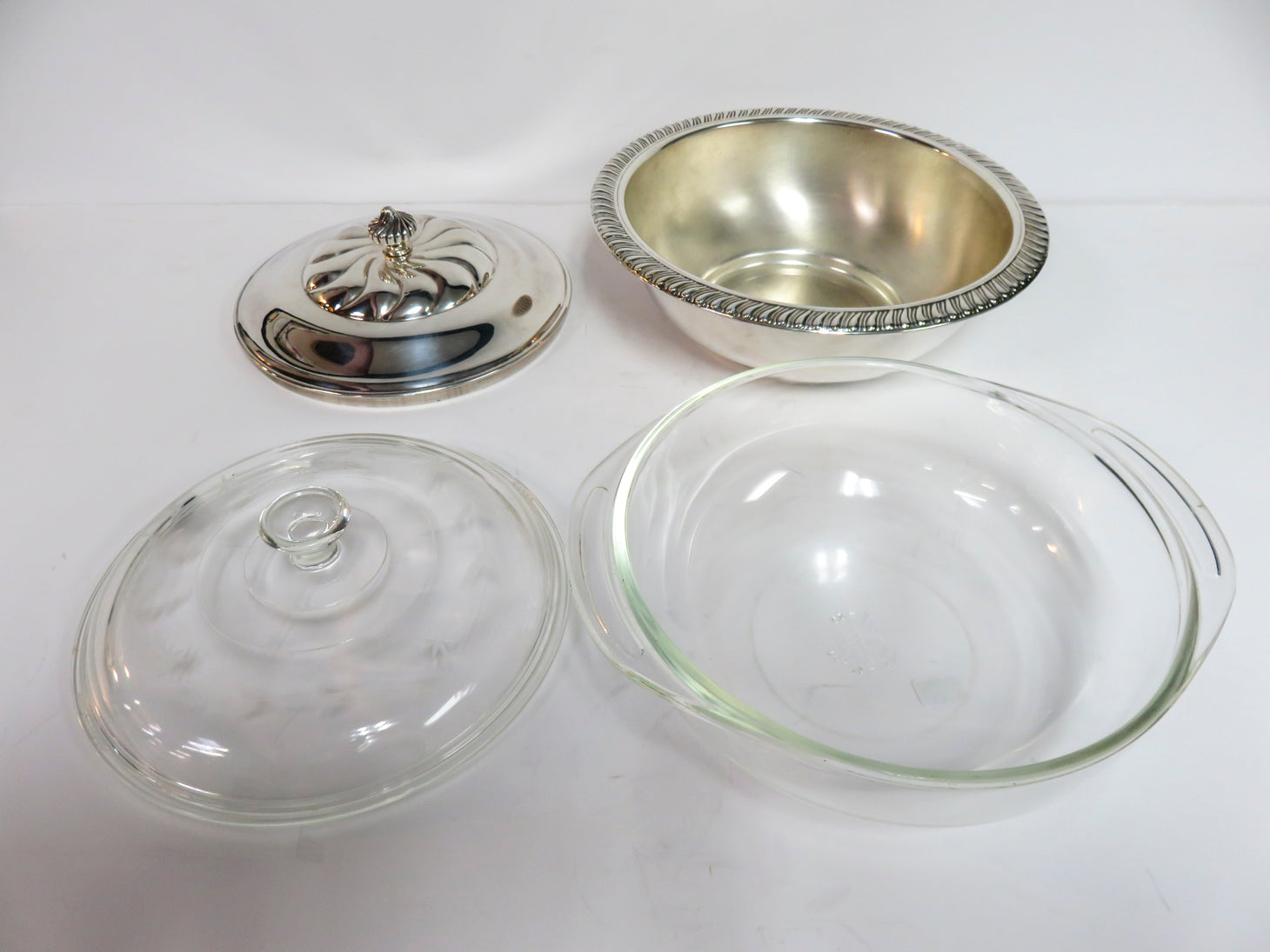 Item Number: 26980-1 4-piece, Pyrex liner and lid with silver plate holder with rope design also with lid. 9.5"D x 3" H
