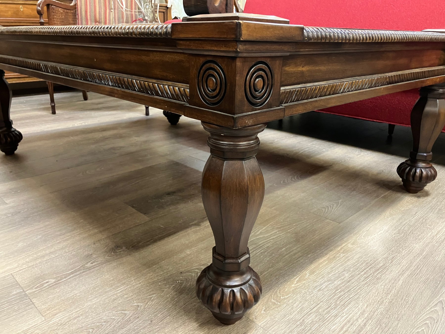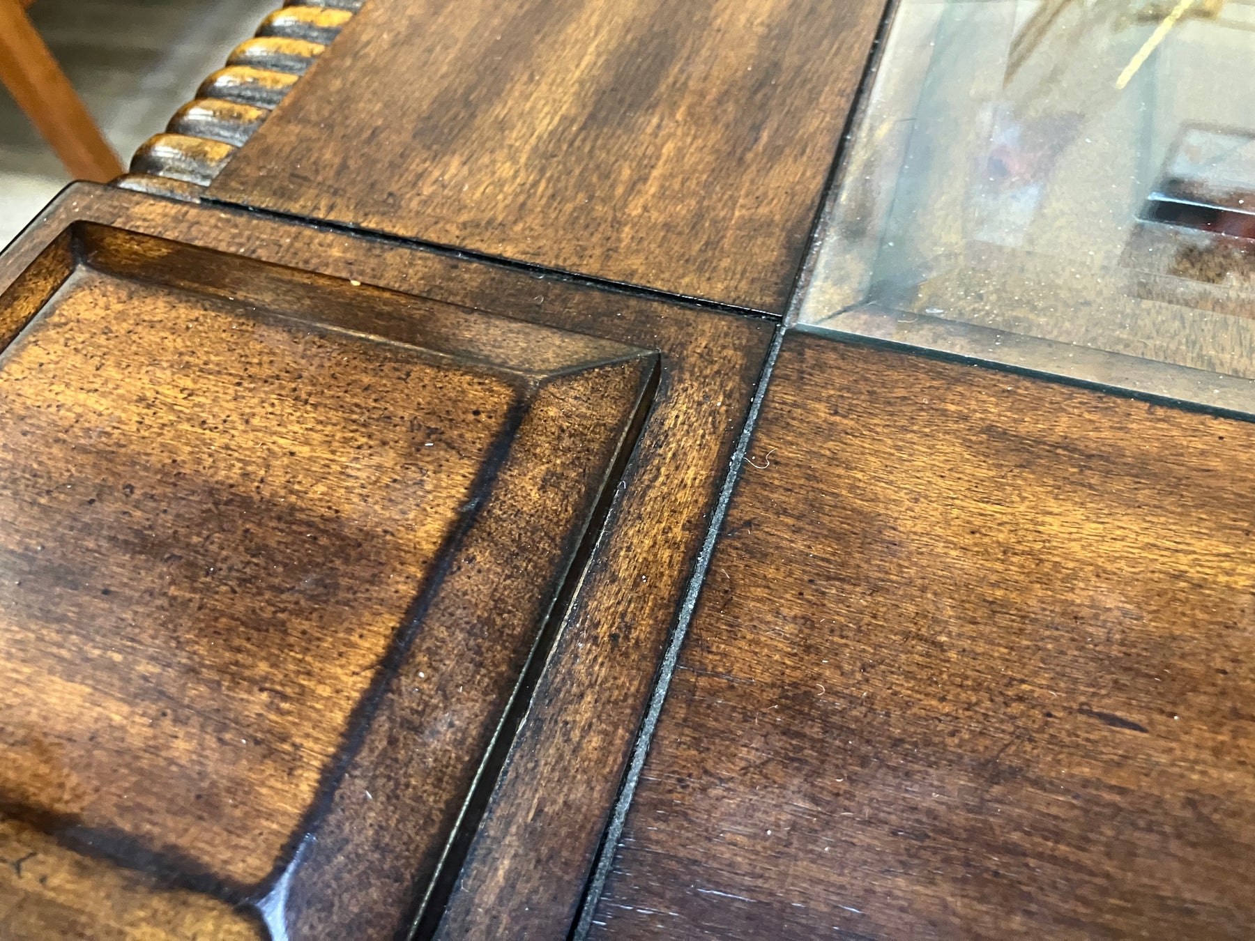 Rectangular with decorative recessed panels visible beneath glass top. Dentil trim around edge and carved bun legs.