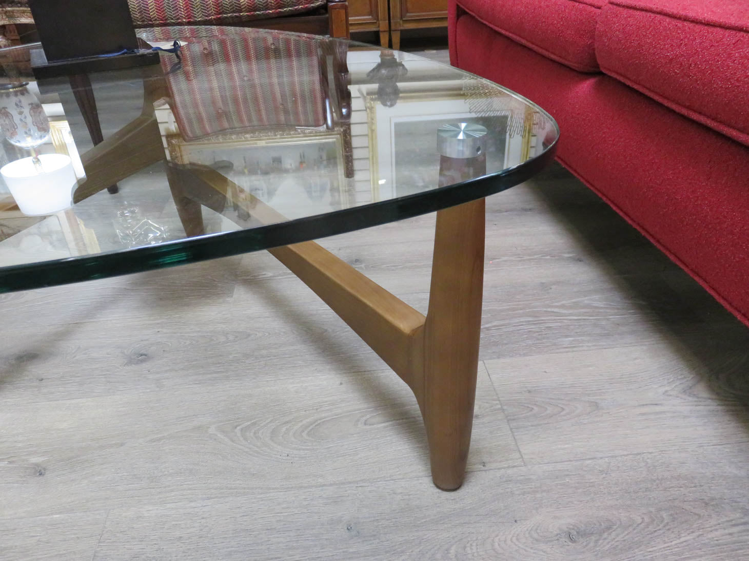 Solid ash, 3-legged base with triangular glass top