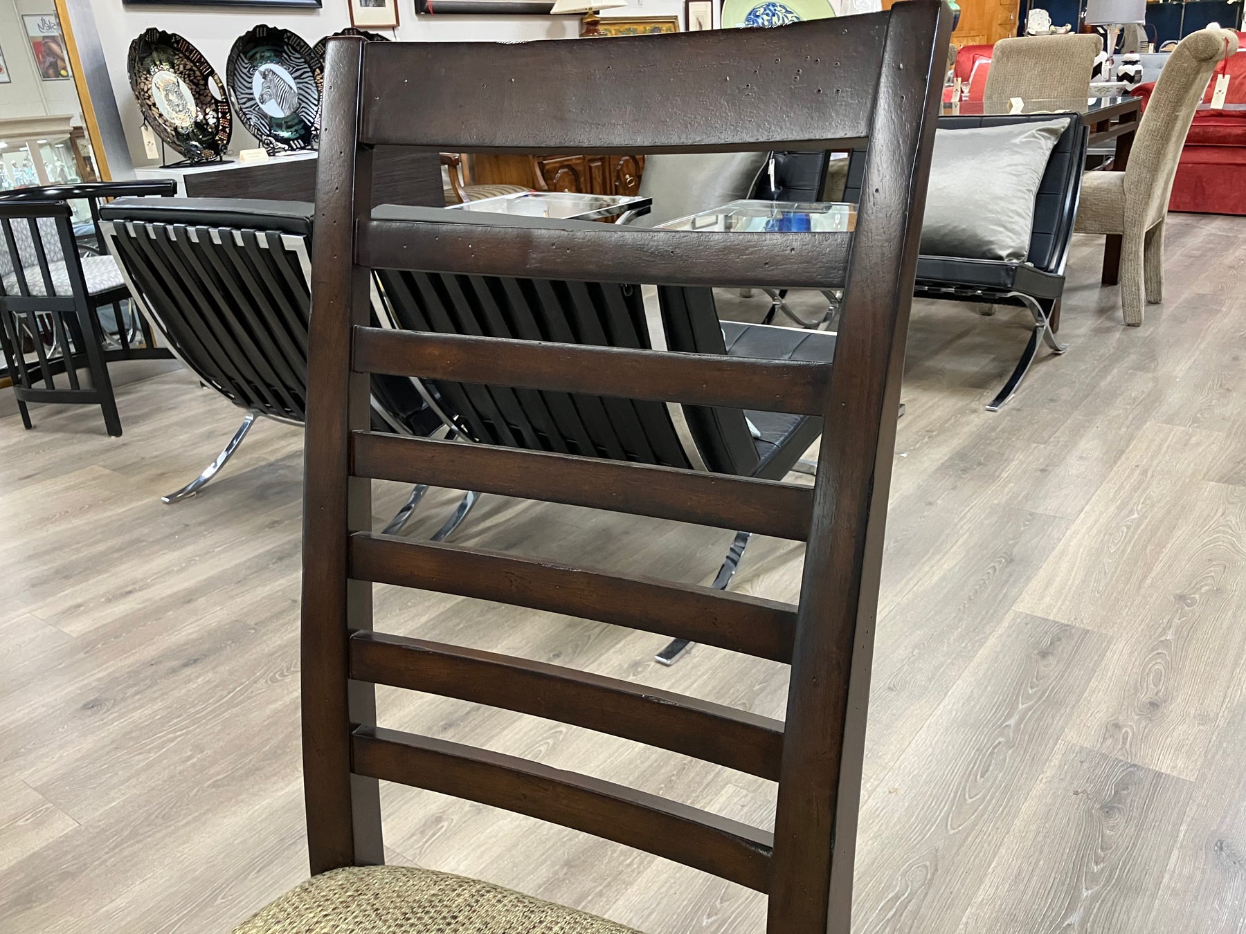 Set of 6, Dark brown wood with ladder back design. Brown & beige patterned upholstery on seats.