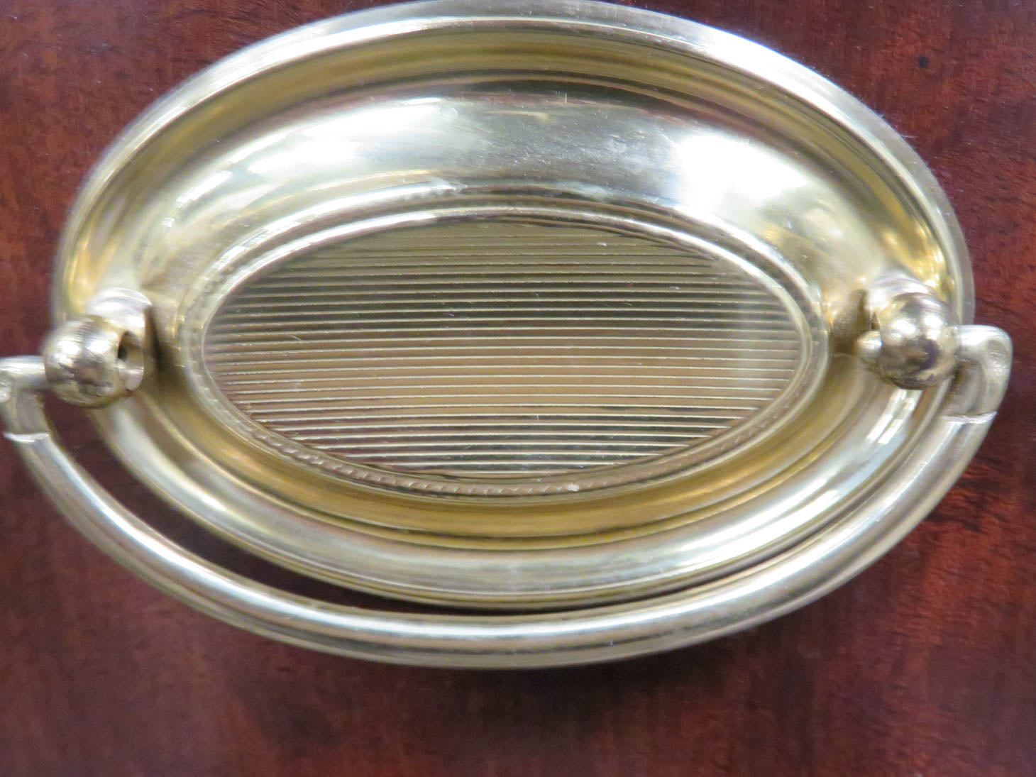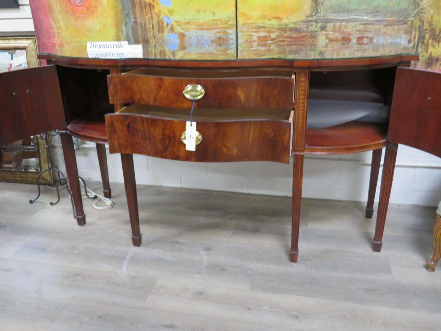 Federal style with 2 doors and 2 drawers. Serpentine front with inlaid bellflower design on fluted legs and brass hardware. Protective glass top included.