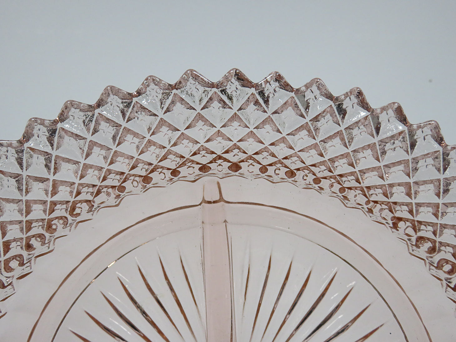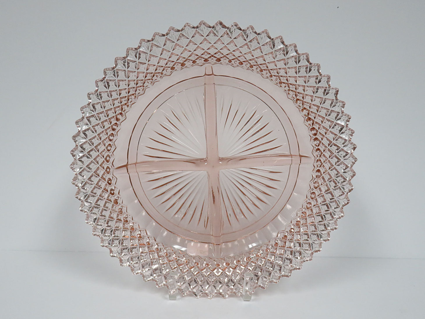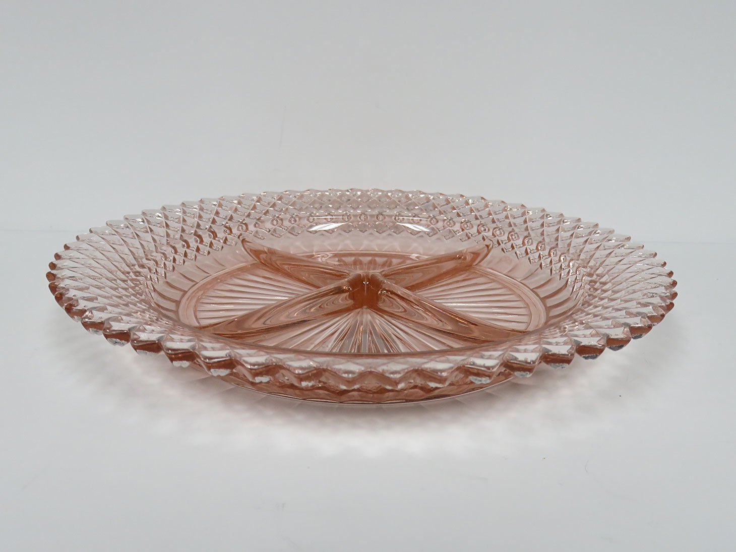 Miss America pattern 4 sectioned plate. Diamond-point edges and starurst center. Produced in the 1930s.