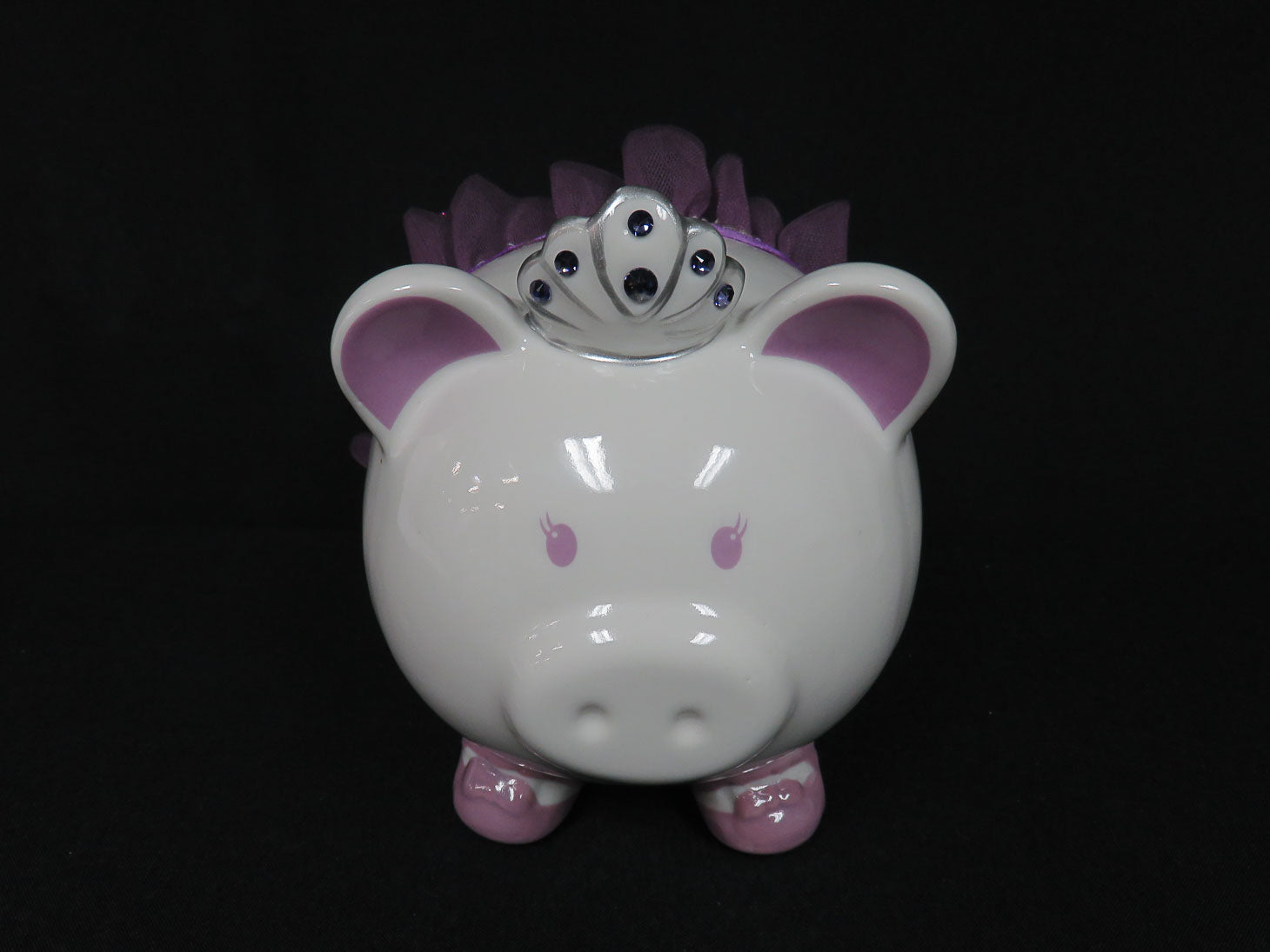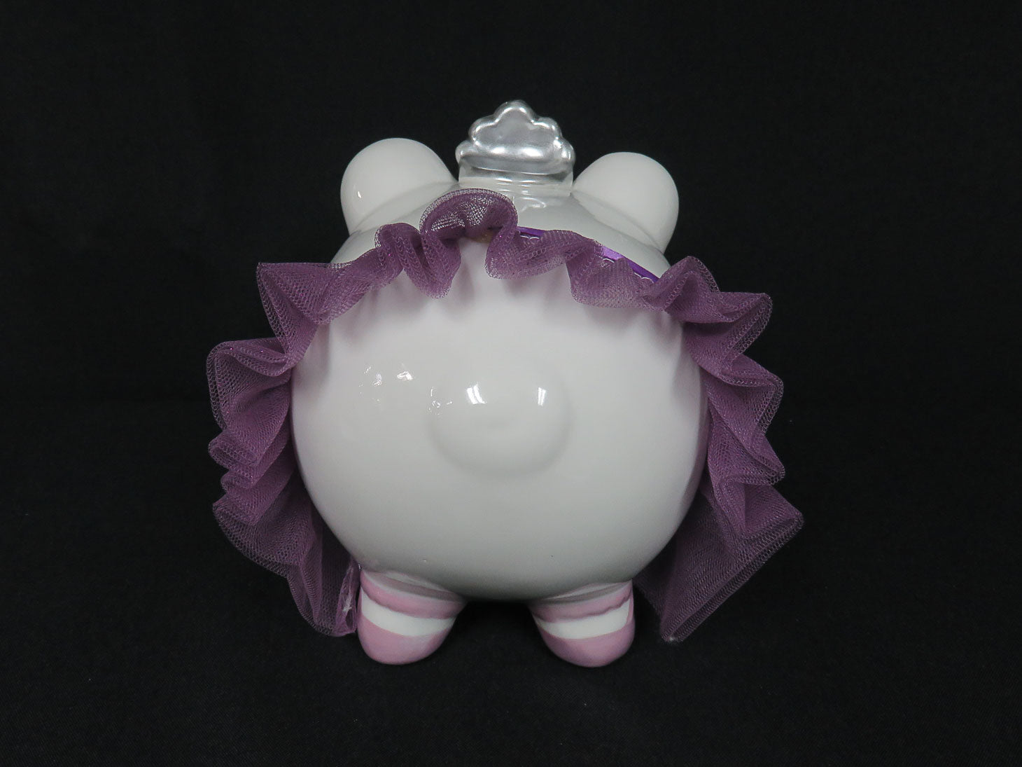 Pig in purple tutu and shoes, sliver crown with purple gems.