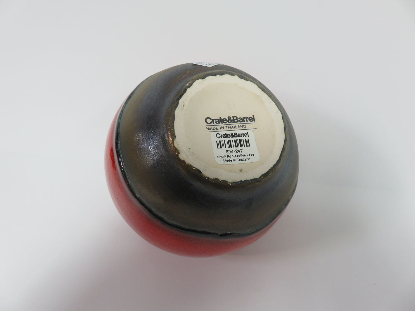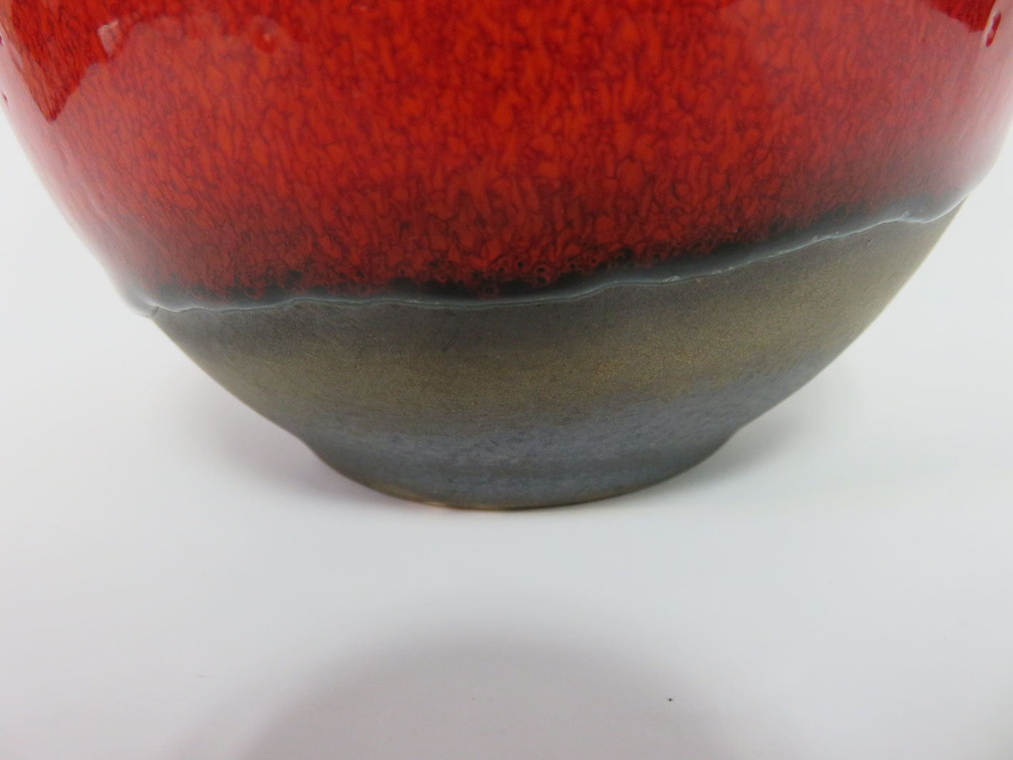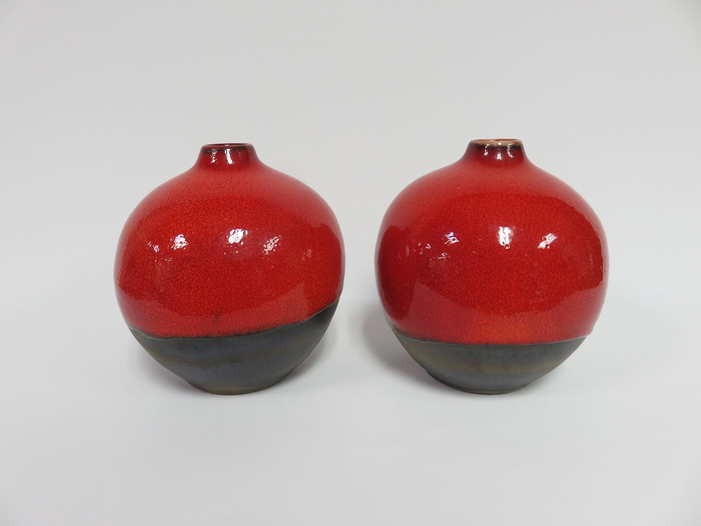 Pair of "Small Red Reactive Vases" brushed metal bottom glaze, red speckled top.