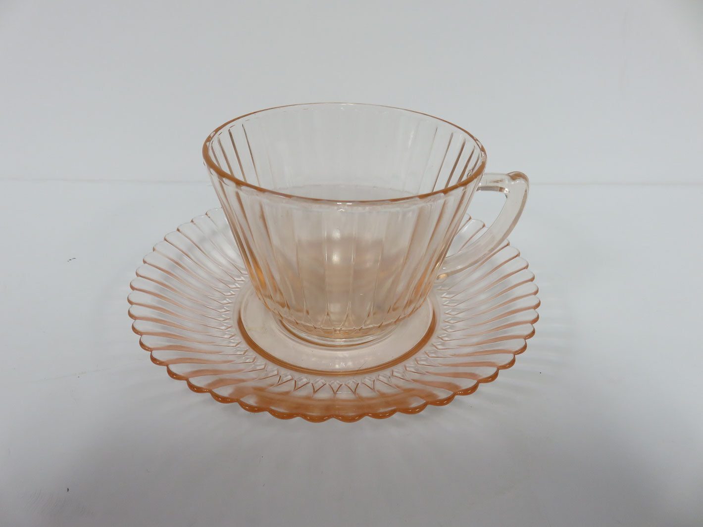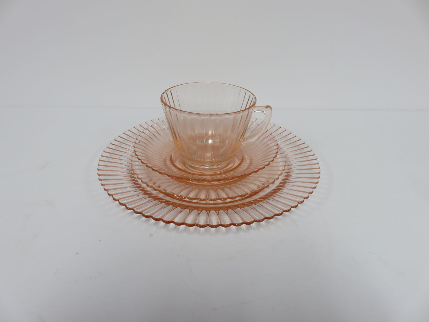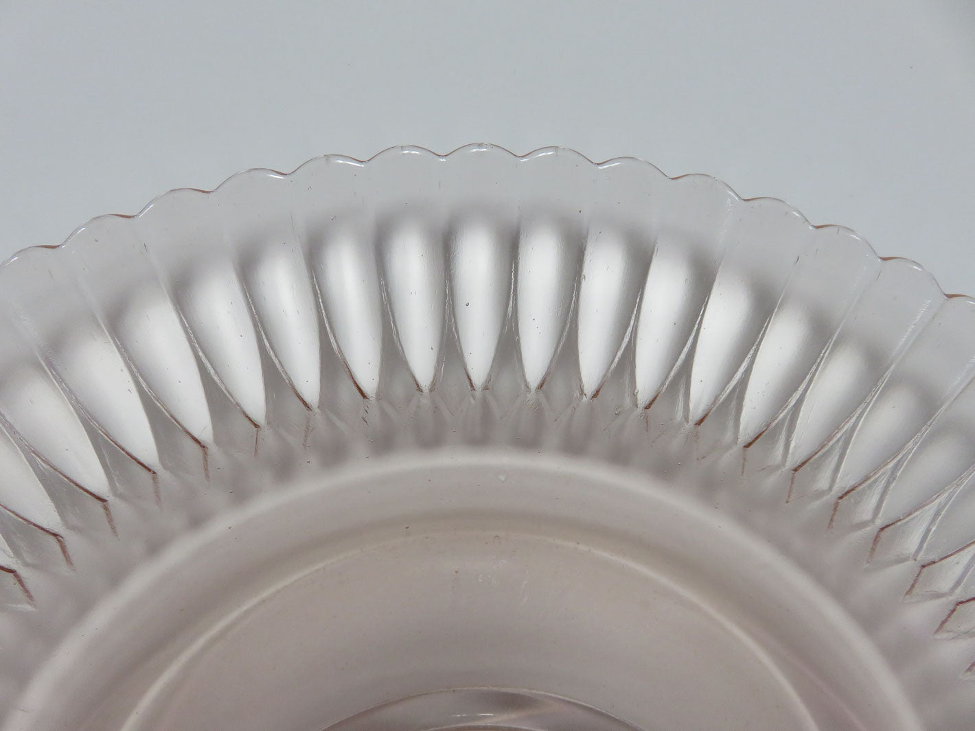 6-4 piece place settings plus 2 condiment jars. Petalware Pink pattern, ribbed design with scalloped edges. Produced in the 1930s.