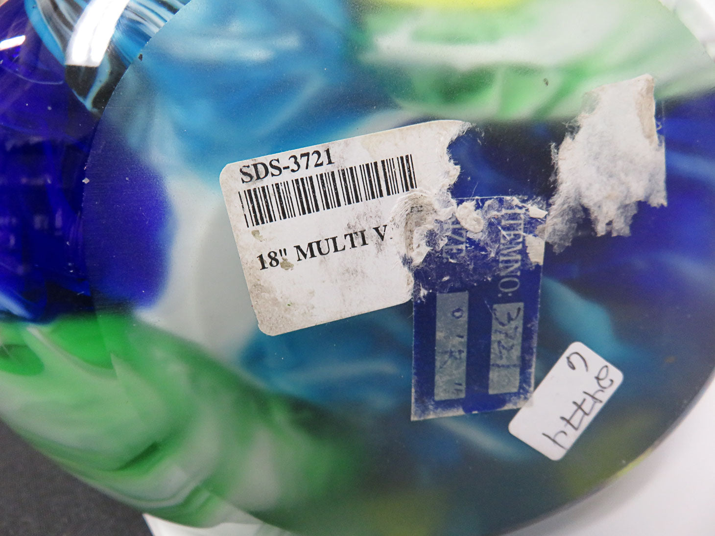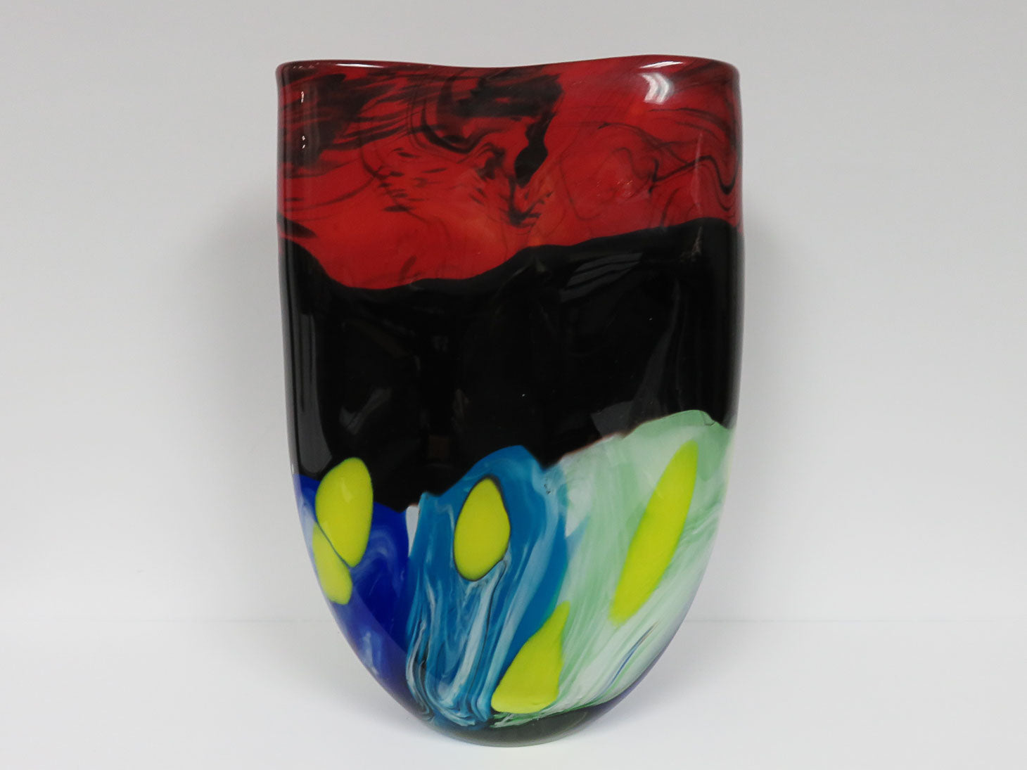 Hand blown, tall vase with oblong opening in vibrant reds, blues and yellows.