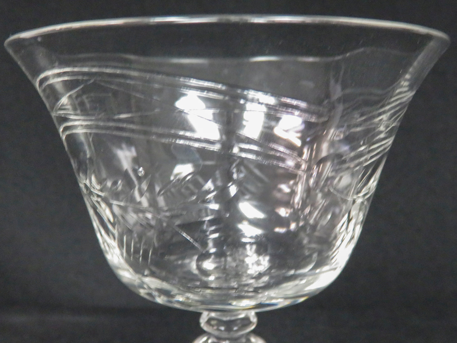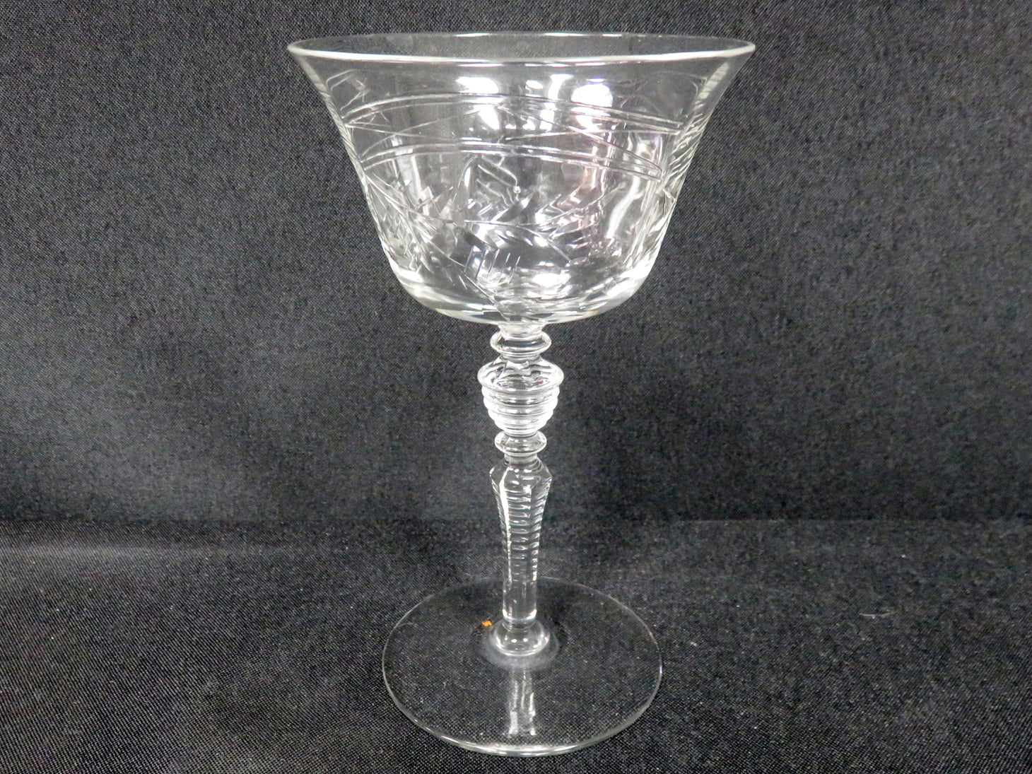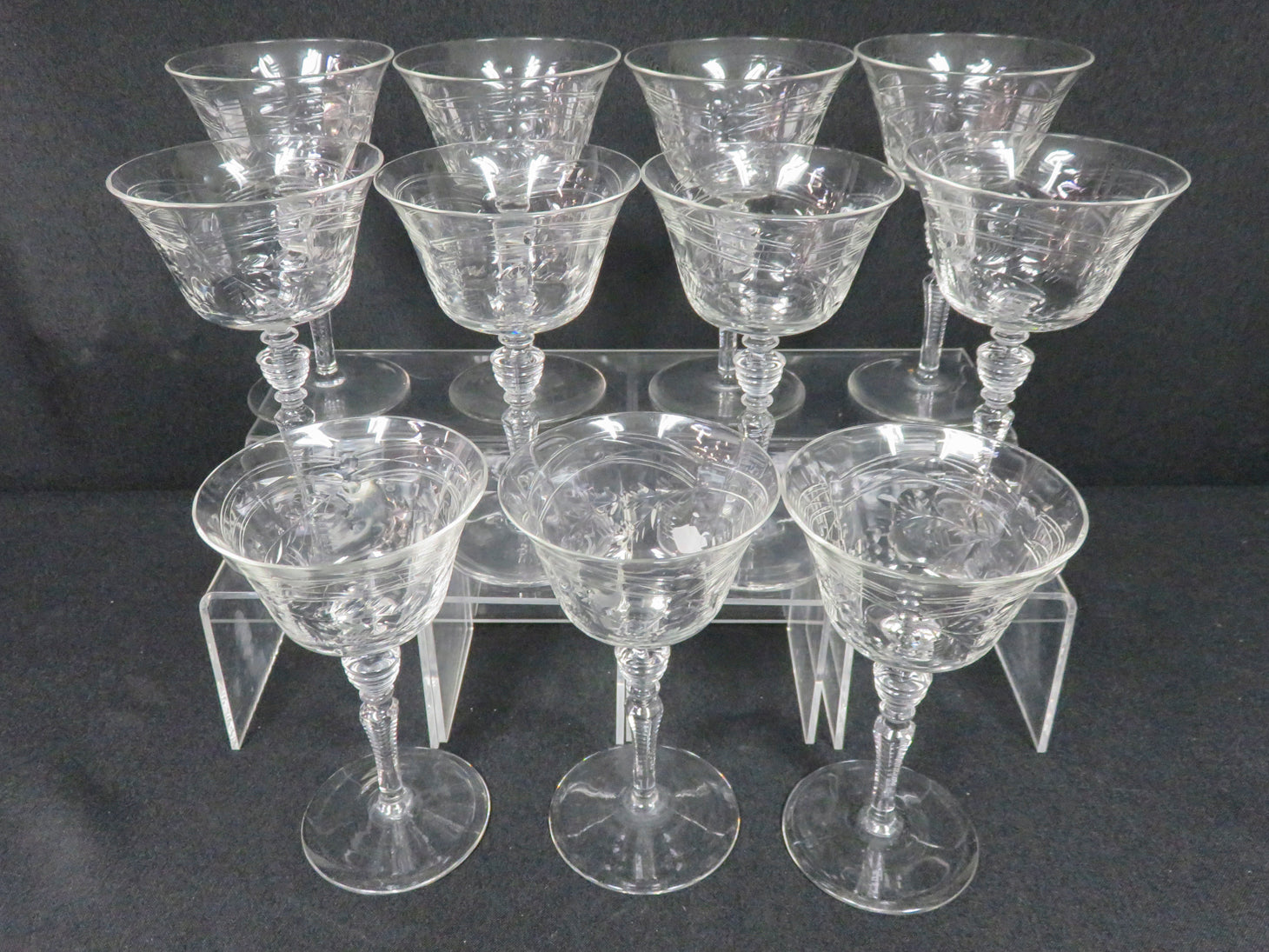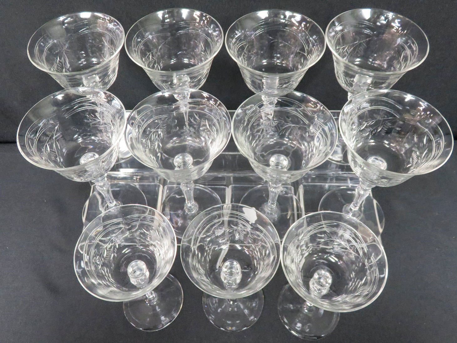 Item Number: 29810-17 Set of 11, clear with edged leaf design, horizontal ridge on stem. Hand blown. 5.75" H