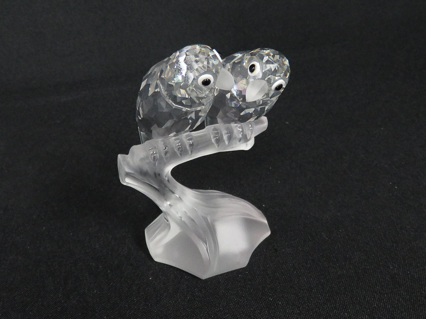 Item Number: 30149-2 "Togetherness" two clear faceted lovebirds perched on a frosted branch with mirrored base. First Annual Edition 1987. 4.5" H