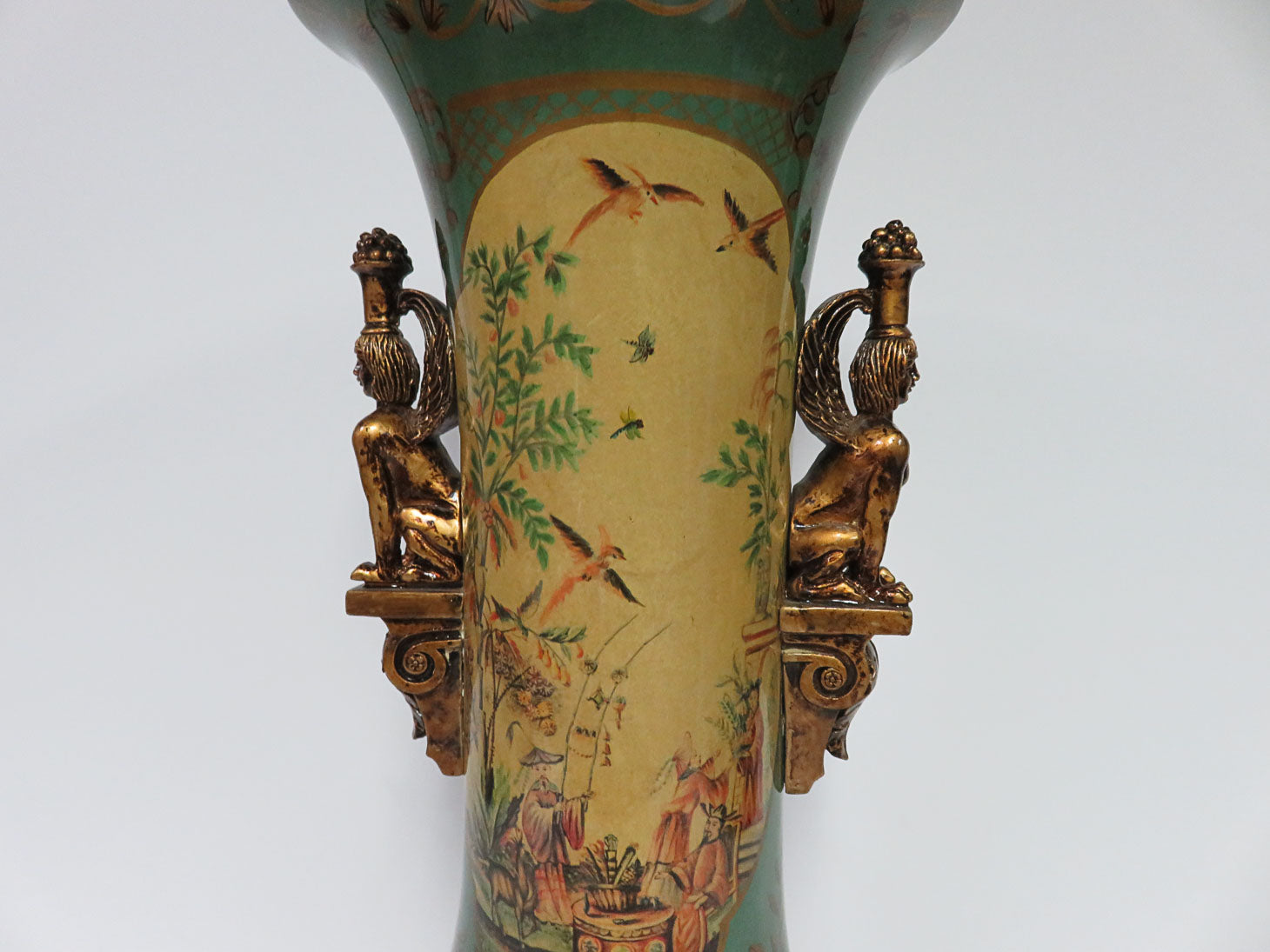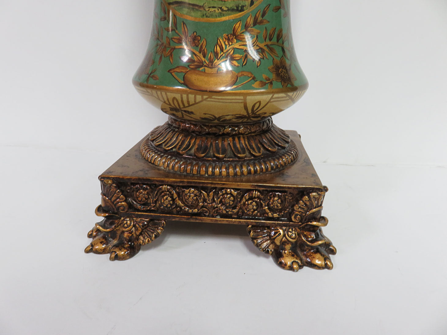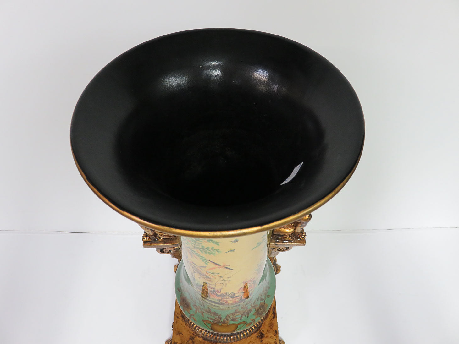 Square bronze toned footed base, griffin handles, Asian scene, flared