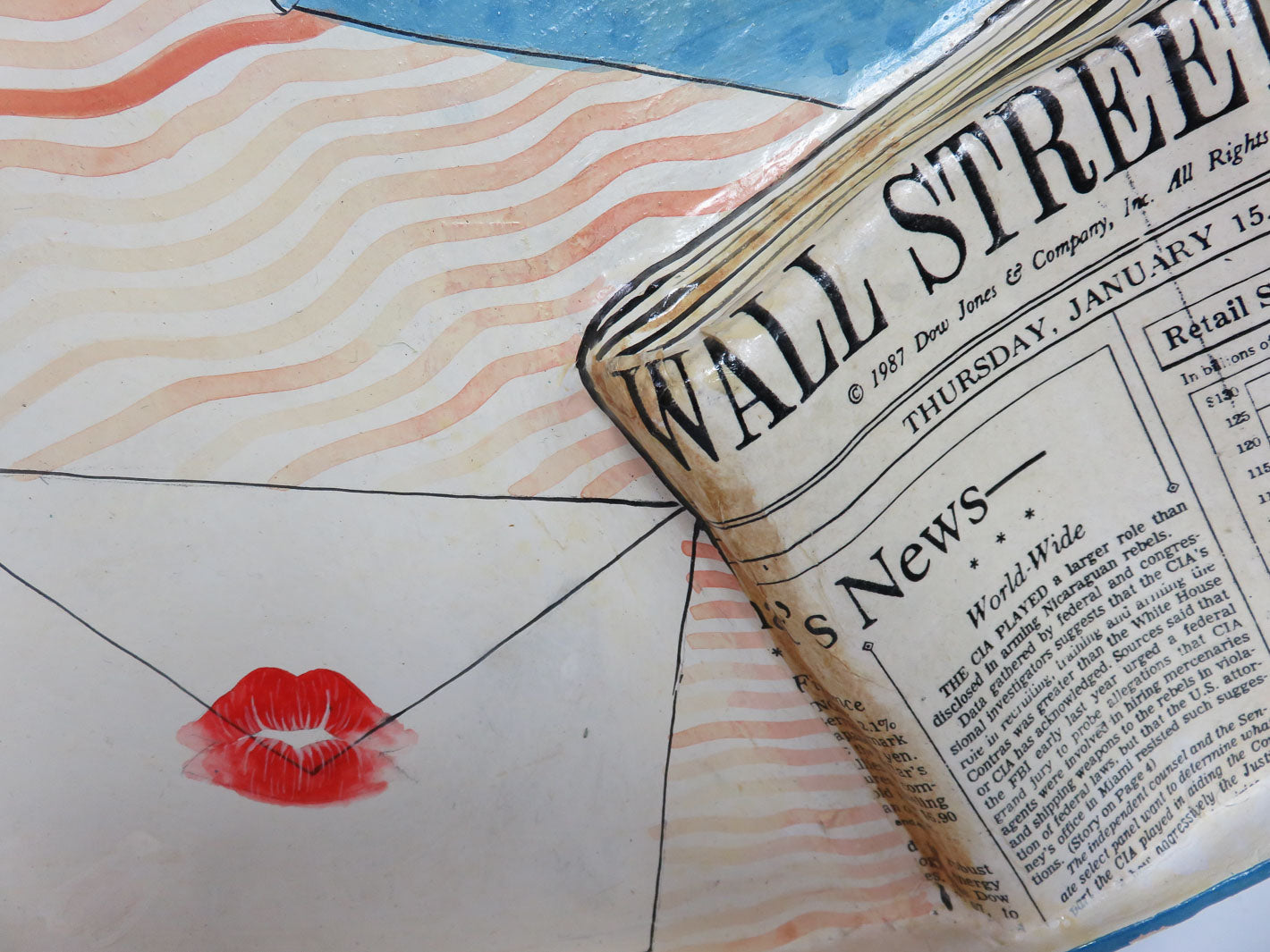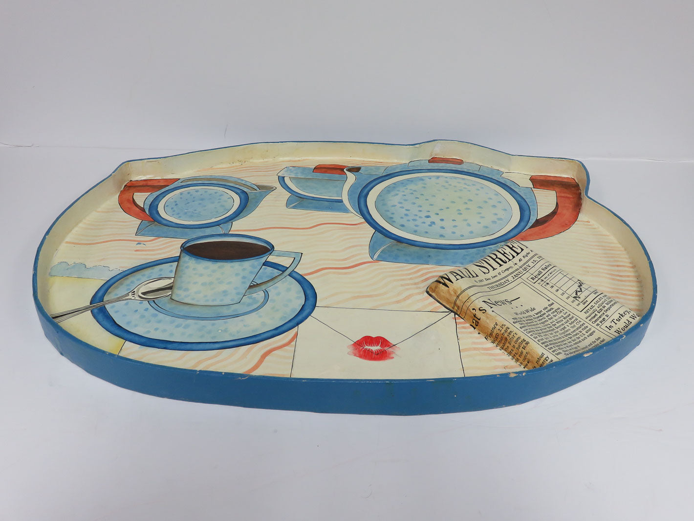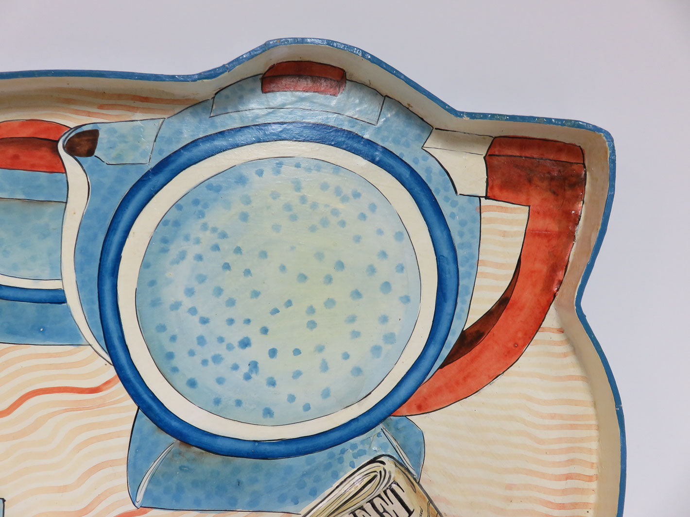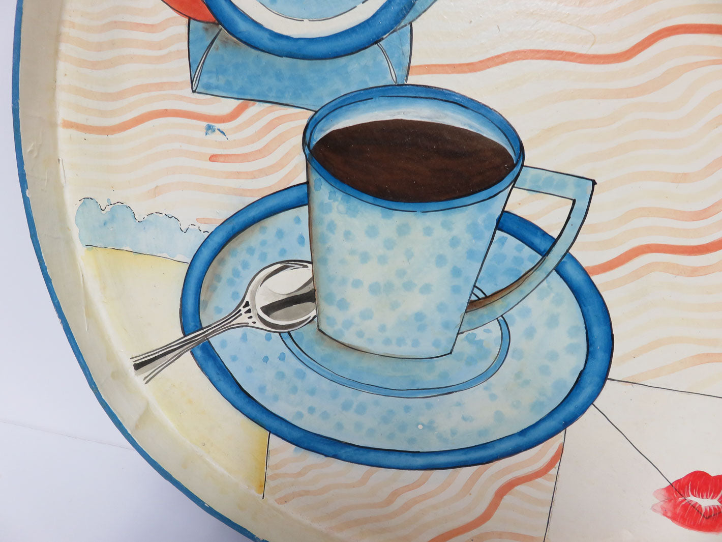 Whimsical, painted coffee set with 3-D newspaper, pink, cream, turquoise blue, orange