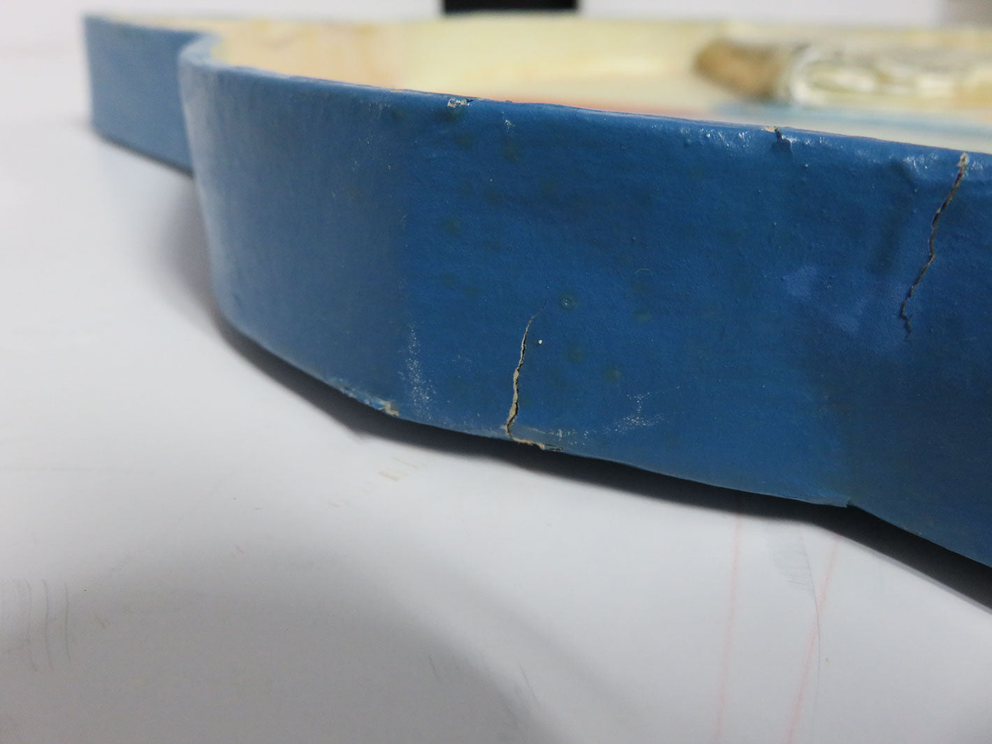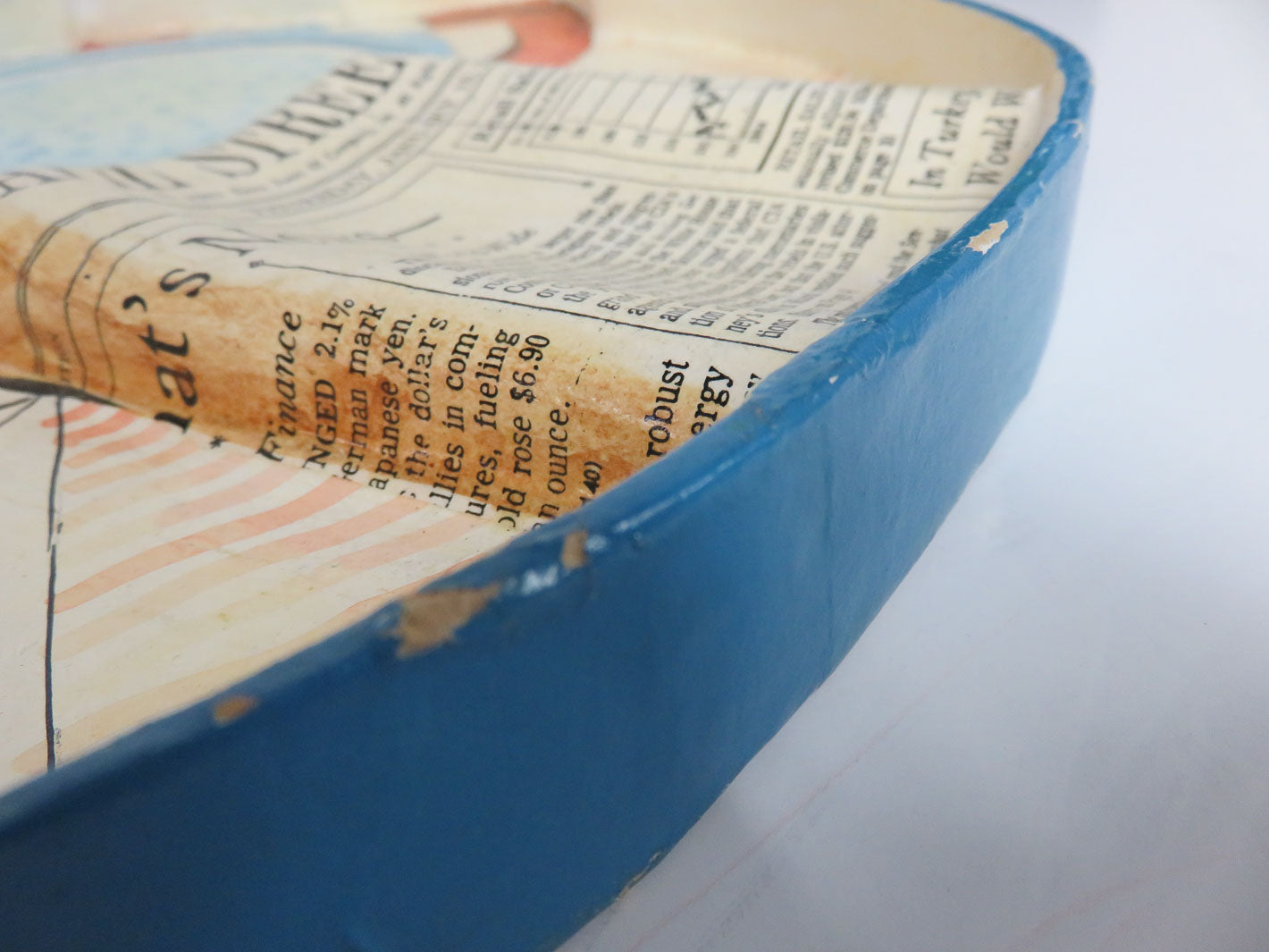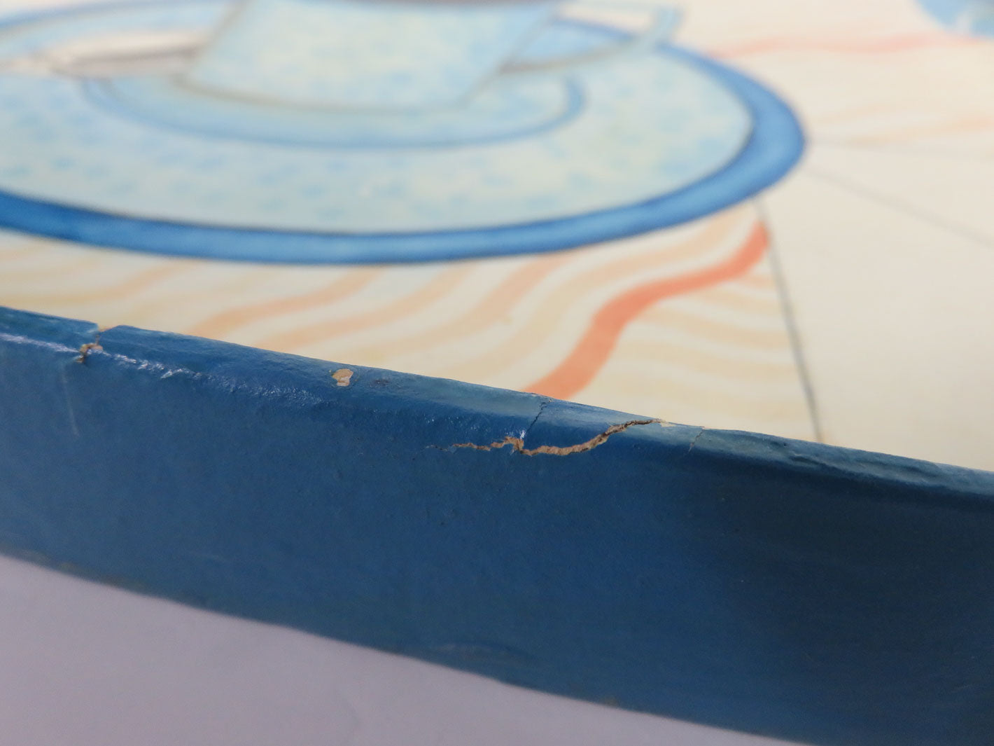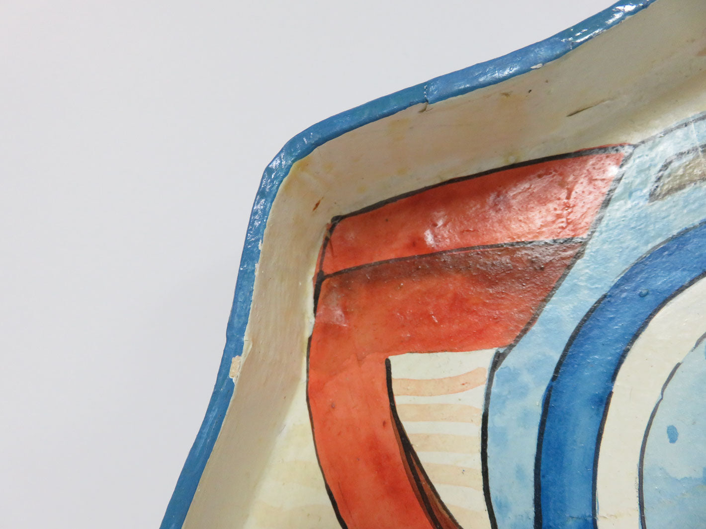 Whimsical, painted coffee set with 3-D newspaper, pink, cream, turquoise blue, orange