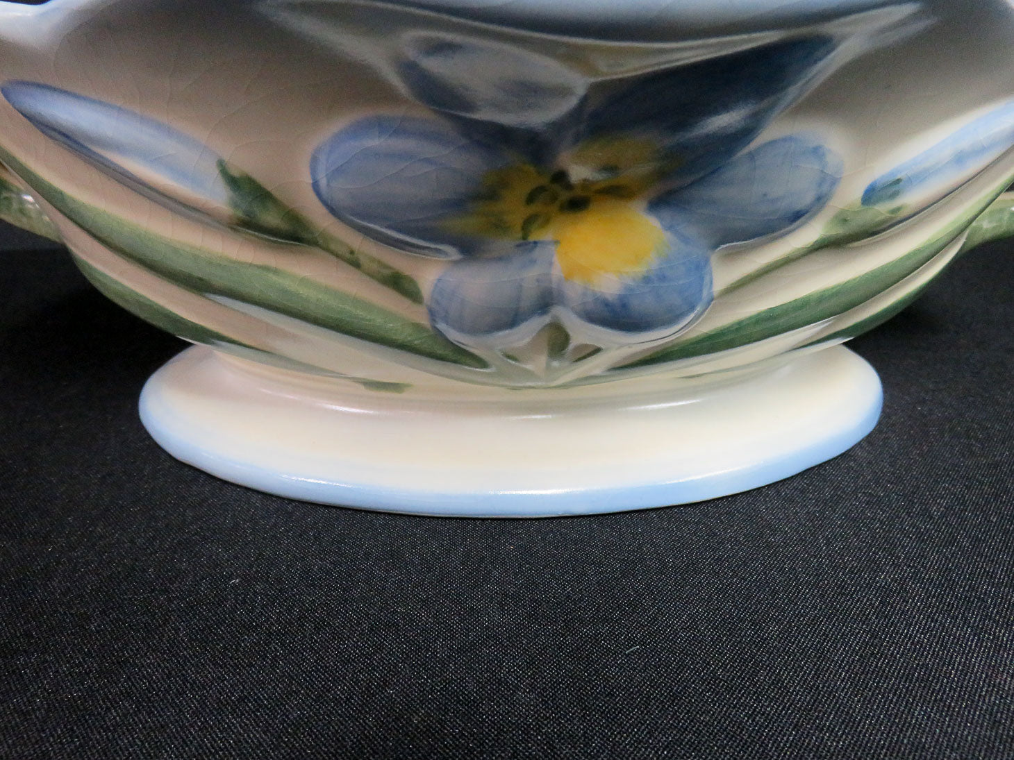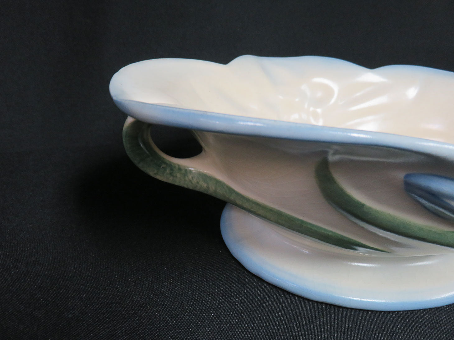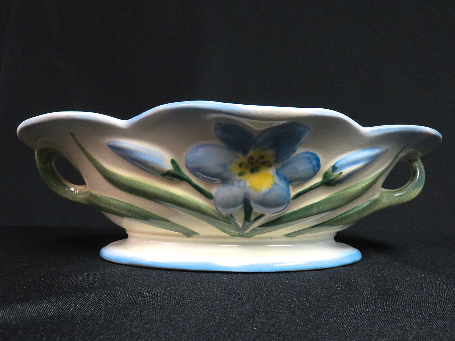 Light blue and yellow flowers with green leaves. Two wrap around green handles on oval base.