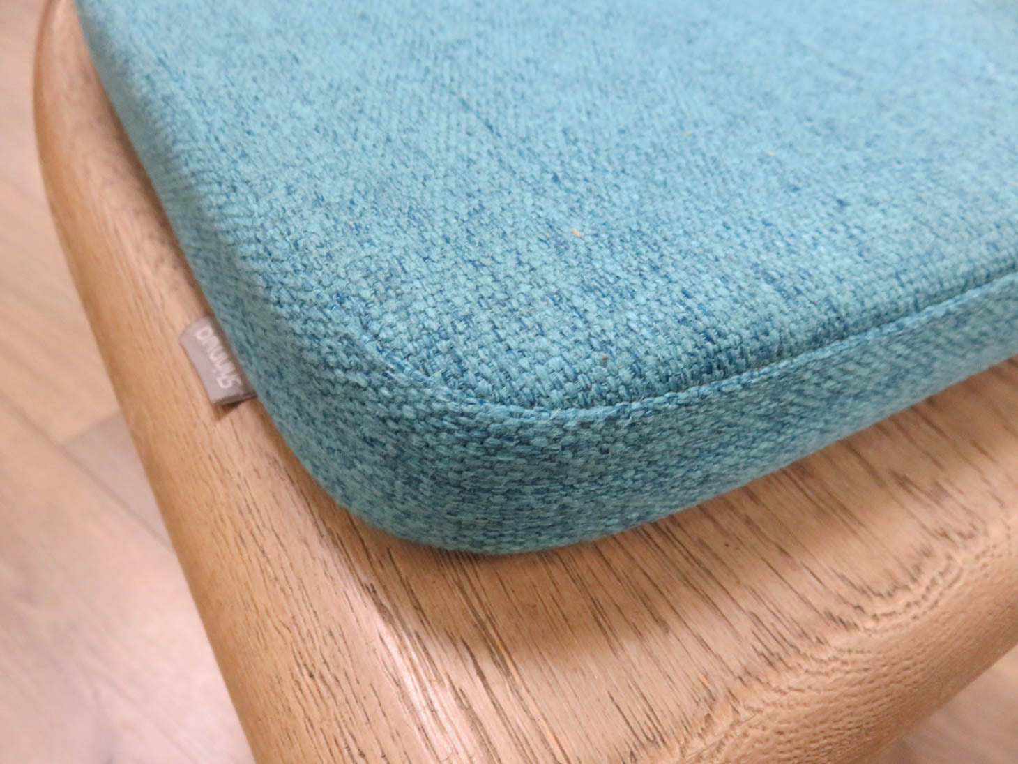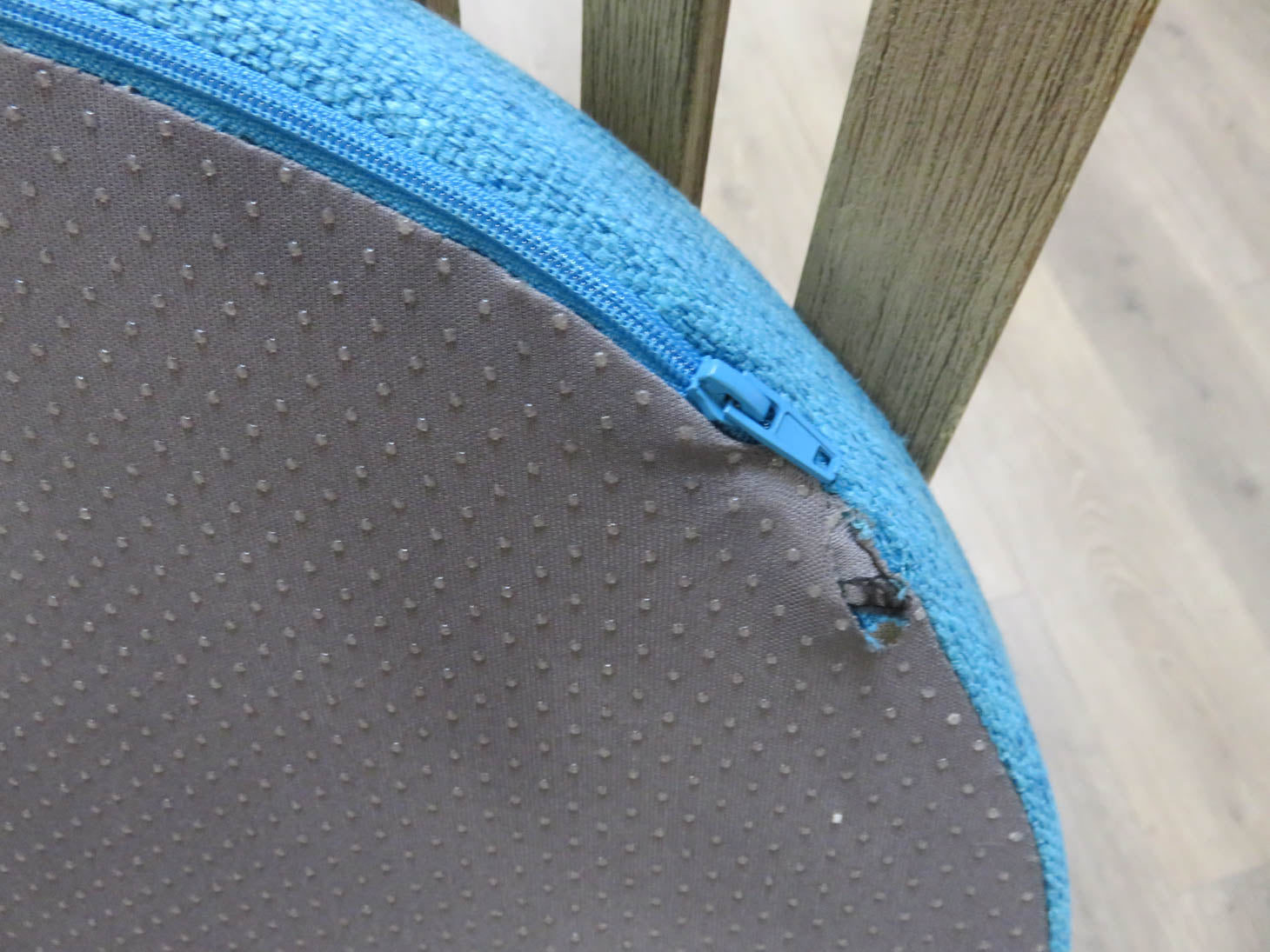 Indoor/outdoor, weathered finish with slat back and tapered legs. Removable turquoise seat cushions.