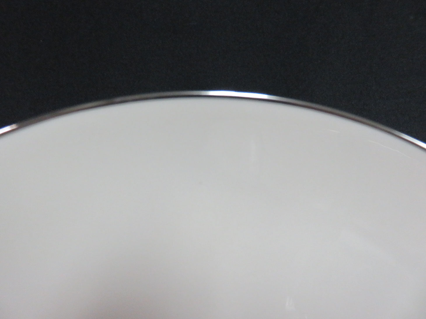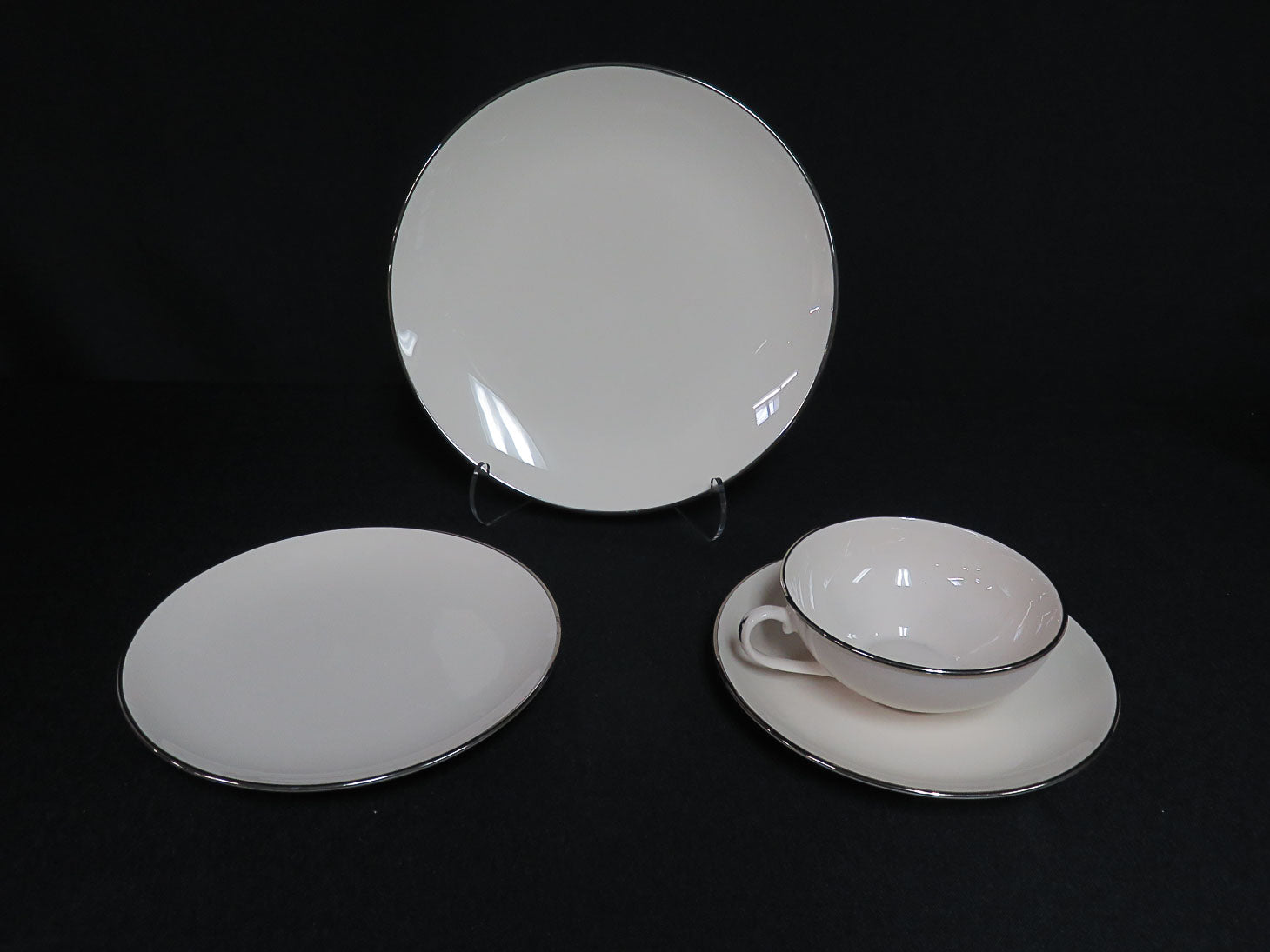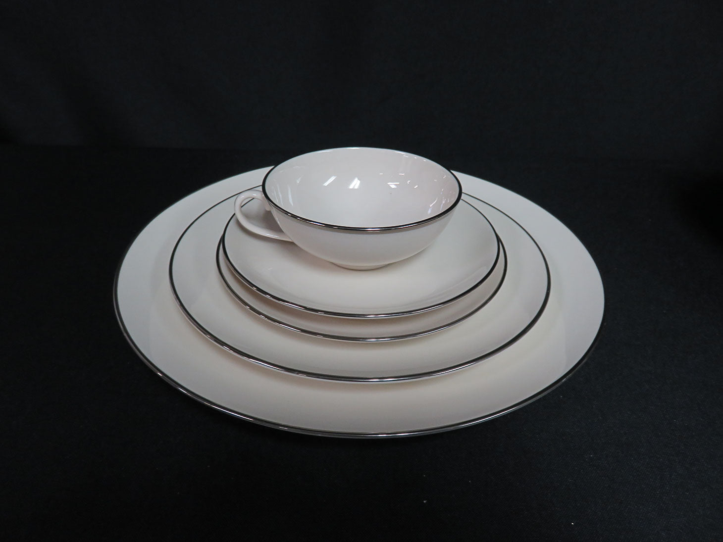 Set of 12- 5 piece place settings with gravy boat, "Encanto" ivory with platinum band (61 pieces)