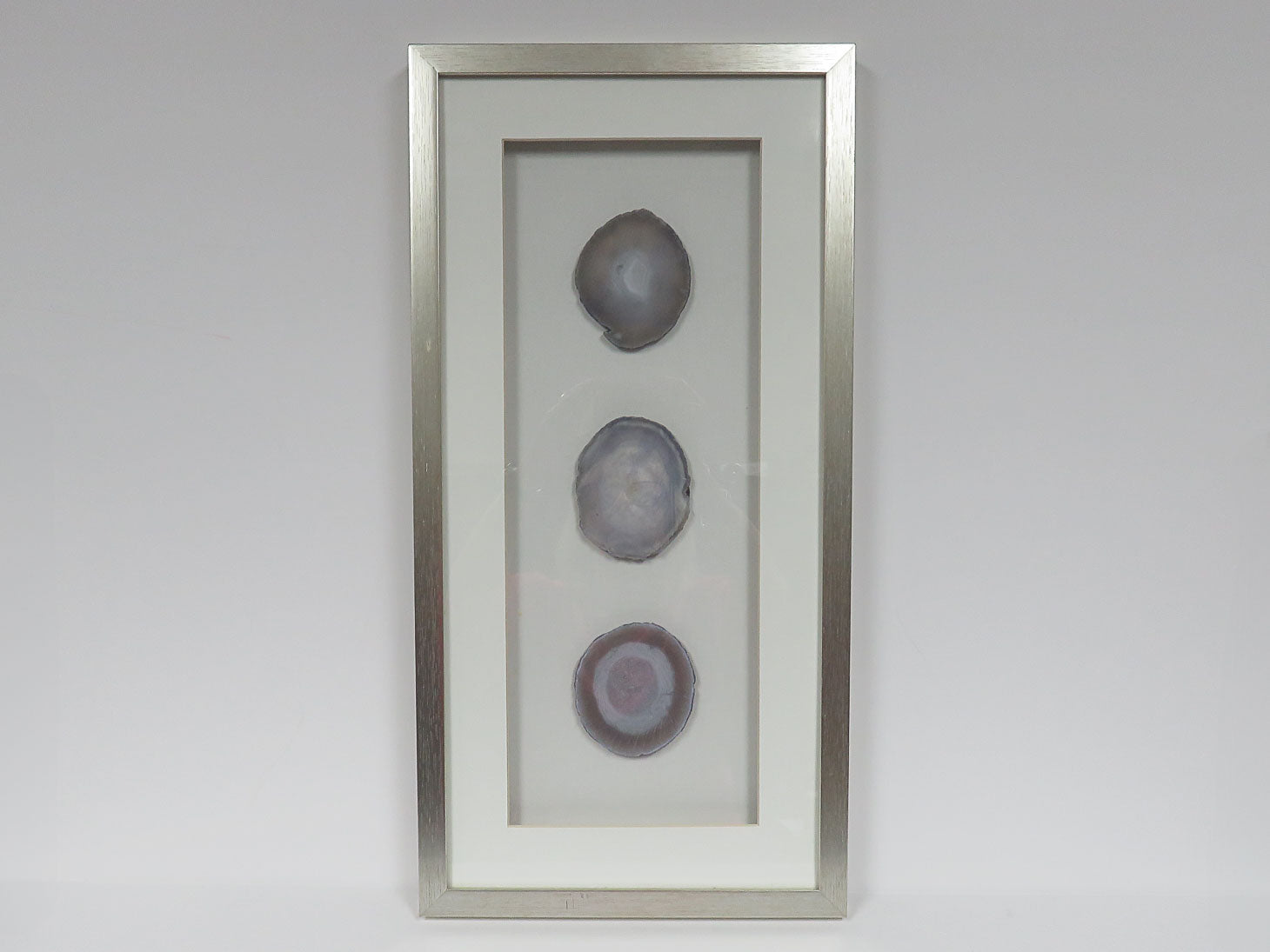 Gray geode slices matted in silver frame, hangs vertical or horizontal