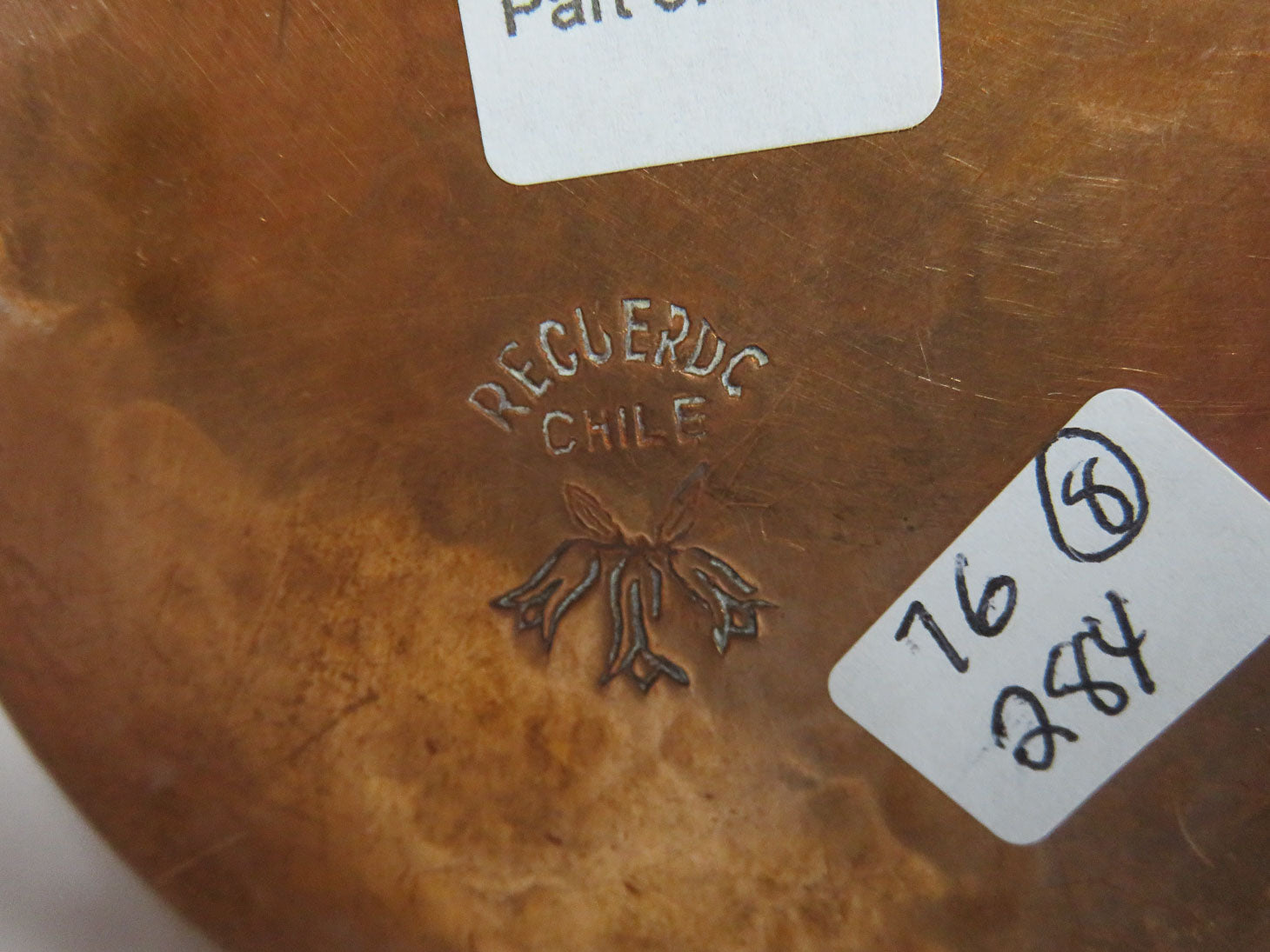 Sugar, creamer, tea pot, hot water pot on copper tray. Made in Chile