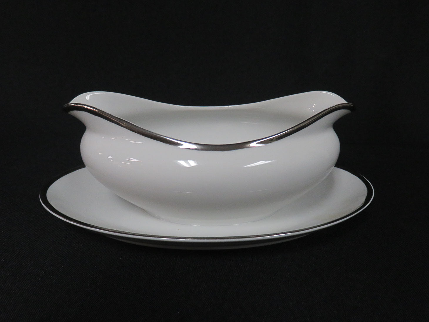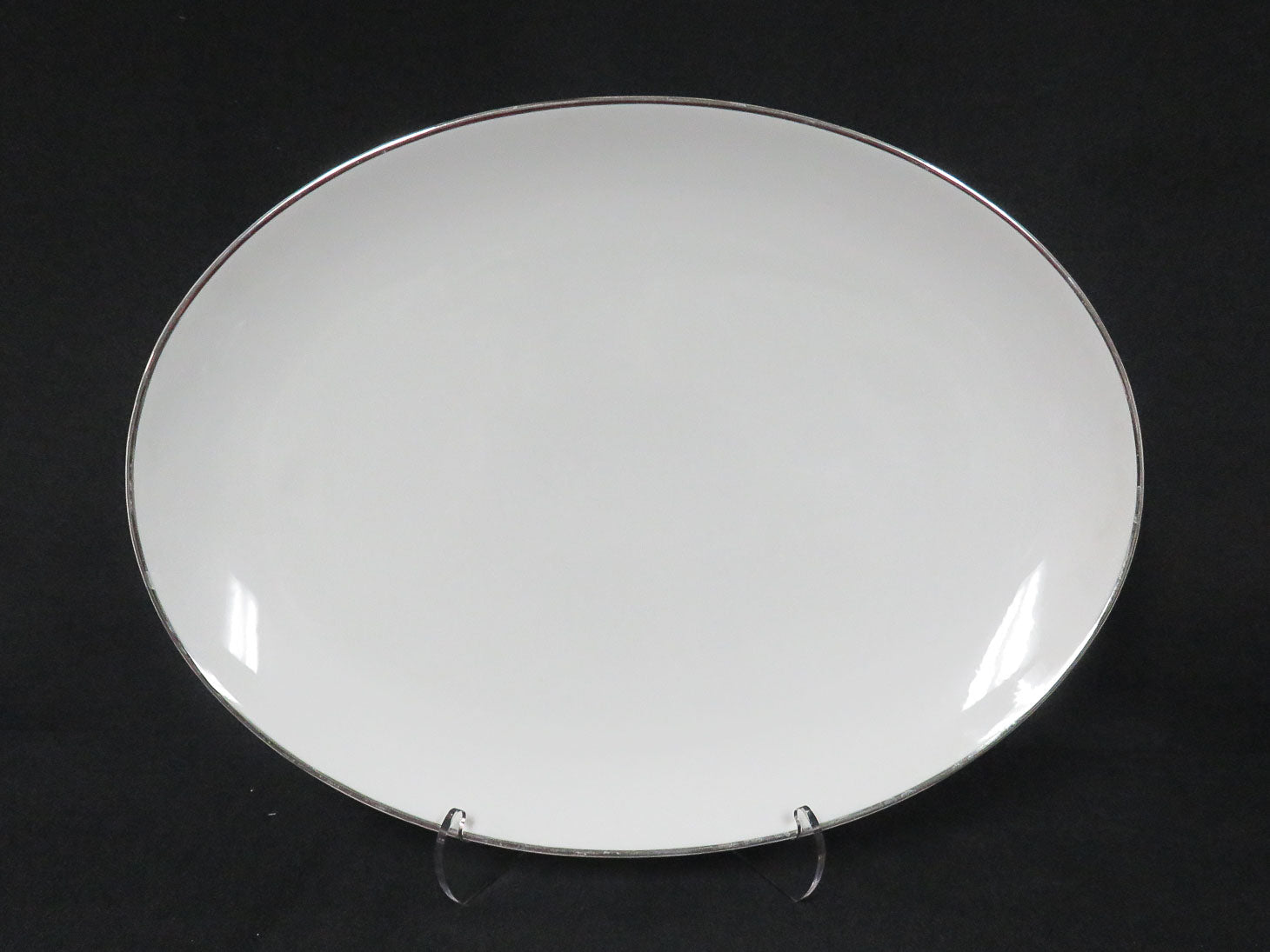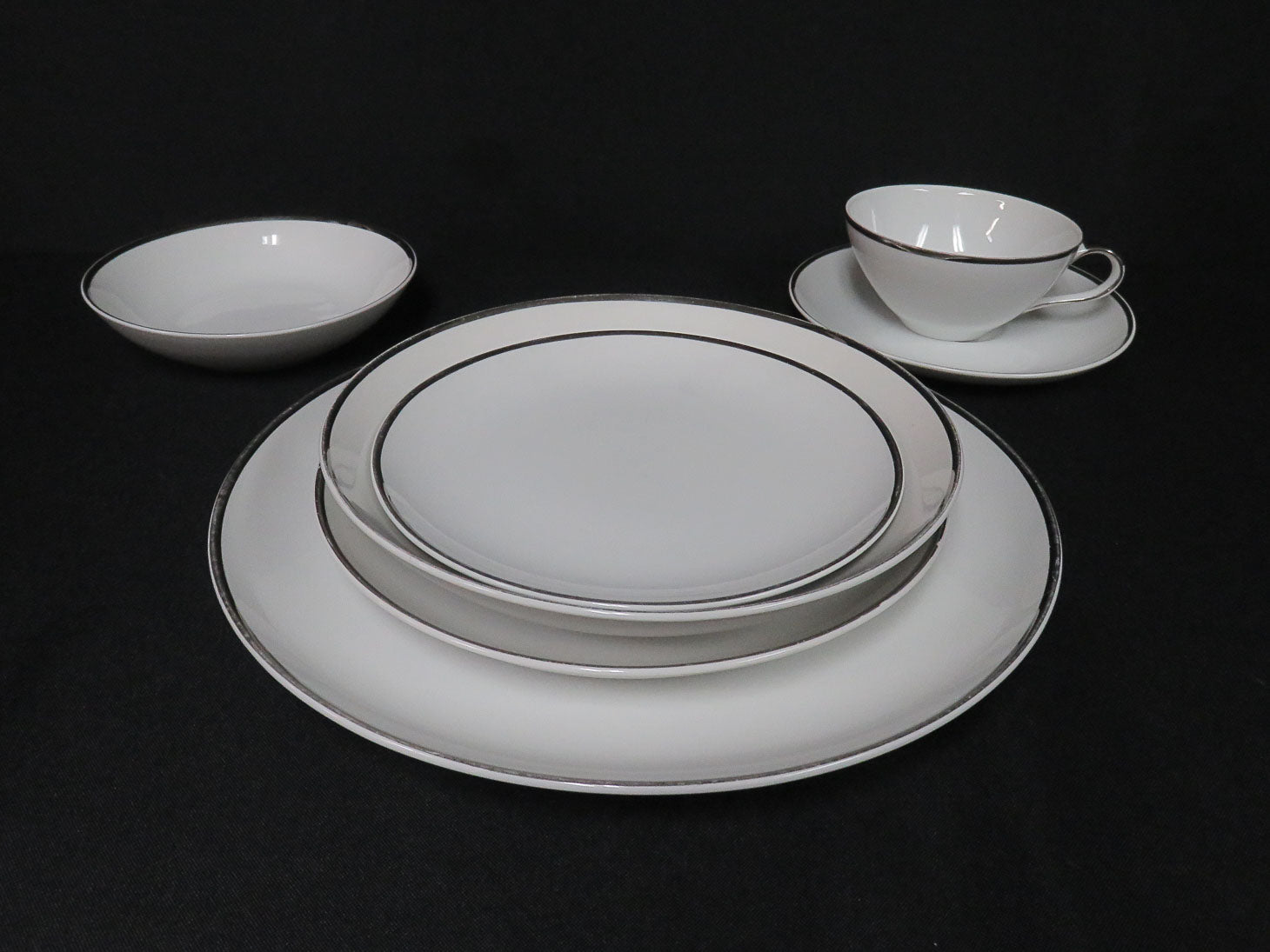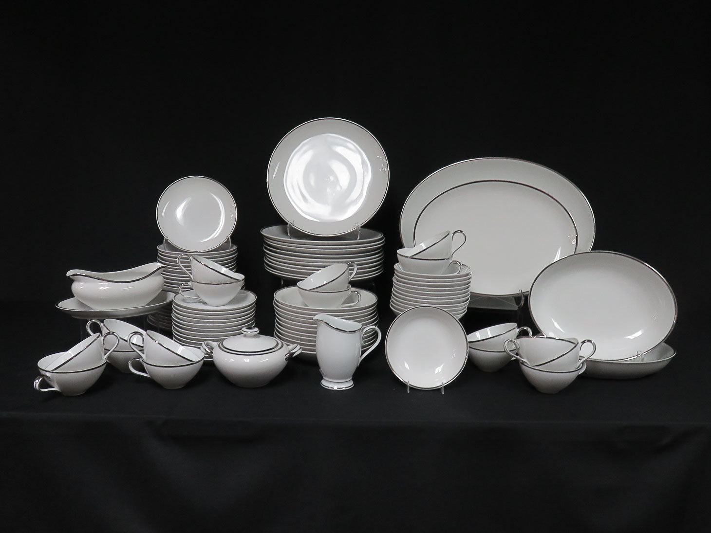 11, seven-piece place settings, white with silver trim with 7 serving pieces, 10 cream soup