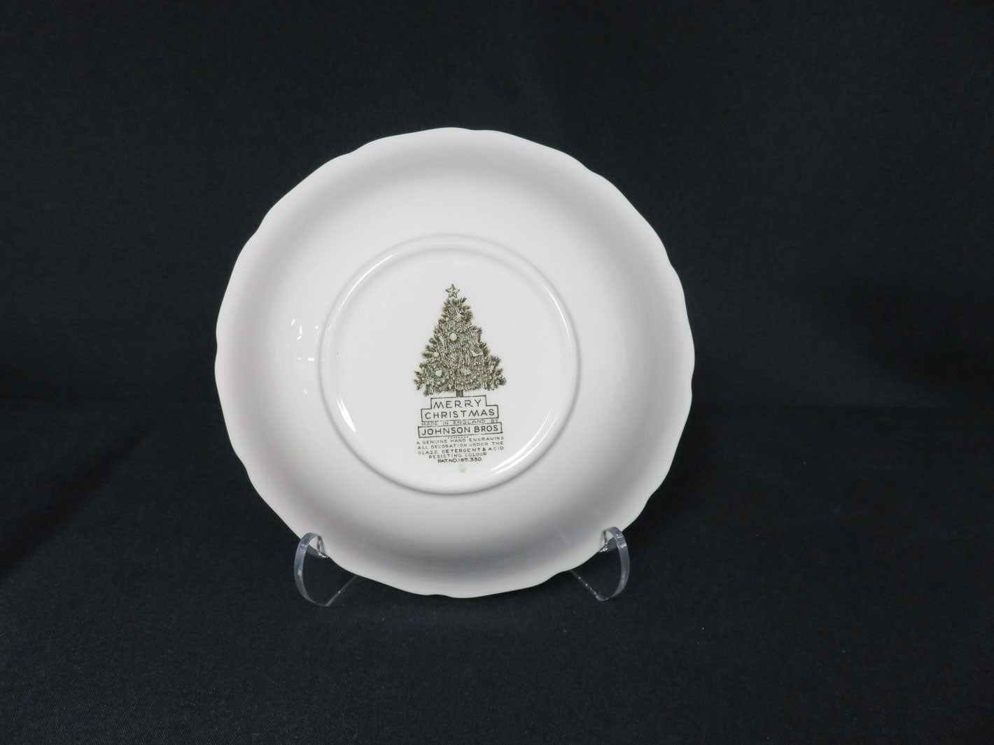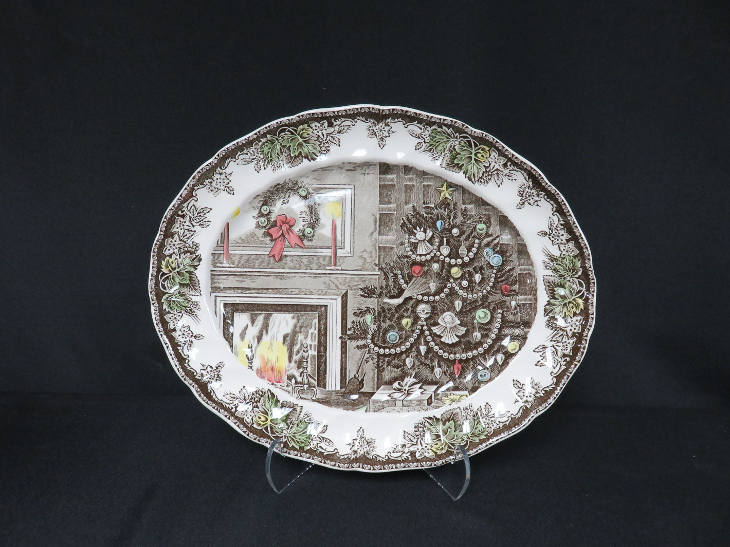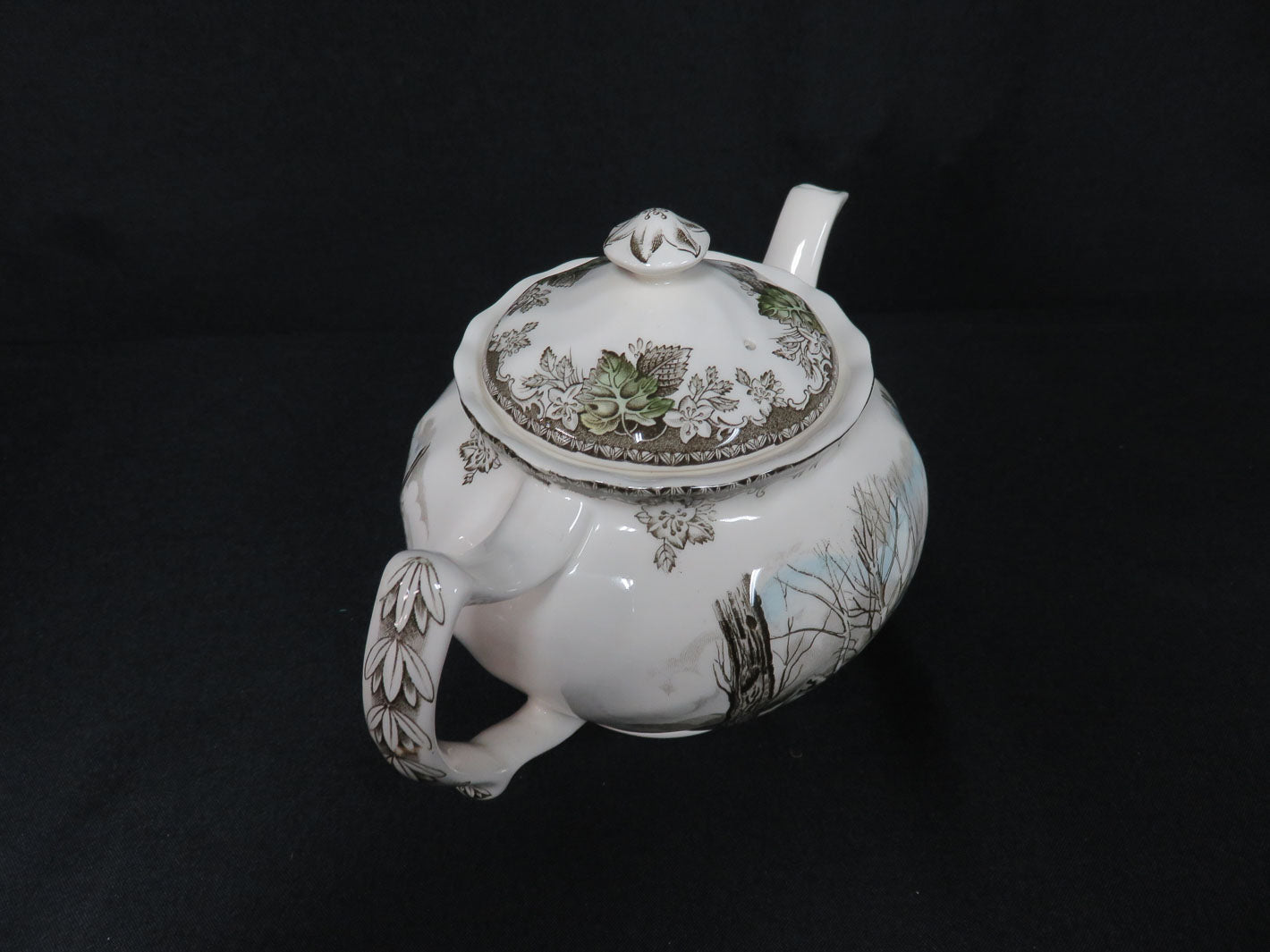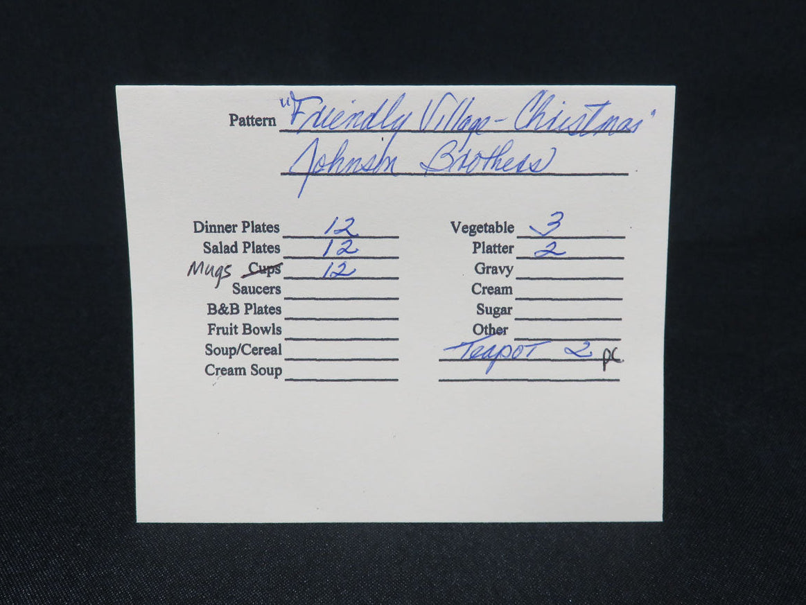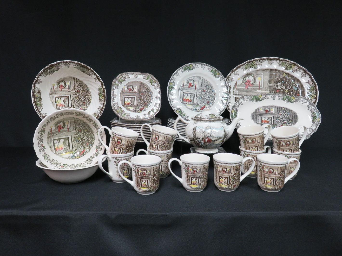 12 3-piece place settings and 5 serving pieces with Christmas fireplace scene. Teapot has covered bridge. Various marks on back.