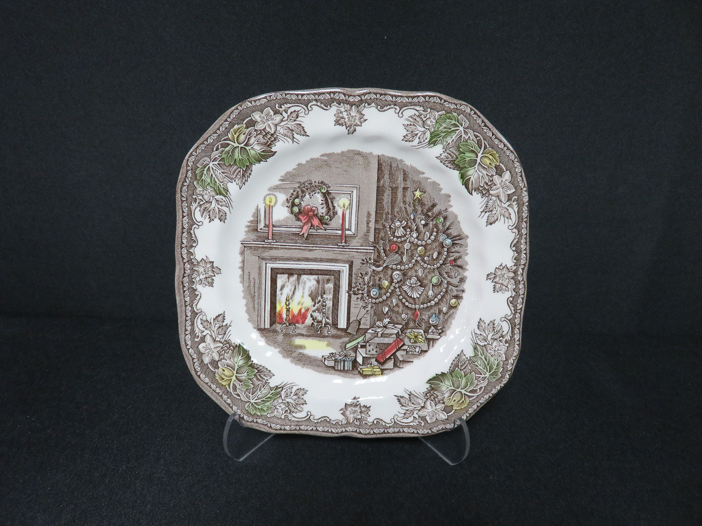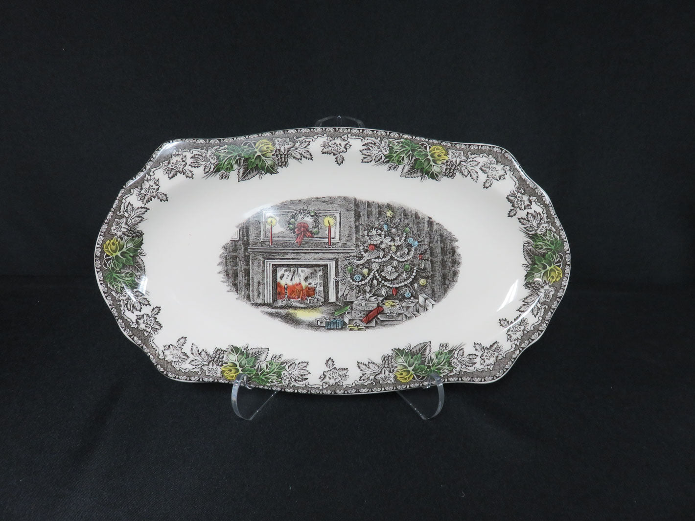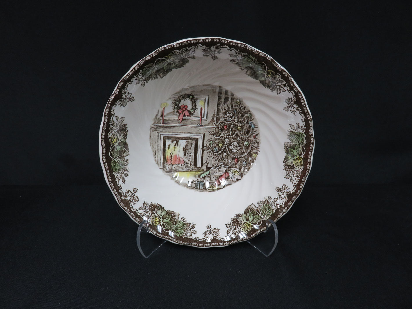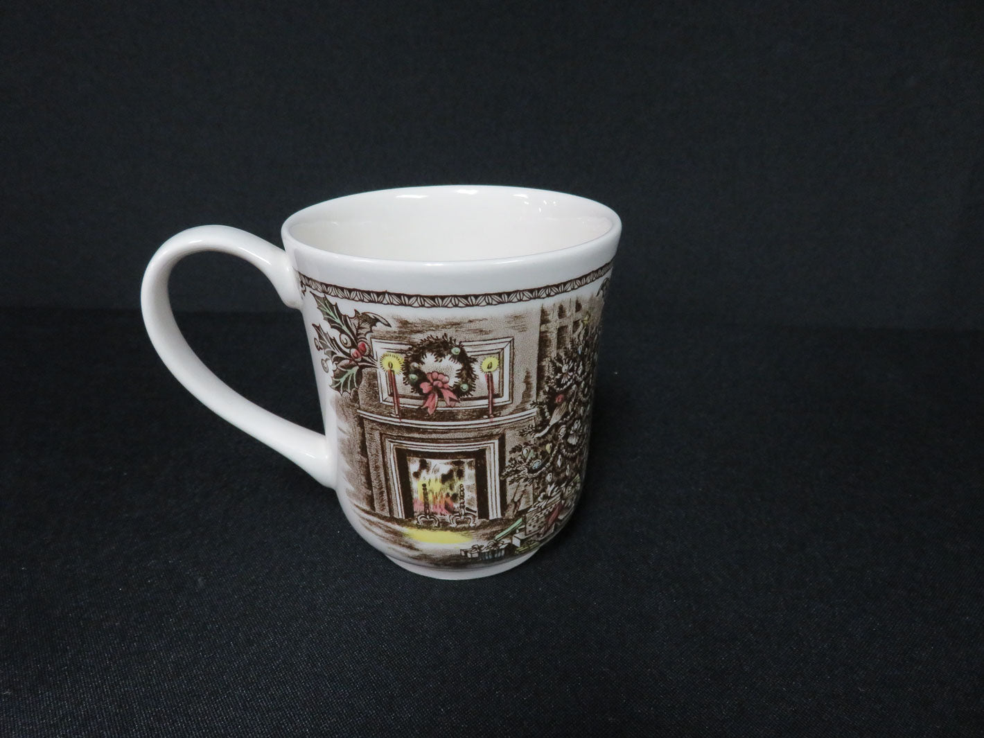 12 3-piece place settings and 5 serving pieces with Christmas fireplace scene. Teapot has covered bridge. Various marks on back.