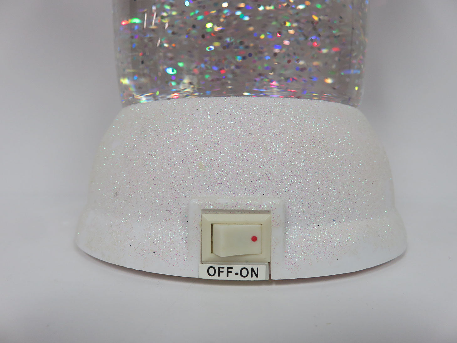 Acrylic snowman with changing color glitter snow globe body, red scarf, black hat. Uses 3AA batteries. 12" H