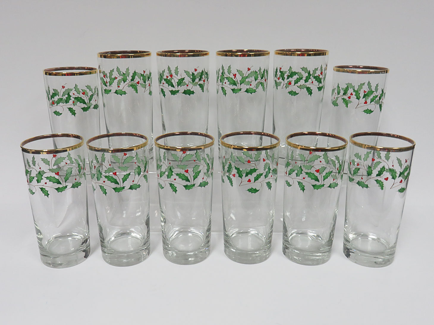 Set of 12, clear with holly and berry, gold rim