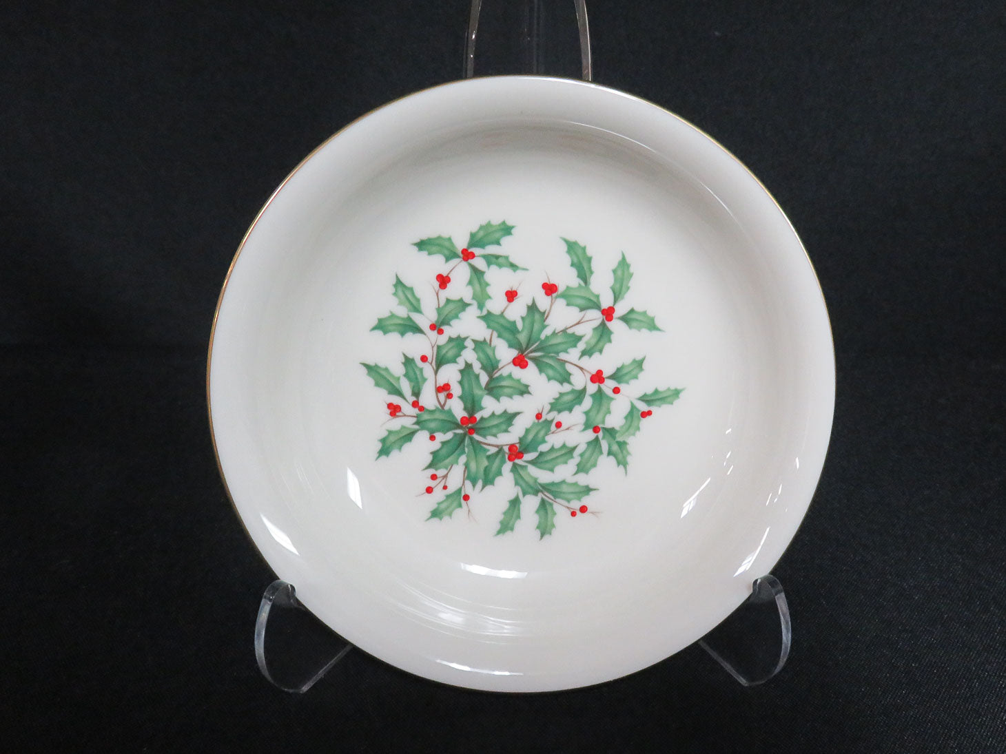 12 five-piece place settings, ivory with gold rim and holly and berry cluster in center.
