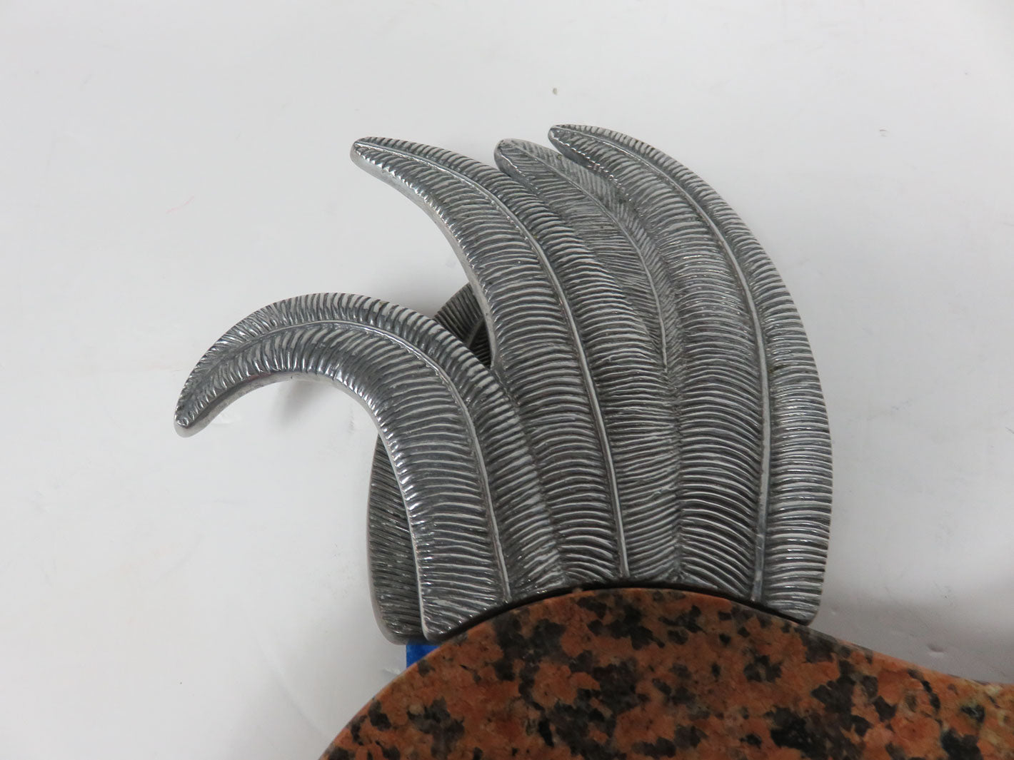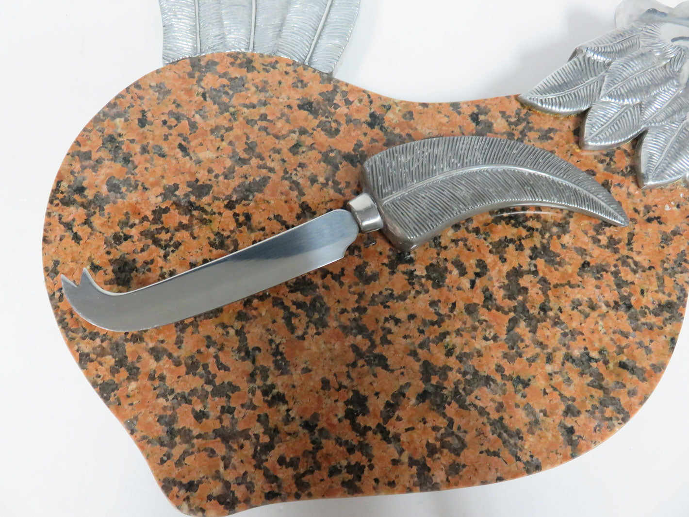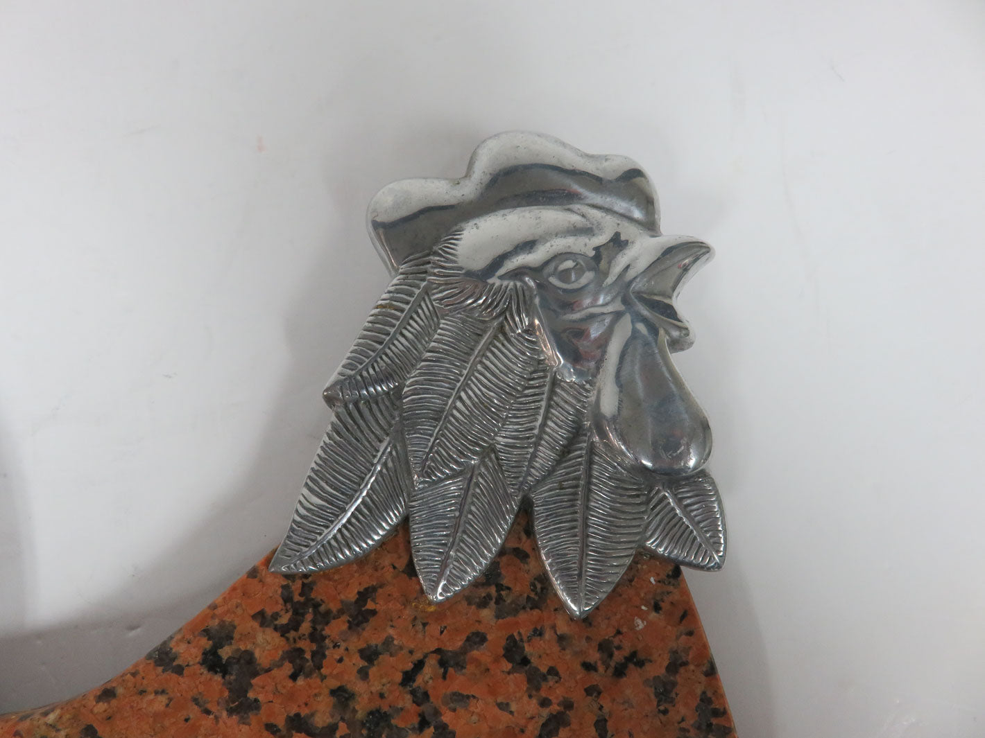 Brown speckled board with metal rooster and knife holder