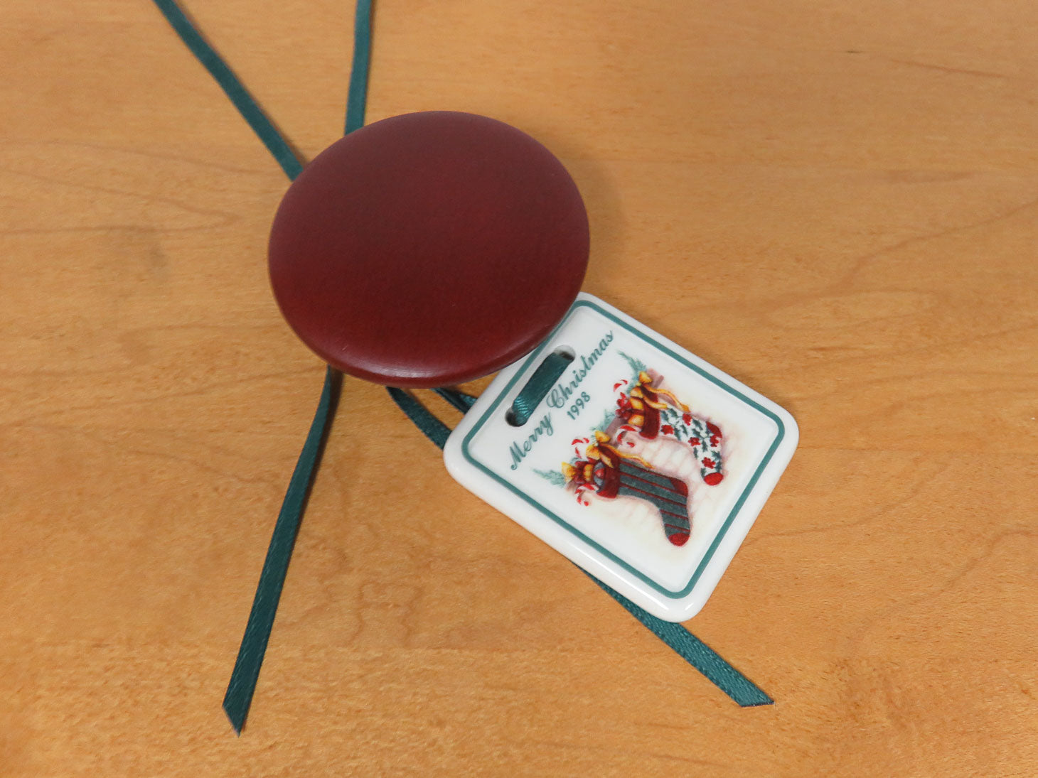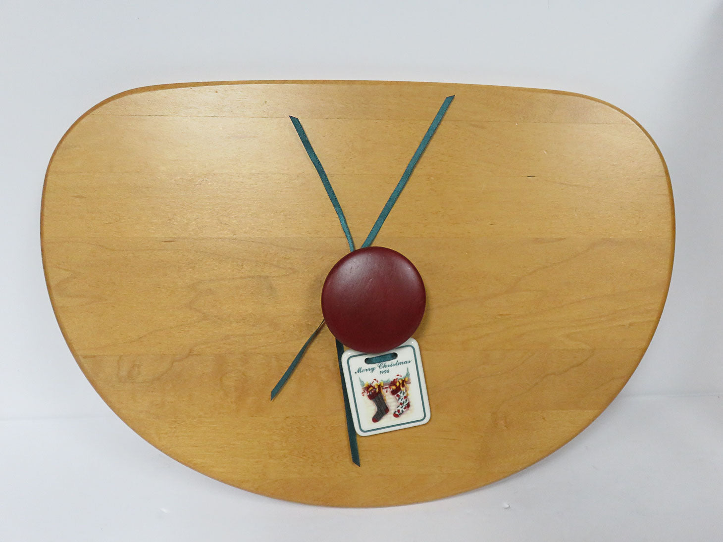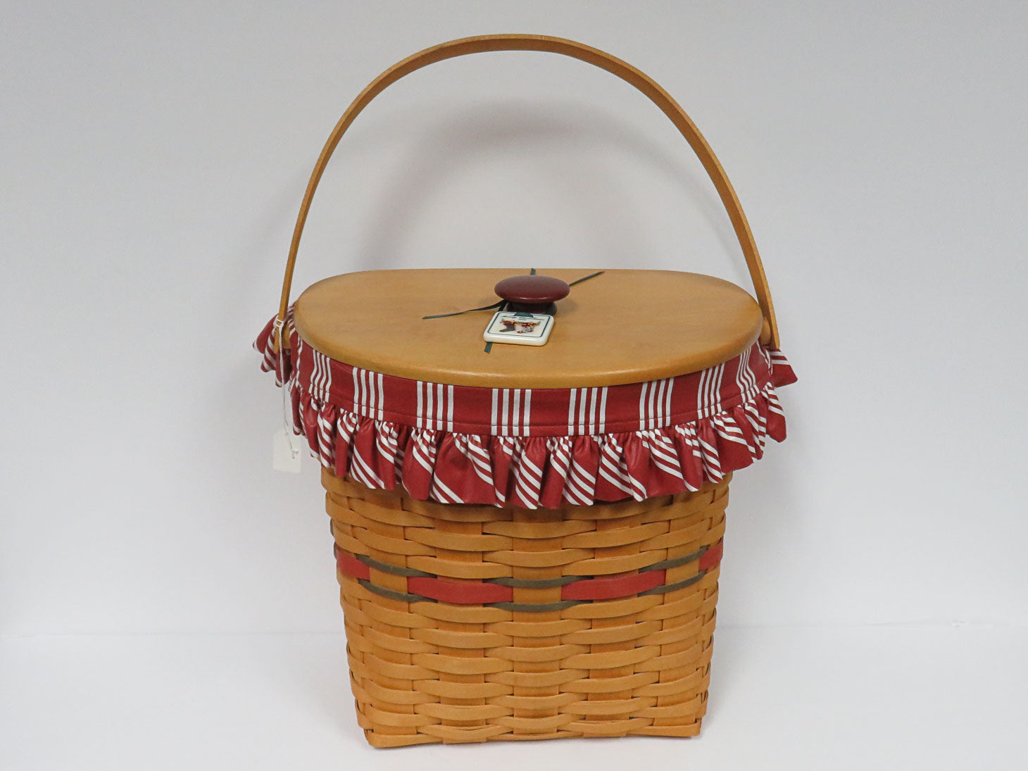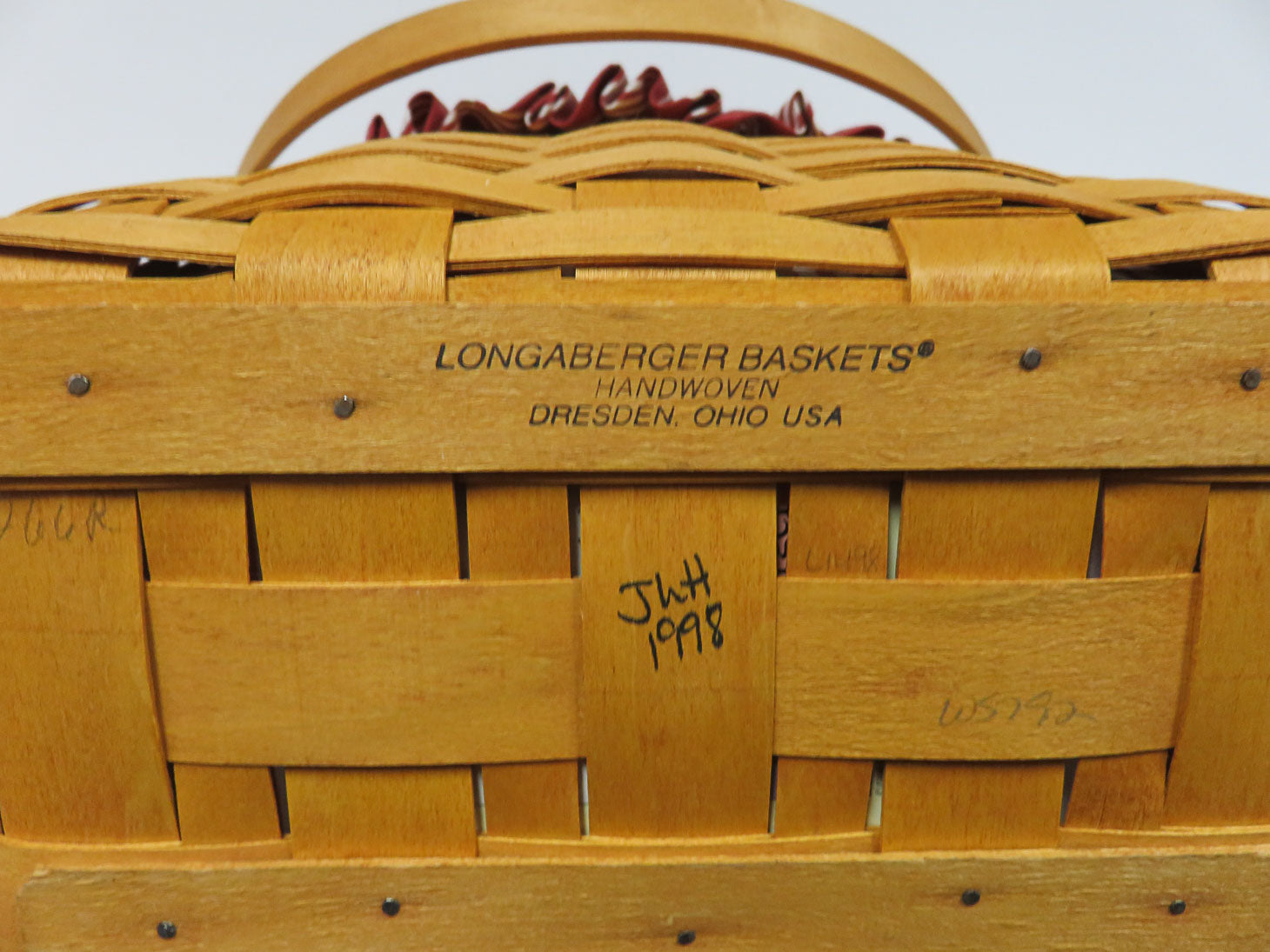 "Merry Christmas 1998" tan with red and green band, red and white liner, plastic insert, can be hung, 5 pc 12.5" x 8.5" x 12.25"