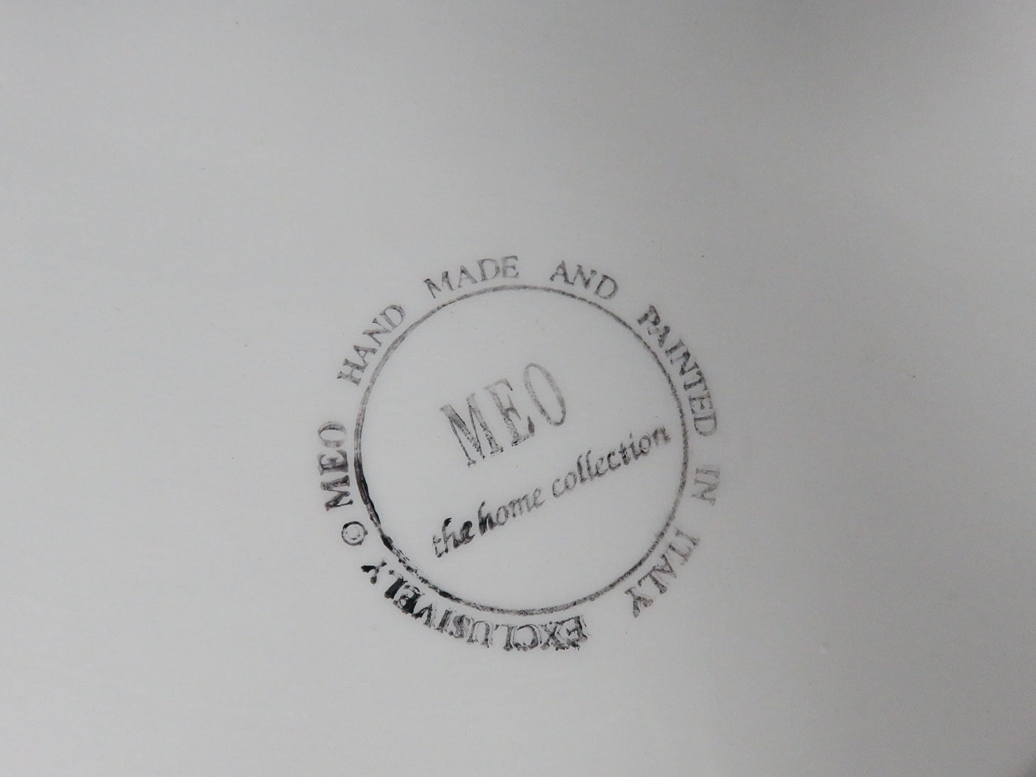 Hand made and painted, white with green brush strokes, holly leaves and berries, attached bowl, gold trim