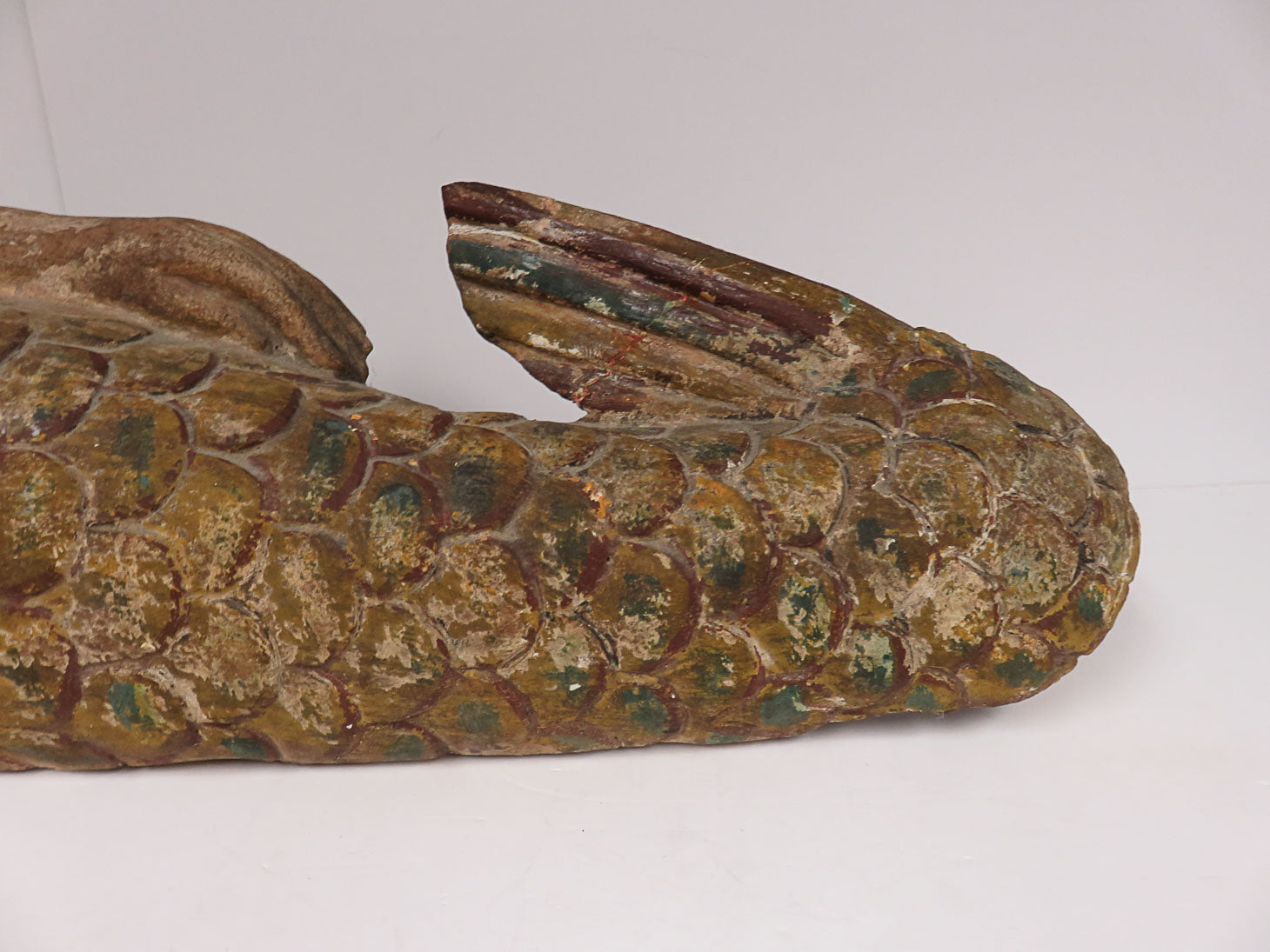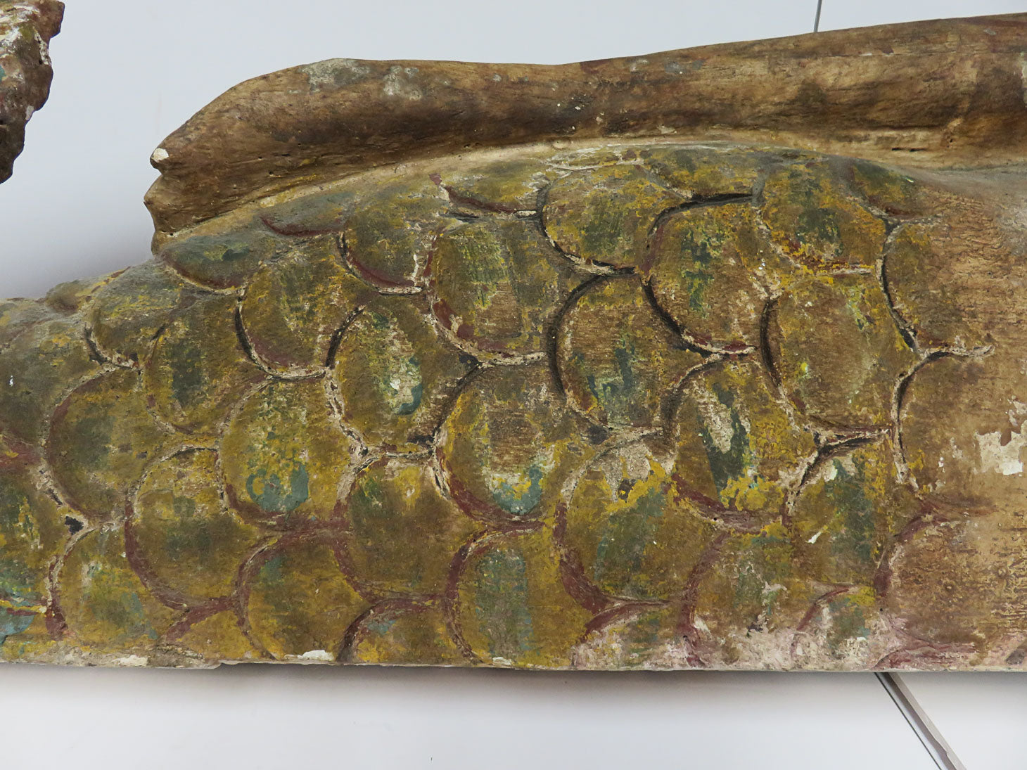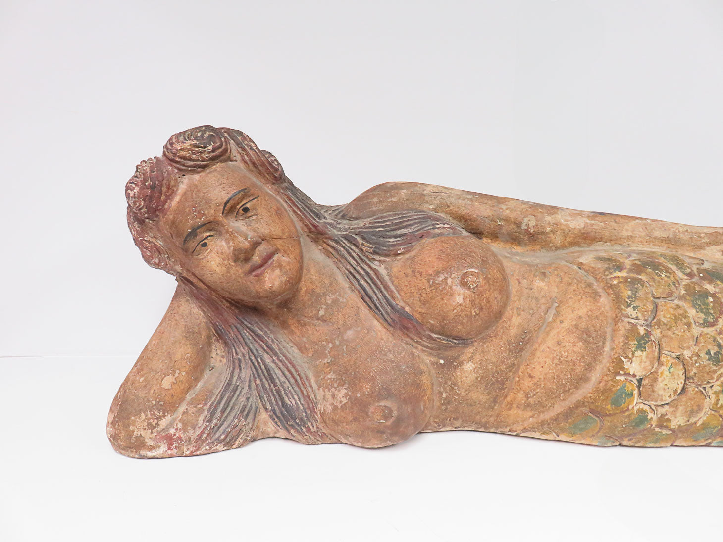 Item Number: 29529-19 Hand painted with distressed folk art finish. Mermaid leaning on her arm has small chips and cracks. 47.5"W x 6"D x 14"H