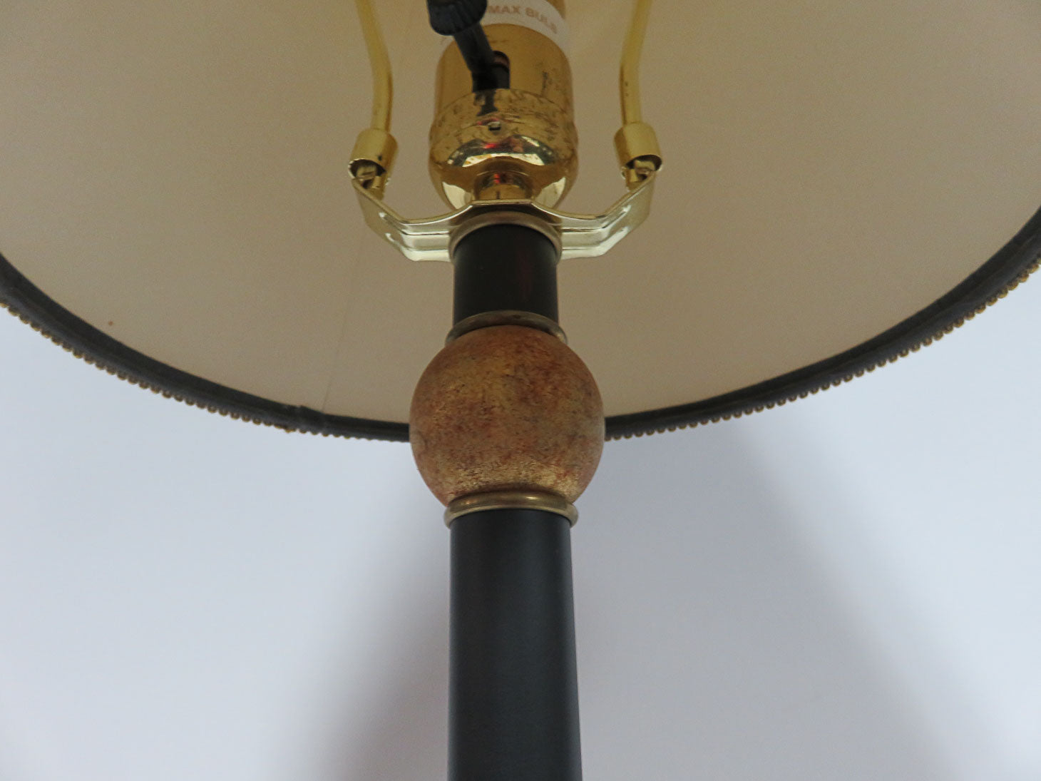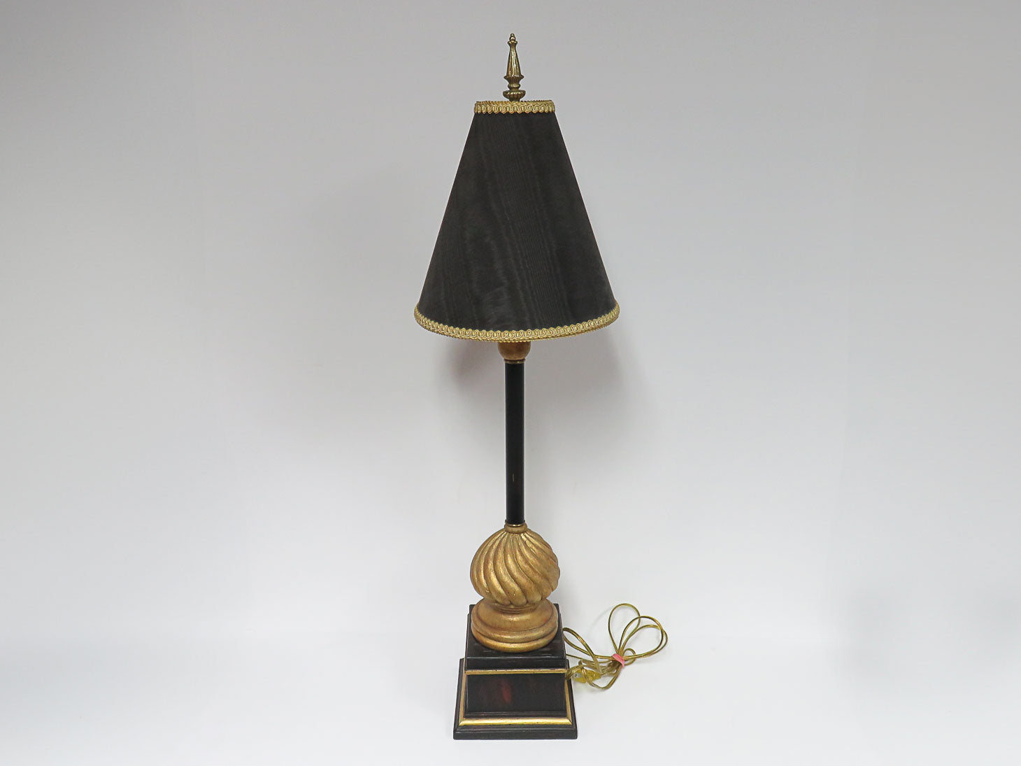 Brown wood square base, gold accents, gold swirl globe on column, brown shade with gold-brocade trim