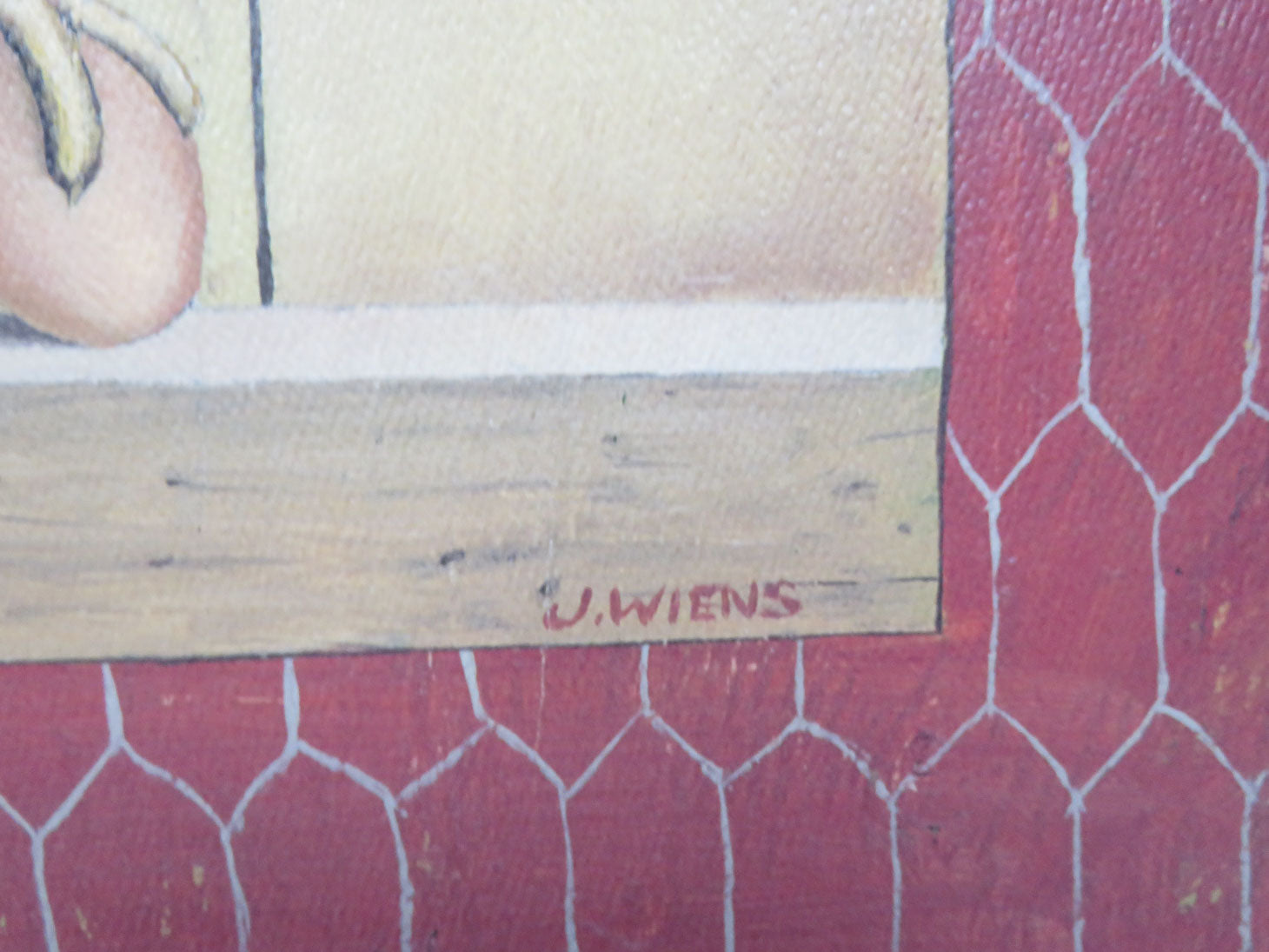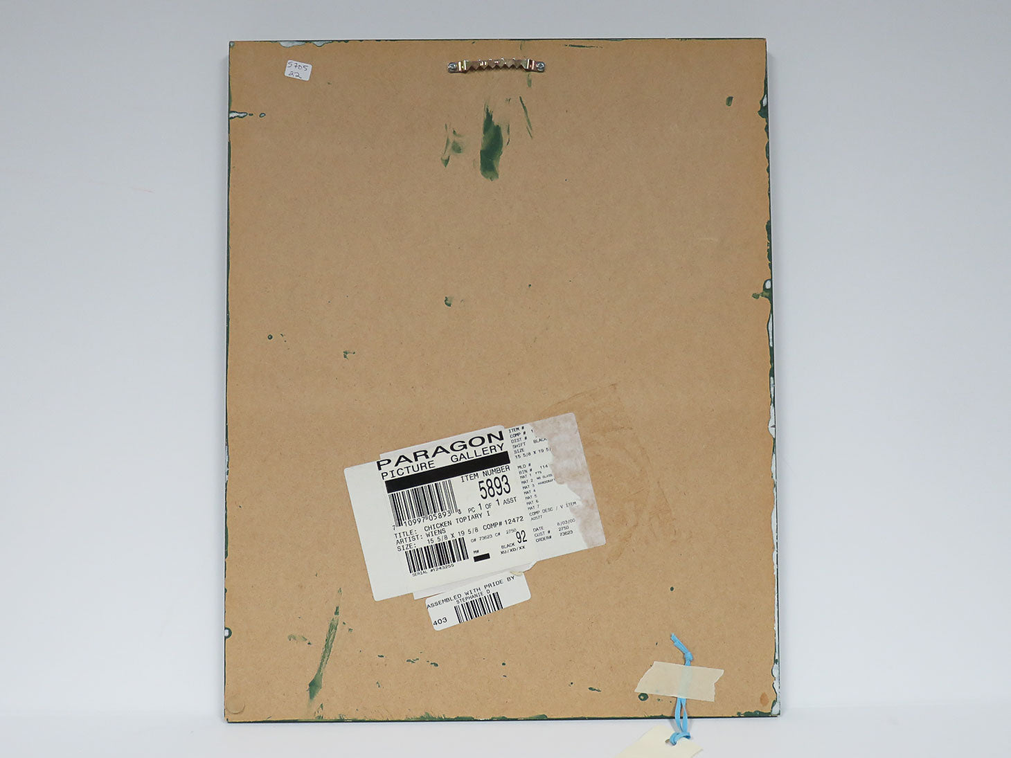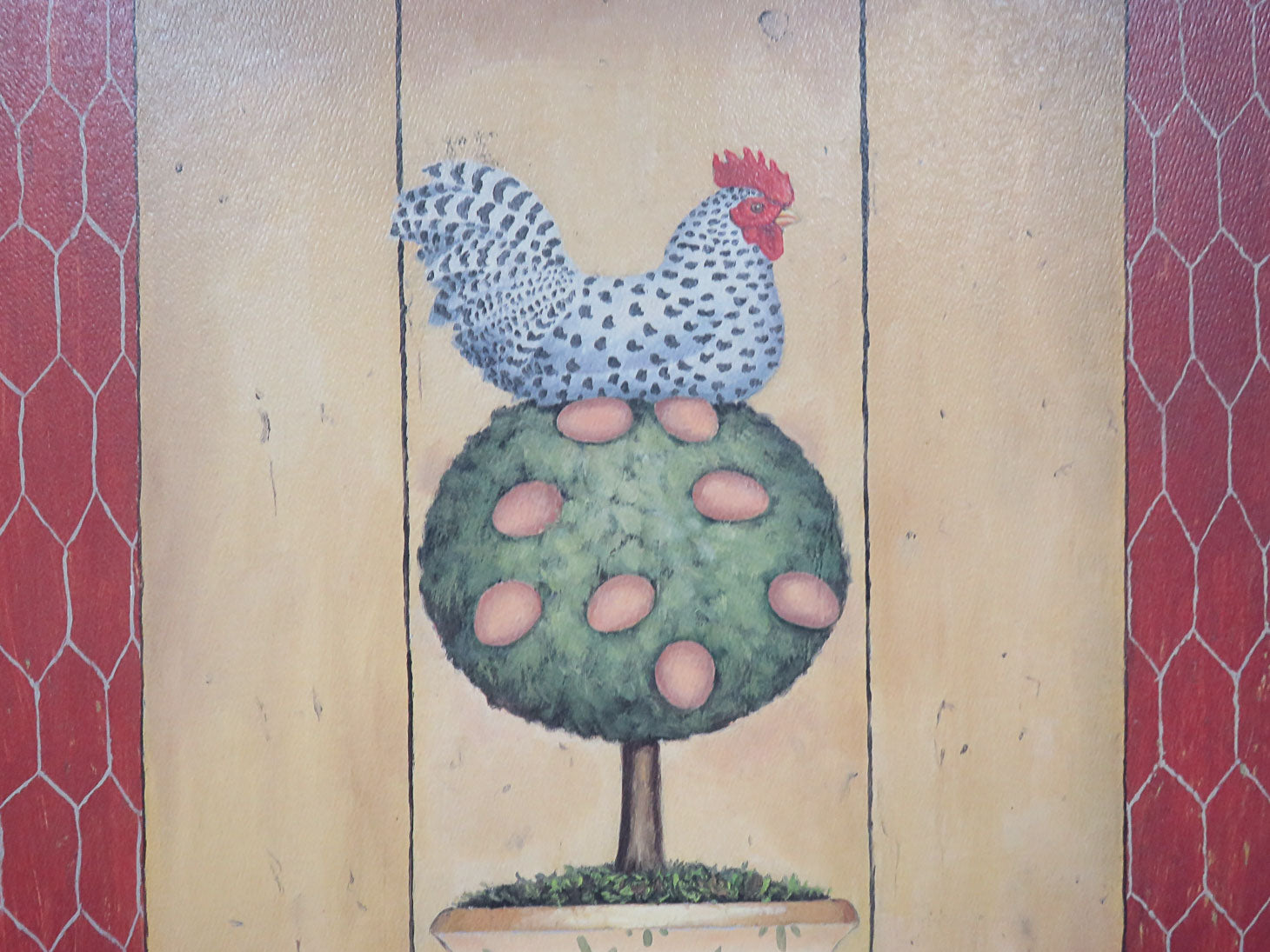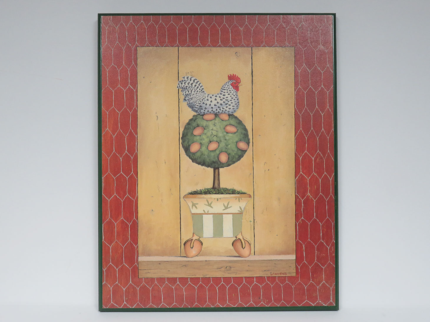 Rectangular, painted green tree topiary with eggs and, hen, J. Wiens