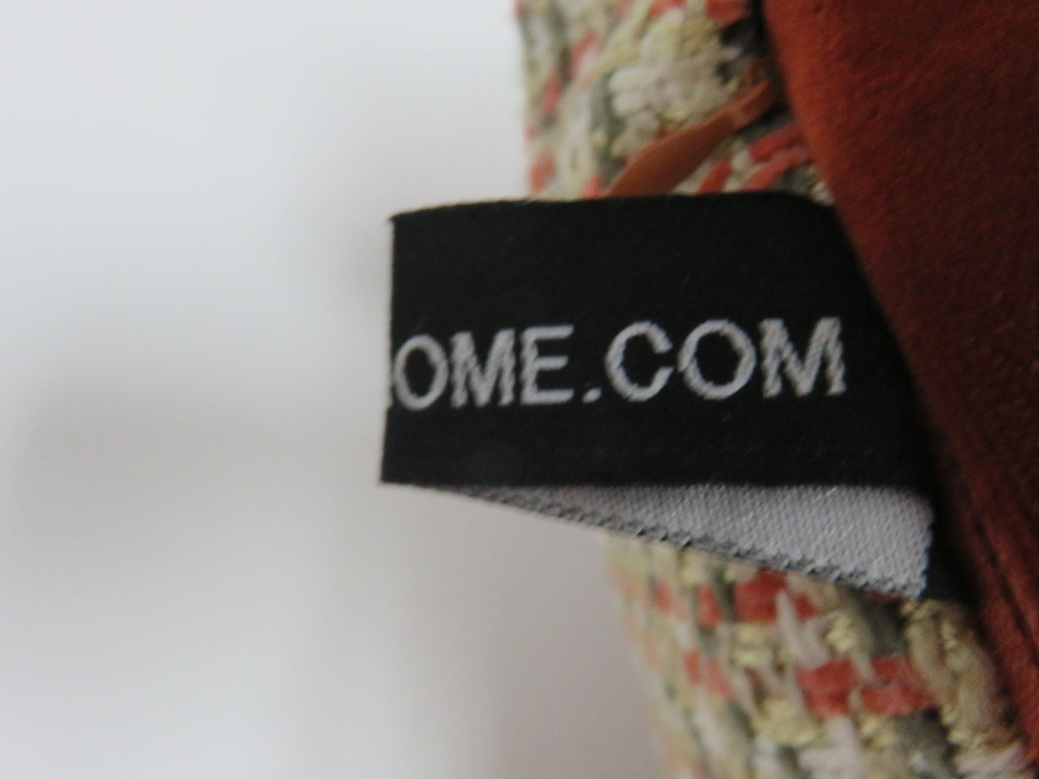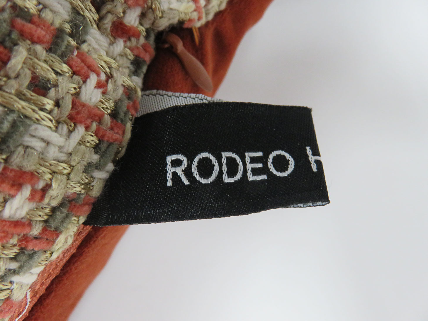Tweed, green, rust, gold and white with zipper, brushed rust velvet backing, and feather insert.
