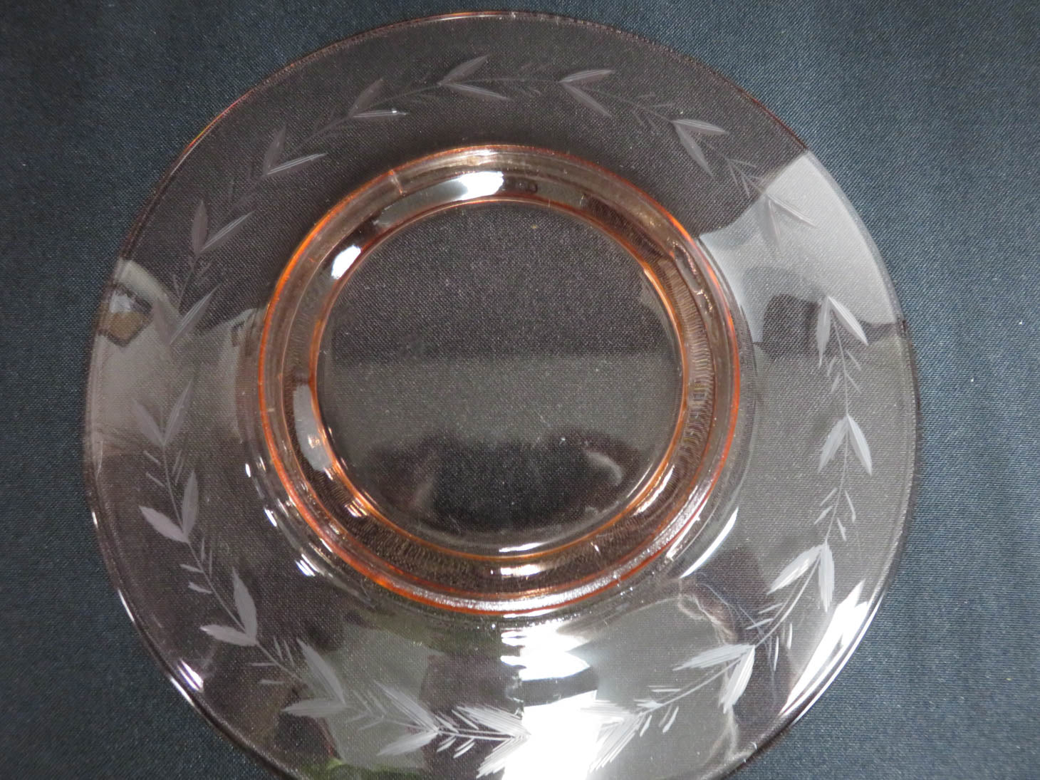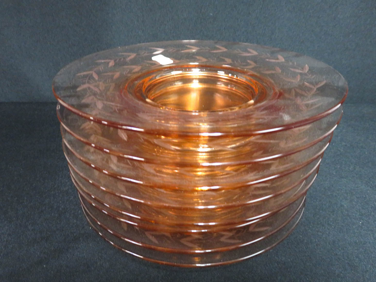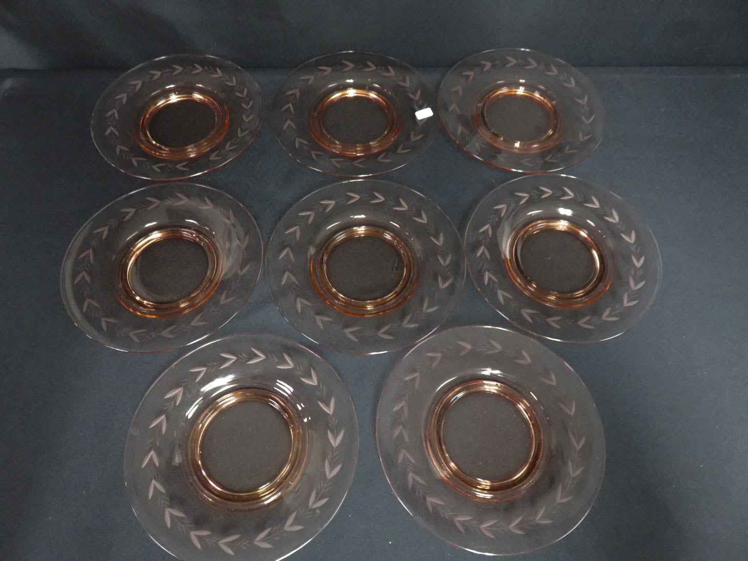 Set of 8, Etched leaf pattern on rim, rose-pink.