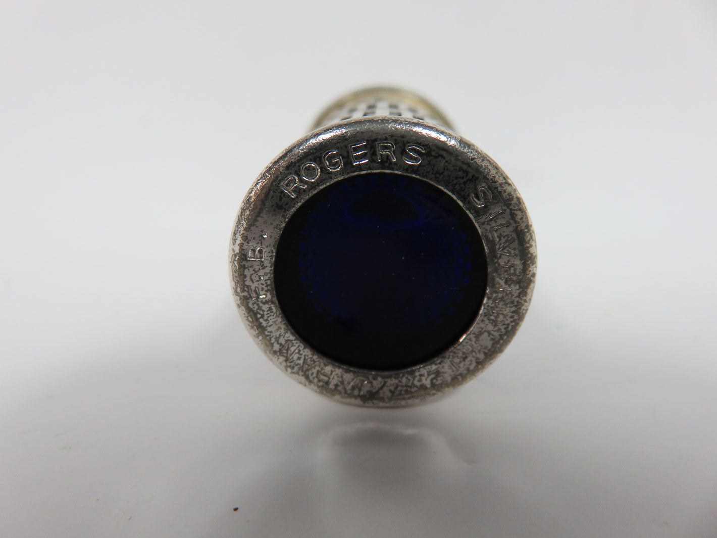 Two sets of cobalt blue glass interior, silverplated lattice pattern overlay.
